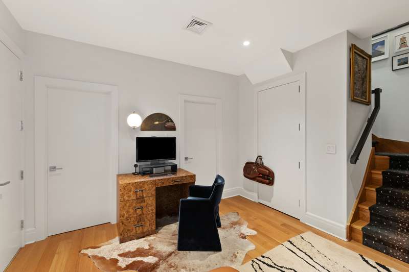 A dramatic staircase with bespoke lighting separates the bedrooms of this home. As you descend to the lower level, you will find a spacious landing that offers itself as the perfect home office or media room. This area features high ceilings a large walk-in closet, in unit laundry and storage. Also on this level is beautifully appointed marble bathroom that accompanies the primary bedroom and secondary bedroom.