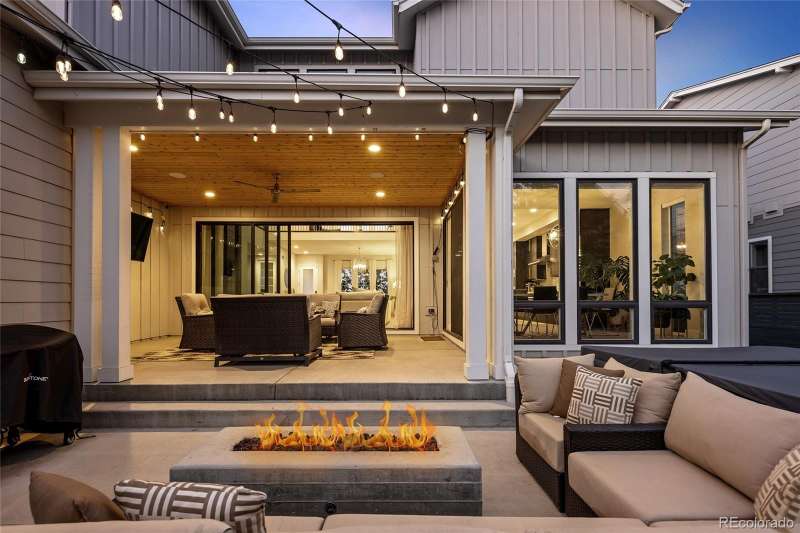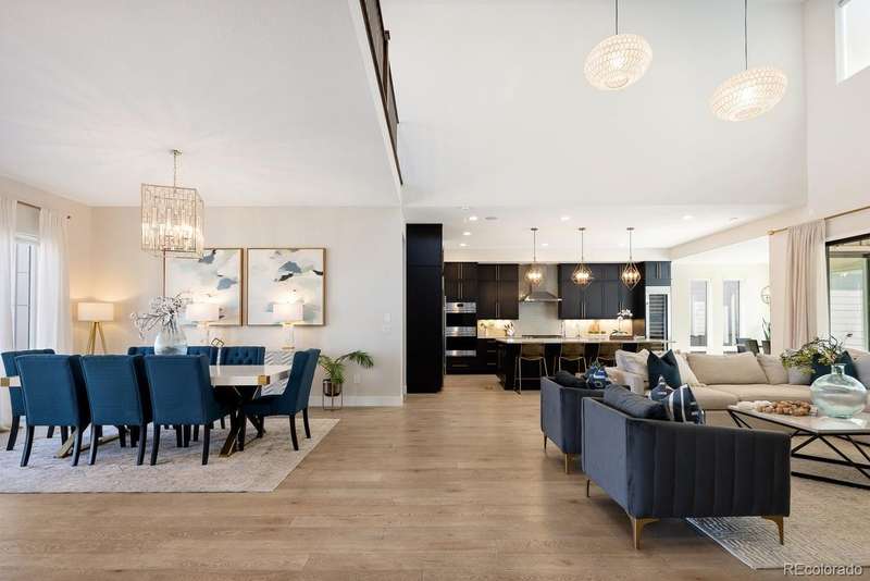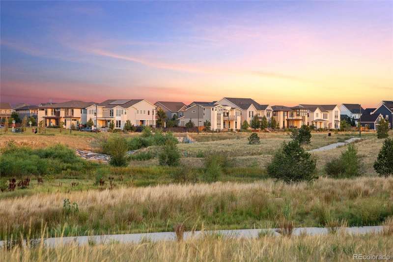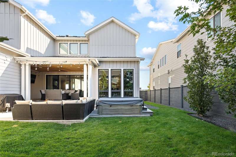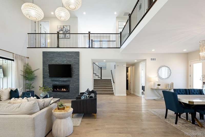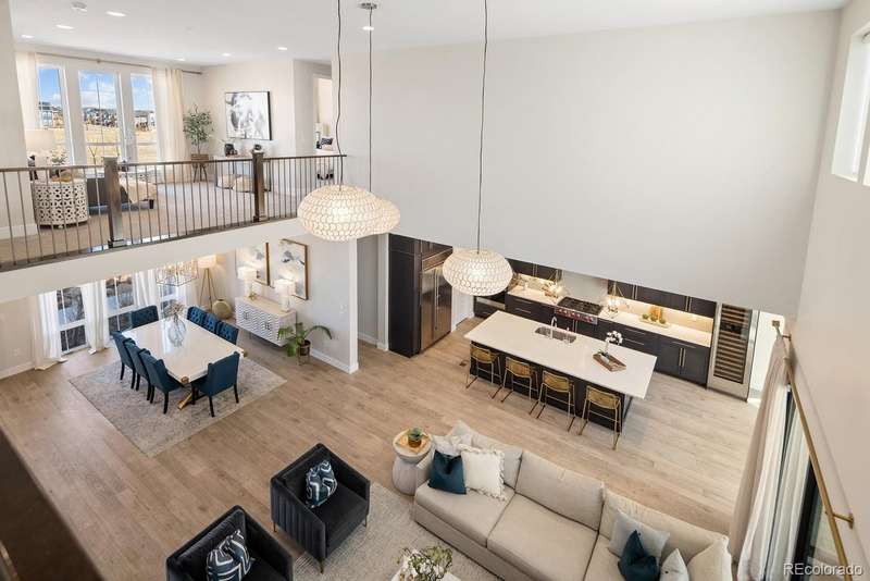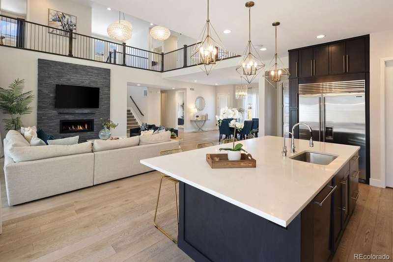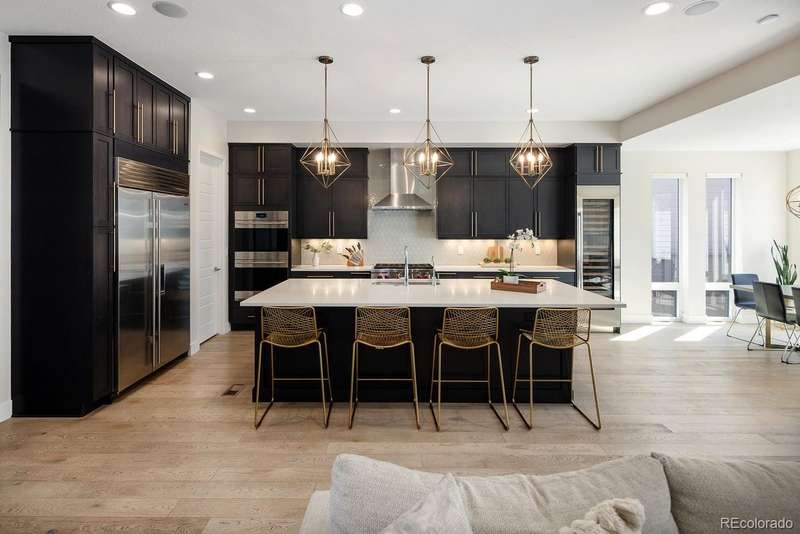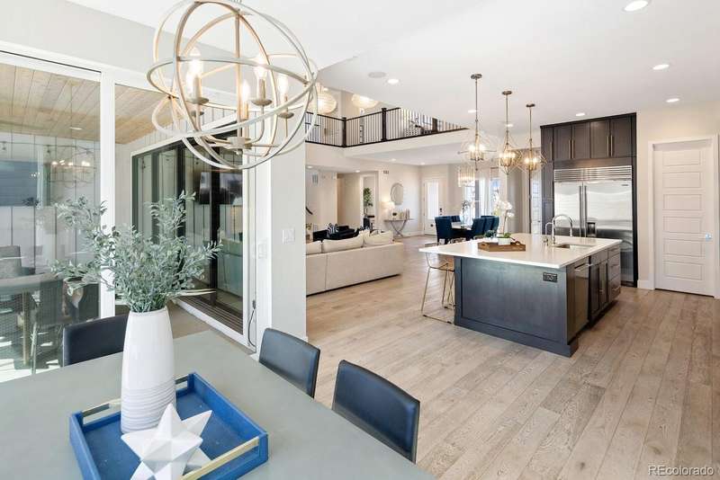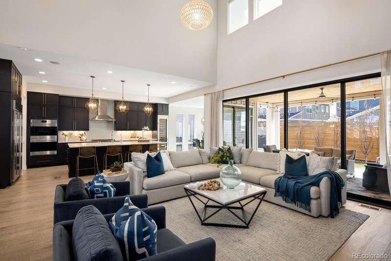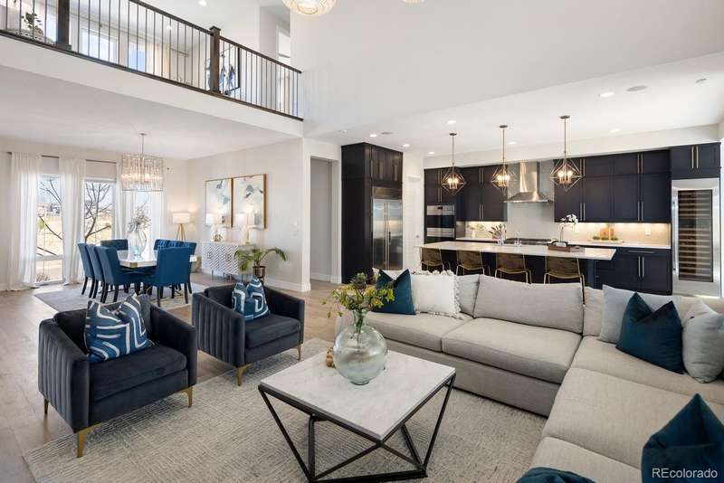 THE ONLY INFINITY LUXE EDITION ON THE MARKET RIGHT NOW! This stunning home redefines luxury living with direct access to lush parks and open space across the street. Designed for elegance and comfort, the expansive open floor plan is enhanced by soaring 25-foot ceilings, Capiz shell chandeliers, and floor-to-ceiling windows that flood the space with natural light. The main floor features exquisite grey oak hardwoods, remote-control blinds, in-wall speakers, and designer lighting. The gourmet kitchen is a masterpiece, boasting an expansive marbled quartz island, sleek black cabinetry with gold hardware, and top-tier appliances, including a built-in Sub-Zero refrigerator, a 120-bottle Sub-Zero wine column, a Wolf Range, and double ovens. A custom walk-in pantry and cozy breakfast nook complete this culinary dream. The living rooms slate ledger stone fireplace and four-panel slider seamlessly connect to the covered patio, while the elegant dining room and private office with French doors add to the homes versatility. A main-floor guest suite with an en-suite bath and a stylish powder room round out this level. Upstairs, a spacious loft offers serene park views. The luxurious primary suite features a spa-like 5-piece bath with Carrera marble, a Kohler soaking tub, a dual-head slate-tiled shower, and a custom walk-in closet with a central island. Three additional bedrooms include an en-suite and a Jack-and-Jill bath, while the upstairs laundry room enhances convenience. The finished basement is designed for entertainment, featuring a full wet bar/kitchen with high-end appliances, a great room, a dedicated gym, and a sixth bedroom with a spa-inspired steam shower. Outside, over $100K in landscaping creates a private oasis with a covered patio, firepit, and a Bullfrog AL9 hot tub, all surrounded by mature trees and accent lighting. Minutes from Anschutz Medical Campusideal for medical professionals seeking a quick commute!