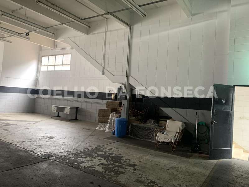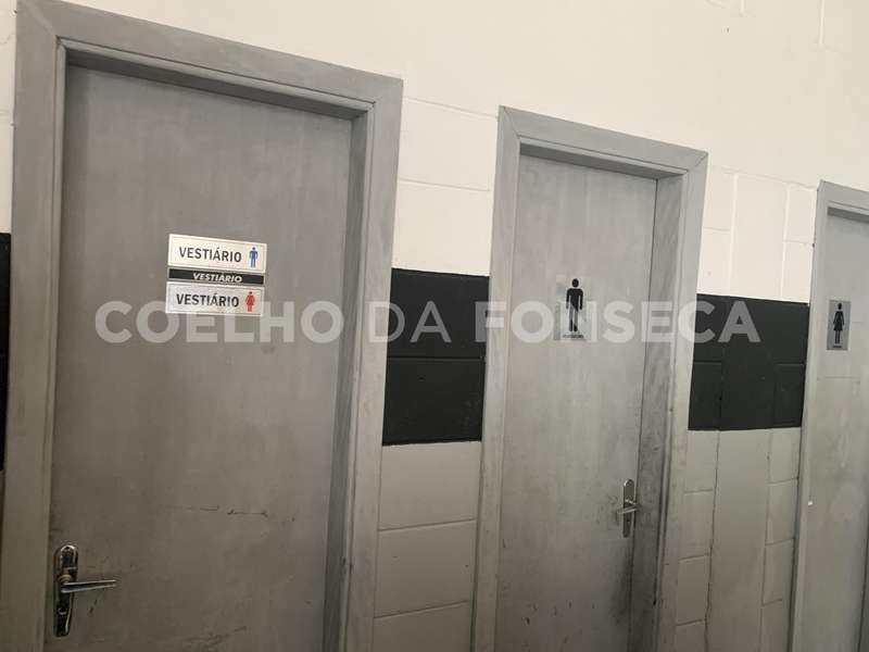 Galpão com a parte de embaixo coberta , pé direito alto e vestiários . Na parte de cima está localizada uma área aberta de escritório com banheiro feminino e masculino , cozinha e uma sala separada com banheiro privativo .