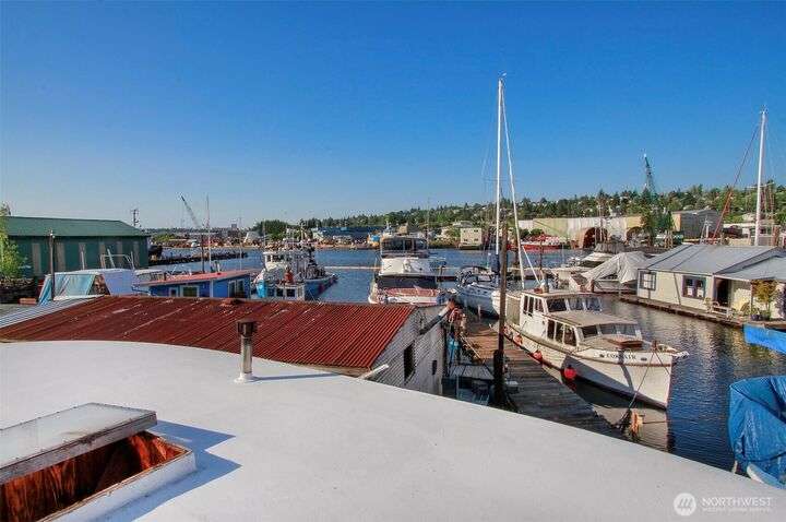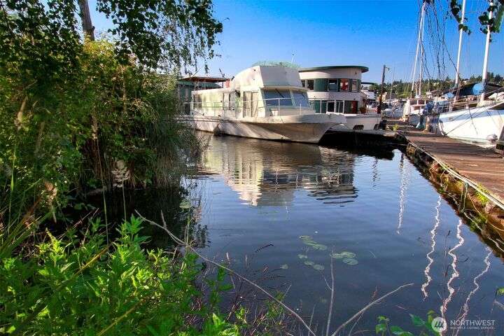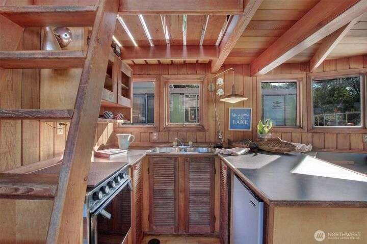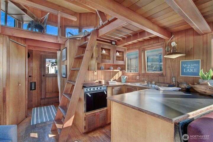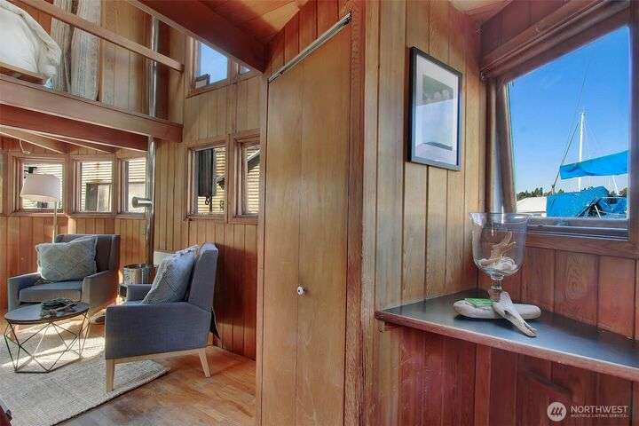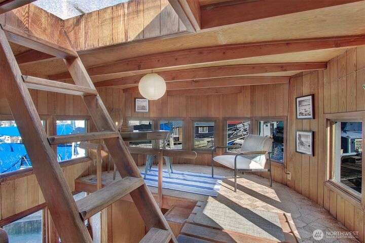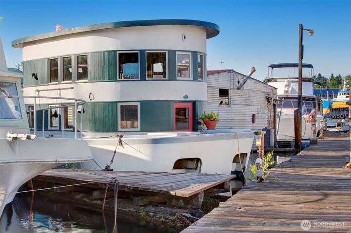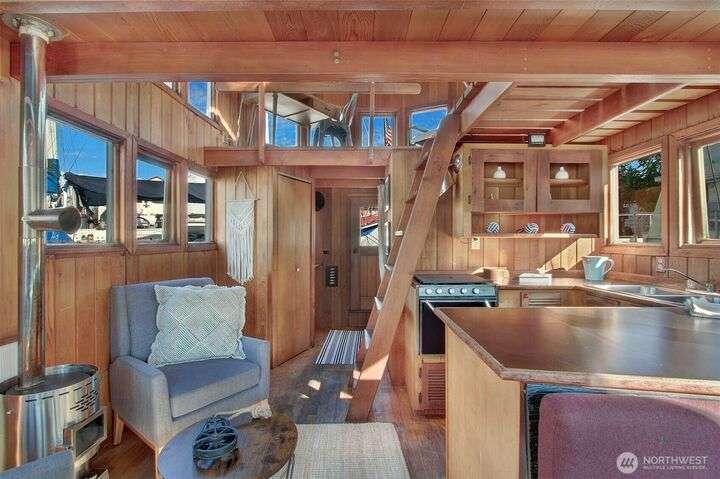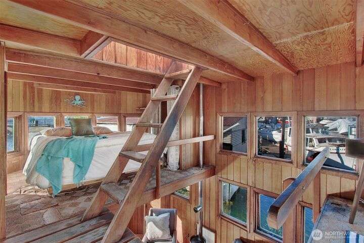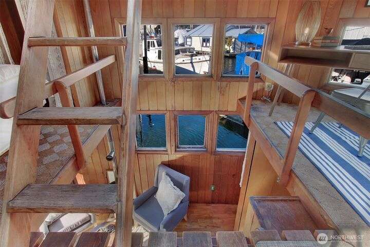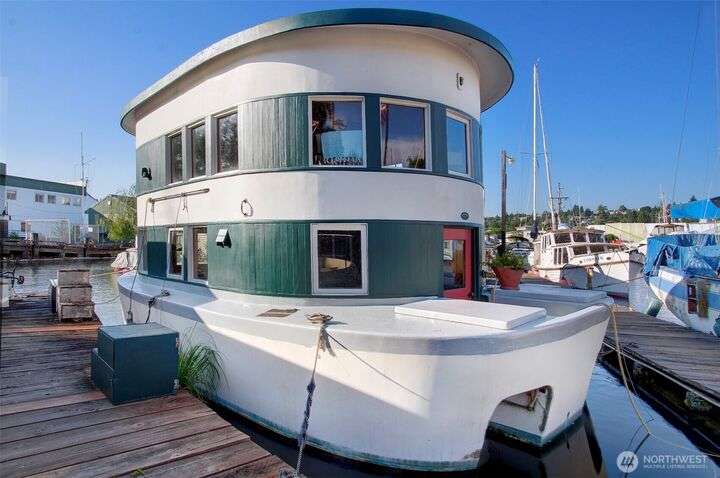 This sweet houseboat is your next adventure. She has originality and stands out from the rest. The cedar wood interior wraps 40 windows and the layout really packs a punch. The loft upstairs is private and cozy with space for an office too. A hatch takes you to the flat roof top where the view is awesome. New on demand water heater. She measures 30x14 and she's happily been in the same slip for 20 years at Ewing Marina, situated along the Ship Canal Path which is a quiet commuting trail leads you from Ballard to Lake Union. A recent haul out March '24 was completed where she was painted and inspected. The FOWR plaque grandfathers her into the houseboat community. Live simply. Enjoy nature. Live on a houseboat!