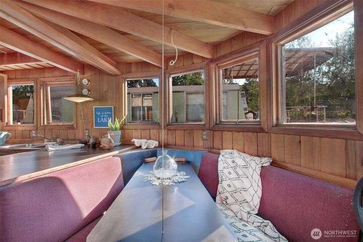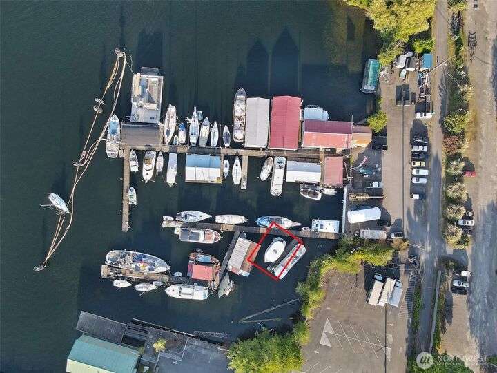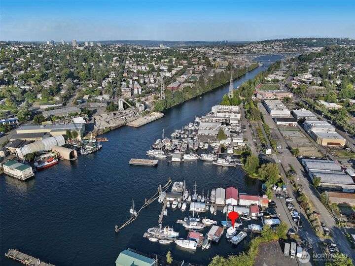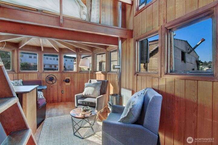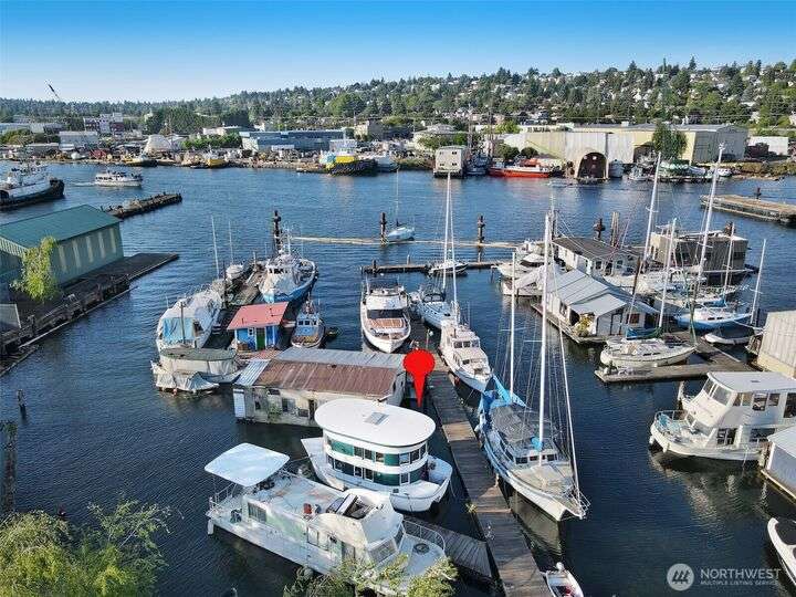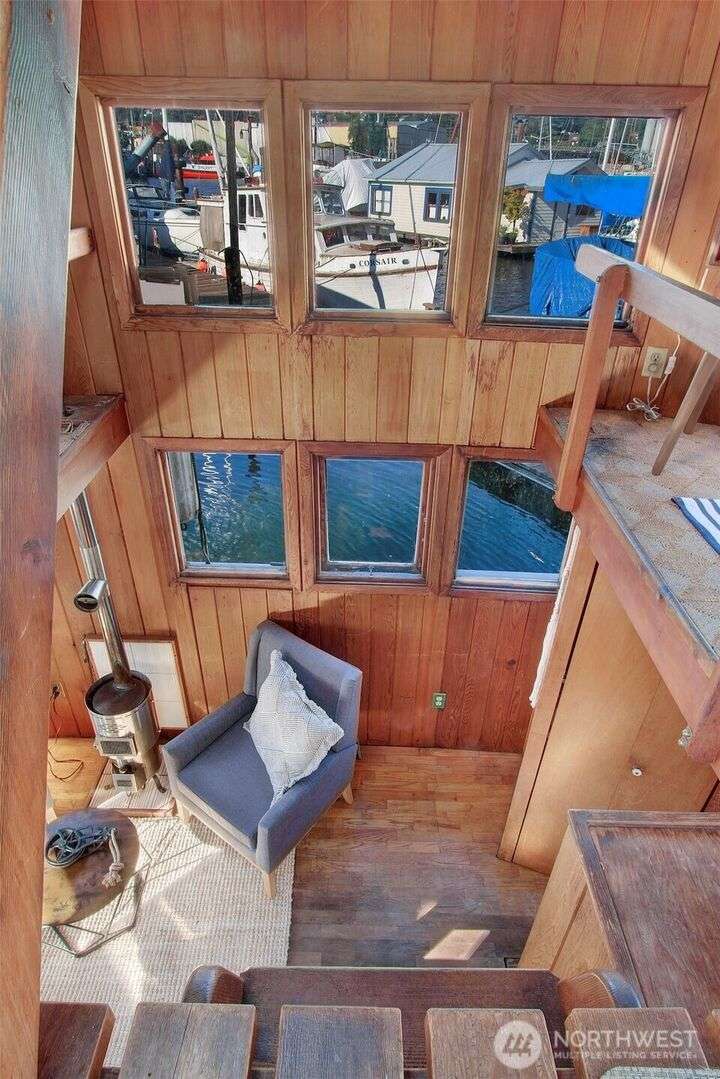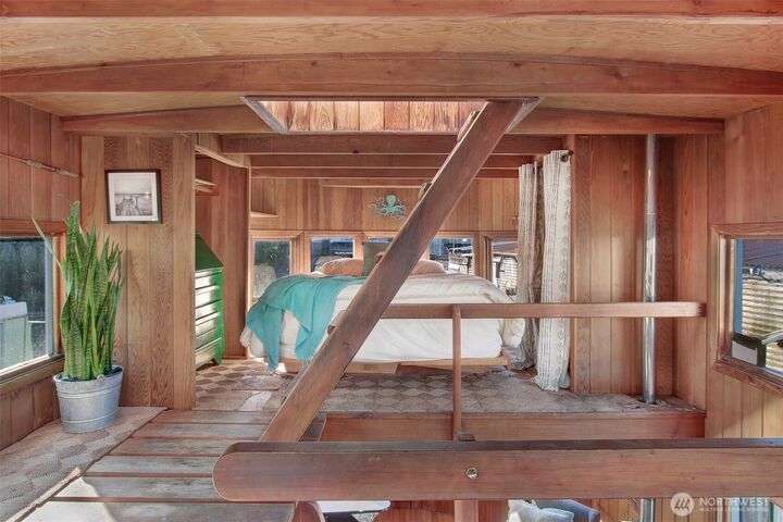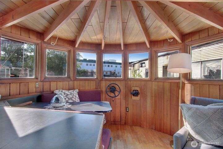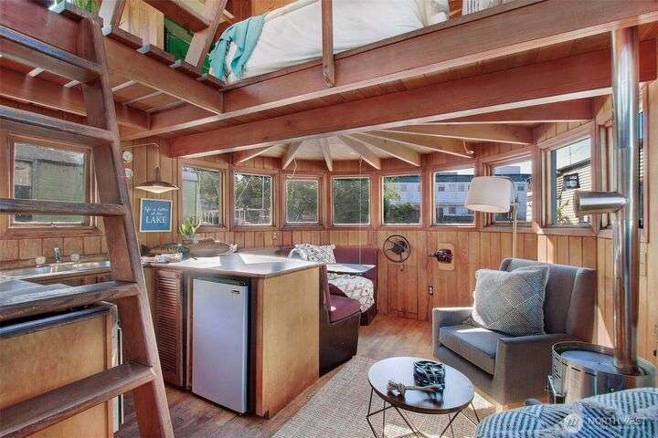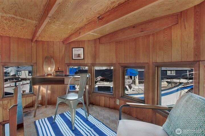 This sweet houseboat is your next adventure. She has originality and stands out from the rest. The cedar wood interior wraps 40 windows and the layout really packs a punch. The loft upstairs is private and cozy with space for an office too. A hatch takes you to the flat roof top where the view is awesome. New on demand water heater. She measures 30x14 and she's happily been in the same slip for 20 years at Ewing Marina, situated along the Ship Canal Path which is a quiet commuting trail leads you from Ballard to Lake Union. A recent haul out March '24 was completed where she was painted and inspected. The FOWR plaque grandfathers her into the houseboat community. Live simply. Enjoy nature. Live on a houseboat!