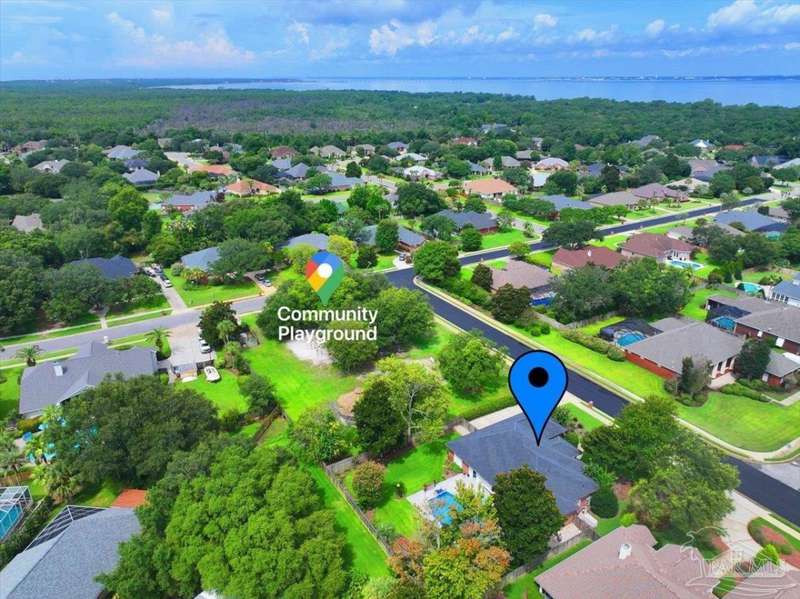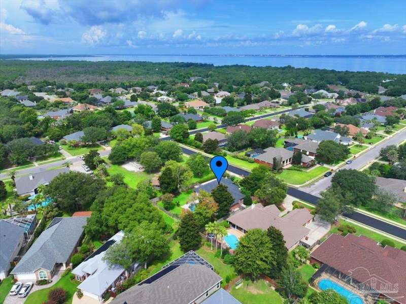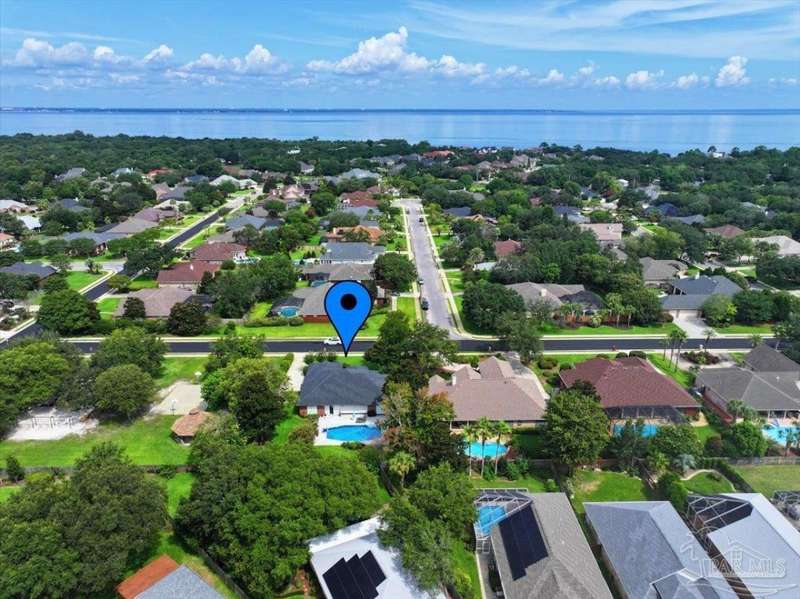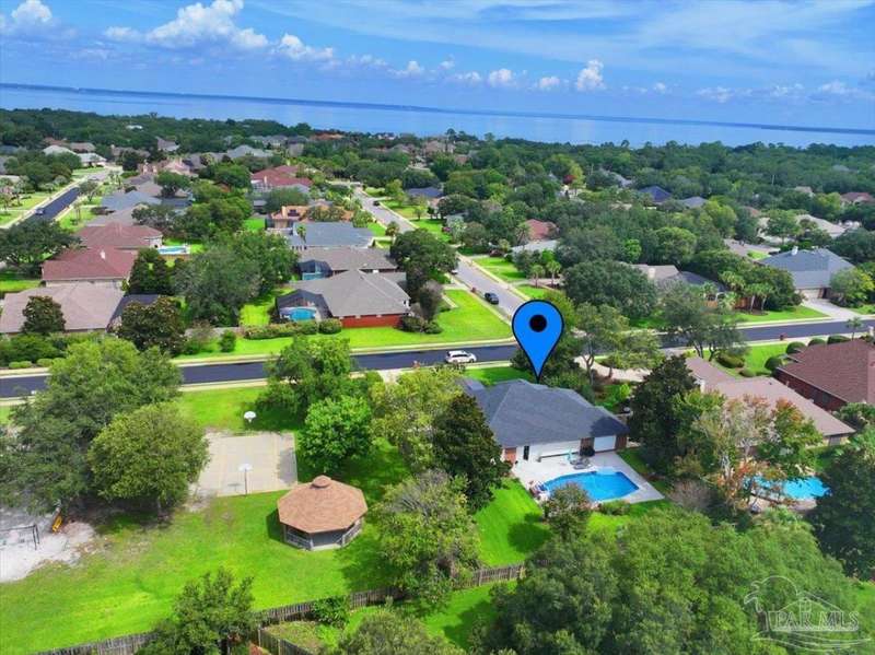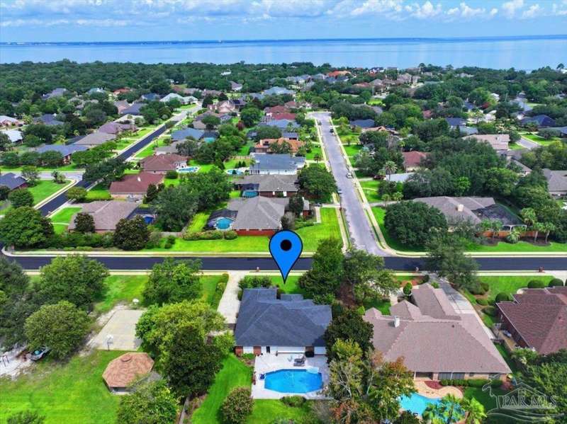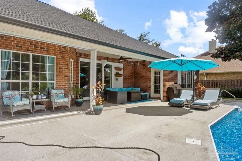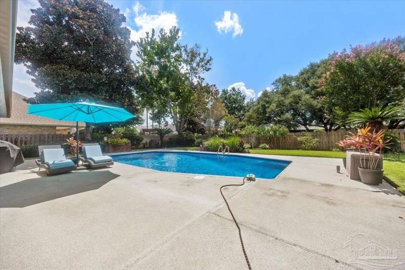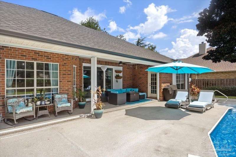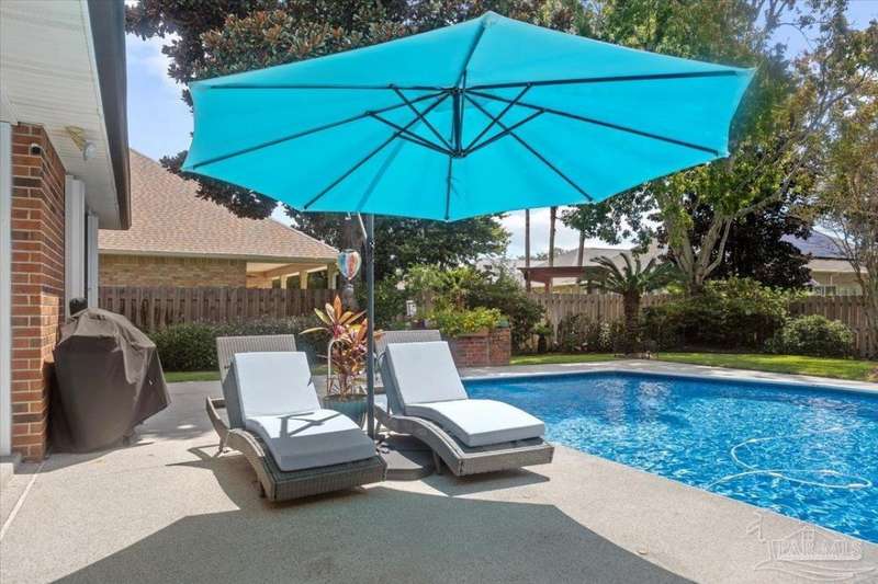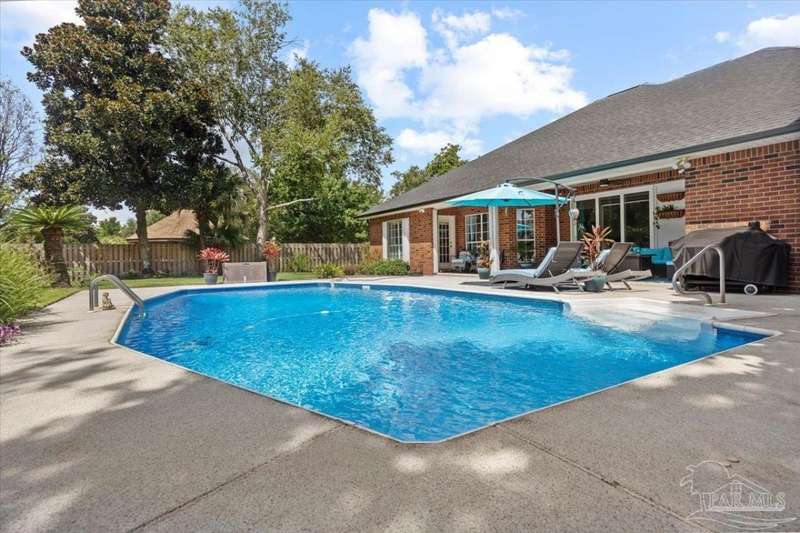 Open House Saturday and Sunday September 13th and 14th, 10AM-1 PM. Welcome to this impeccably maintained, custom brick home in desirable Grand Pointe-where indoor comfort meets outdoor paradise. Step into your private retreat featuring a fabulous backyard with a large sparkling pool, lush tropical landscaping, and a covered patio perfect for entertaining or relaxing year-round. This 3-bedroom, 2-bathroom home PLUS a DEDICATED OFFICE offers a versatile layout, including two spacious guest rooms connected by an oversized Hollywood-style bathroom-ideal for an in-law suite. The primary suite is a true sanctuary, with serene views of the pool and patio. There's ample space for a sitting area, treadmill, or exercise bike, plus a huge walk-in closet, oversized linen storage, jetted tub, separate shower, and private water closet. The open-concept living area flows seamlessly from the formal dining room into the spacious kitchen, with granite countertops and updated appliances, new dishwasher (2025). The home also features: whole-house generator, updated HVAC (2018), new roof (2020), new garage door (2025), new sliding doors to patio (2024), hurricane shutters including Storm Tex electric retractable sunscreen and hurricane screen (2023), new gutters (2024), new pool liner (2022), new irrigation pump (2024), well and sprinkler system, water heater (2016), transferrable termite protection plan. Flood insurance not required and the home has never flooded. With solid construction, thoughtful updates, and a show-stopping backyard, this home offers everything you need to move in and start living your best Florida lifestyle. Grand Pointe is a desirable neighborhood that boasts a community park, underground utilities and sidewalks. Great location only 5 miles to sugar white sands and emerald waters of Pensacola Beach. Zoned for TOP RATED SCHOOLS of Gulf Breeze Elementary, Middle and High School. Close to shopping, hospitals, restaurants, downtown Pensacola.