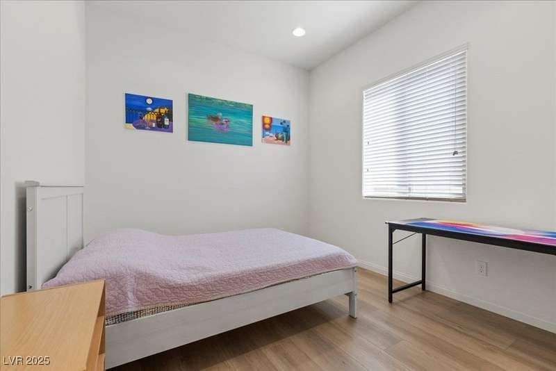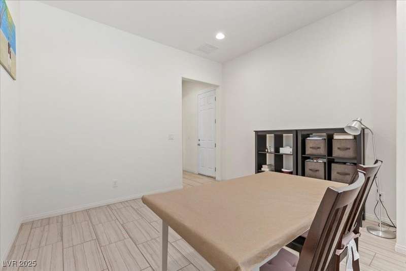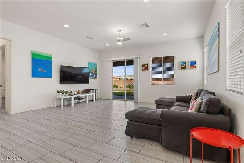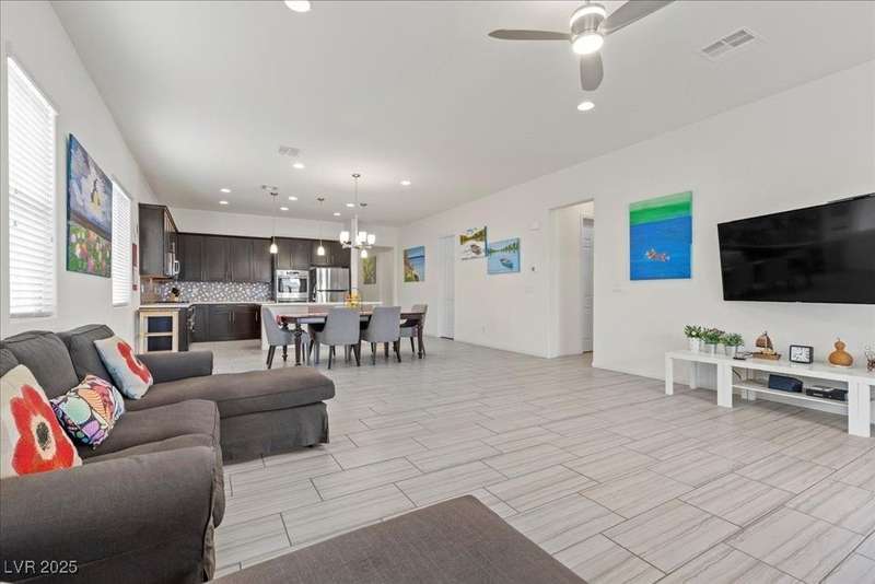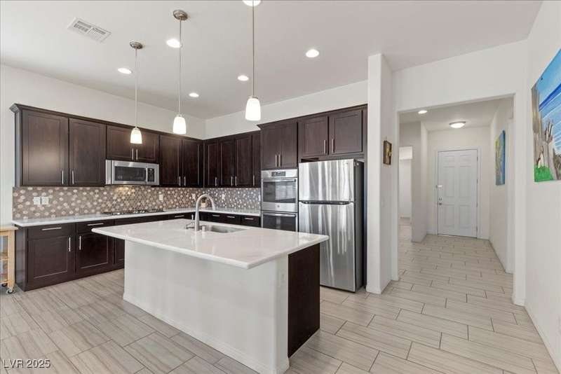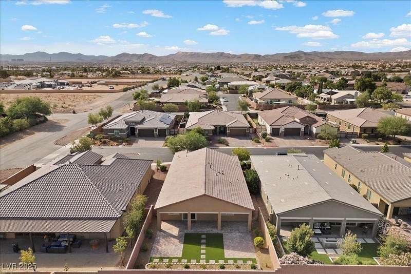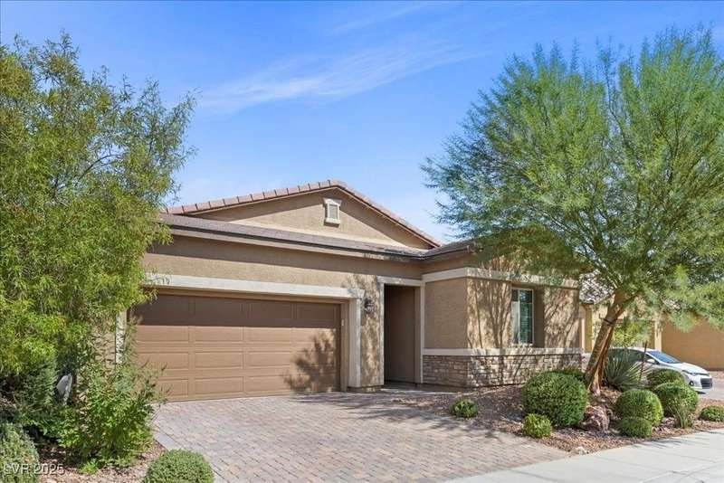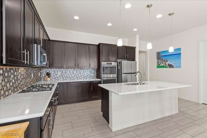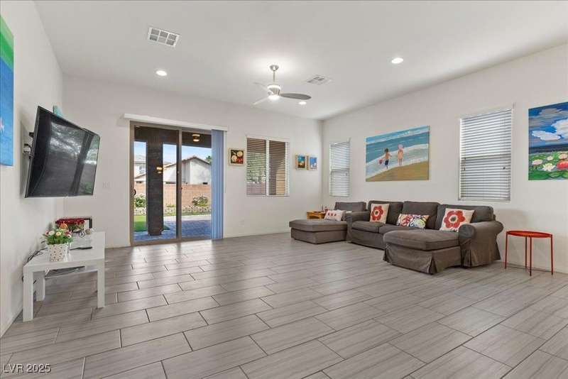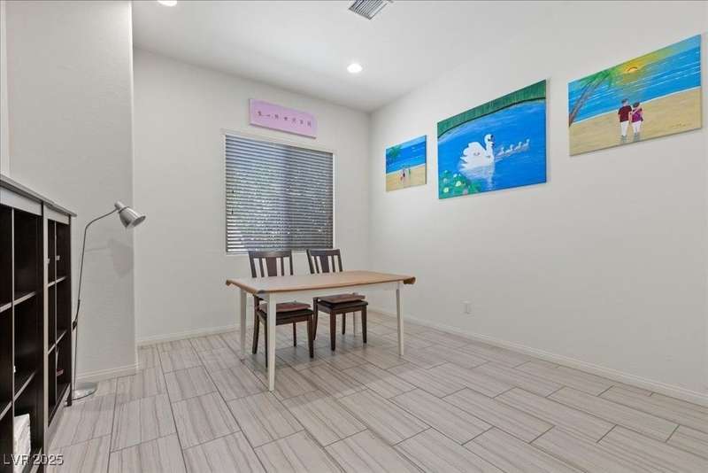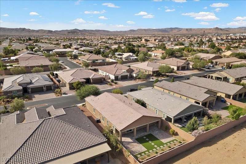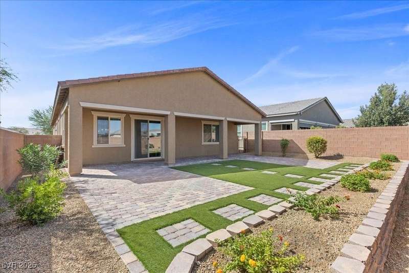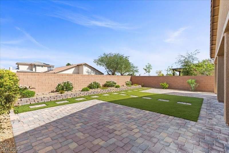 This stunning home is in the desirable Southwest area of Las Vegas. The Arlington Hills community is exclusive to 28 homes. Minutes from the Las Vegas Strip, this home offers the perfect blend of luxury & convenience. The 10ft ceilings and an open floor plan provide a grand & spacious feel. The kitchen is a highlight, featuring upgraded cabinetry with soft-close drawers, a custom backsplash, double ovens, and a large island. The spacious primary suite is separate from the secondary bedrooms, offering maximum privacy. The primary bathroom is designed with a soaking tub, walk-in shower & dual vanities. In addition to having two bedrooms, there is a versatile flex space ideal for a home office, gym, or guest space. Flooring upgrades include tile and new luxury vinyl plank flooring in the bedrooms. Step outside to your beautifully designed backyard oasis featuring a full-length patio cover, low-maintenance landscaping with artificial grass, and plenty of space to relax or entertain.