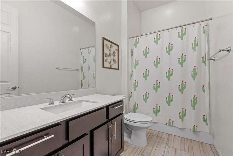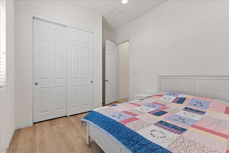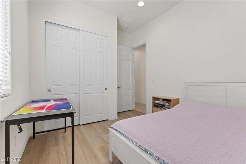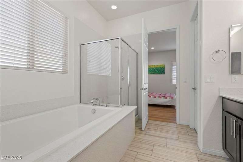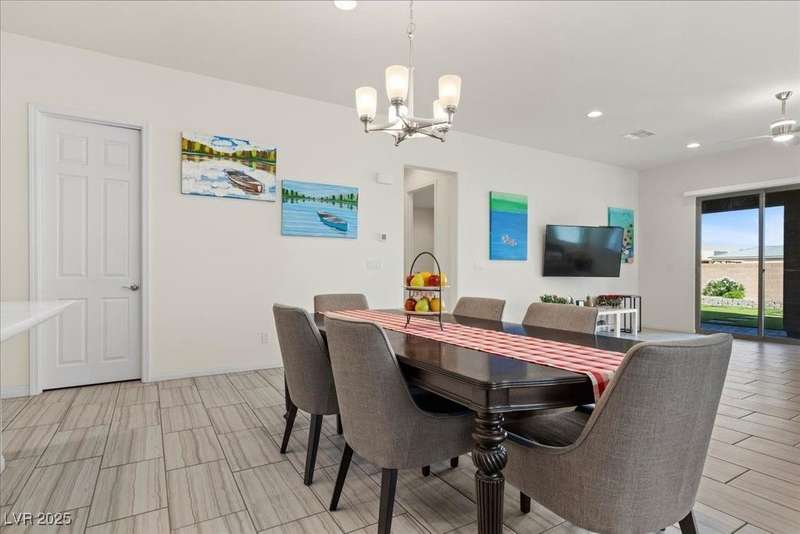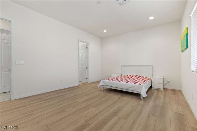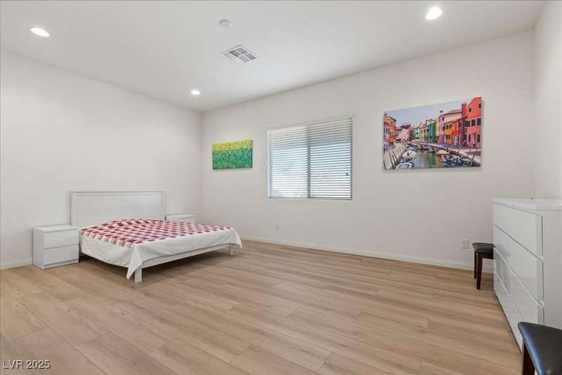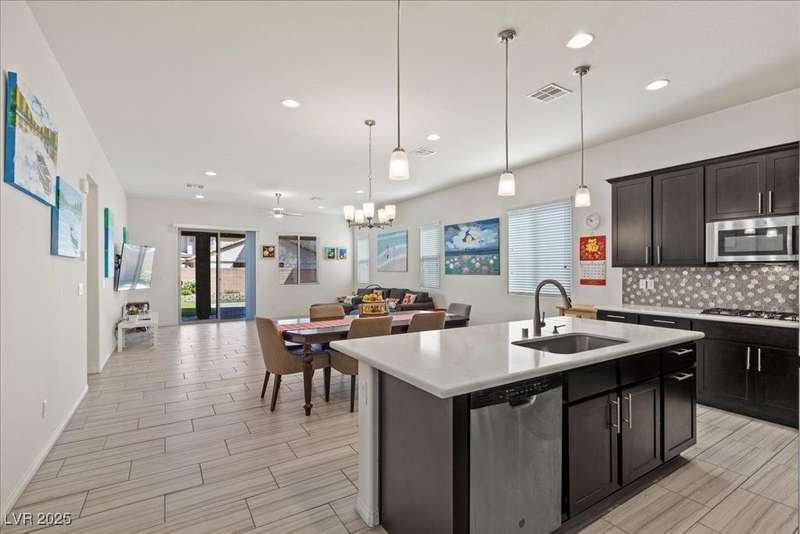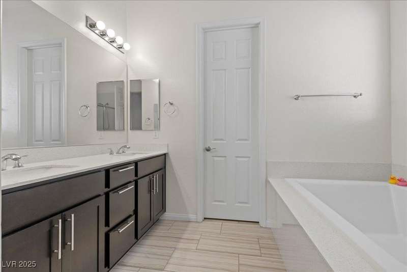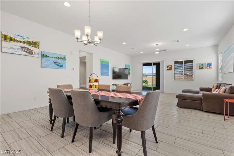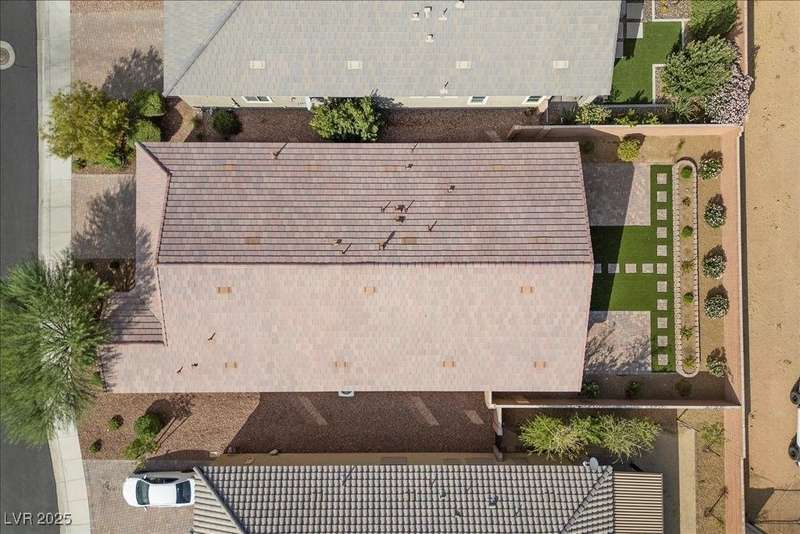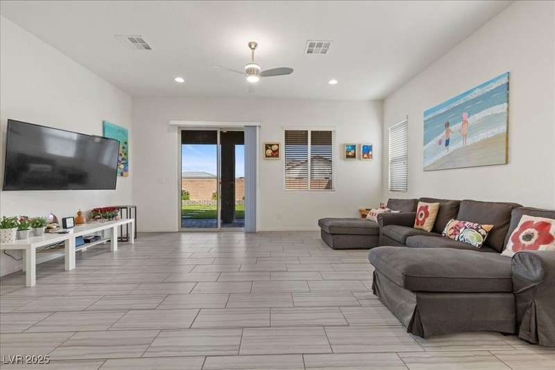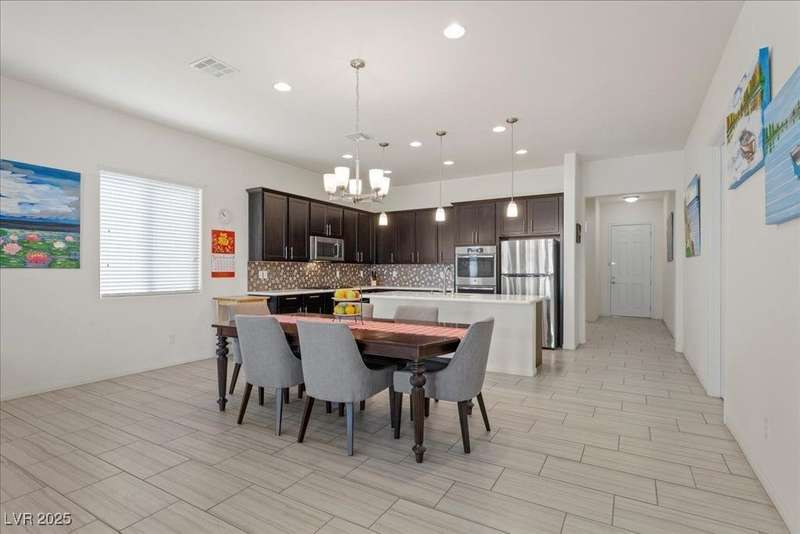 This stunning home is in the desirable Southwest area of Las Vegas. The Arlington Hills community is exclusive to 28 homes. Minutes from the Las Vegas Strip, this home offers the perfect blend of luxury & convenience. The 10ft ceilings and an open floor plan provide a grand & spacious feel. The kitchen is a highlight, featuring upgraded cabinetry with soft-close drawers, a custom backsplash, double ovens, and a large island. The spacious primary suite is separate from the secondary bedrooms, offering maximum privacy. The primary bathroom is designed with a soaking tub, walk-in shower & dual vanities. In addition to having two bedrooms, there is a versatile flex space ideal for a home office, gym, or guest space. Flooring upgrades include tile and new luxury vinyl plank flooring in the bedrooms. Step outside to your beautifully designed backyard oasis featuring a full-length patio cover, low-maintenance landscaping with artificial grass, and plenty of space to relax or entertain.