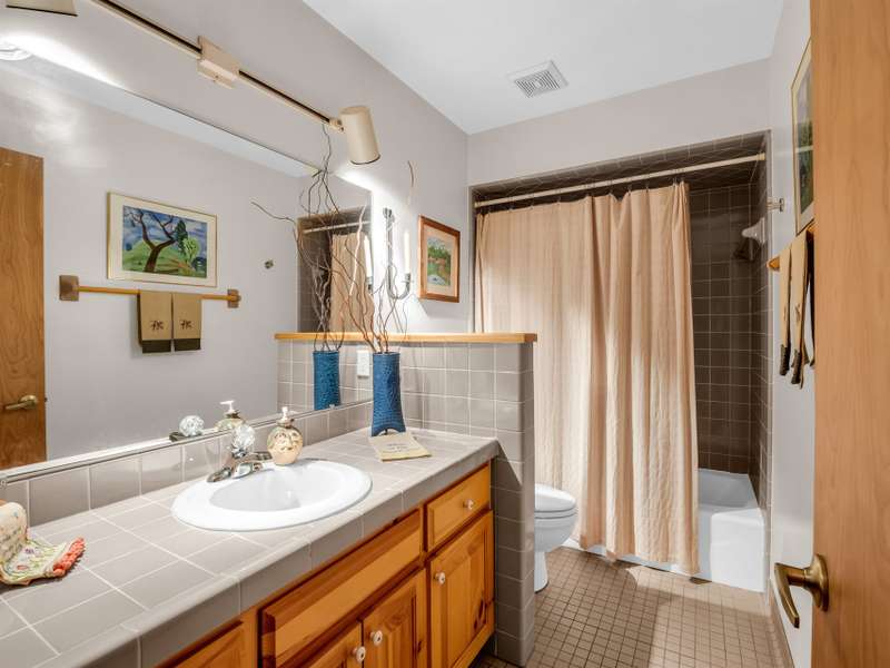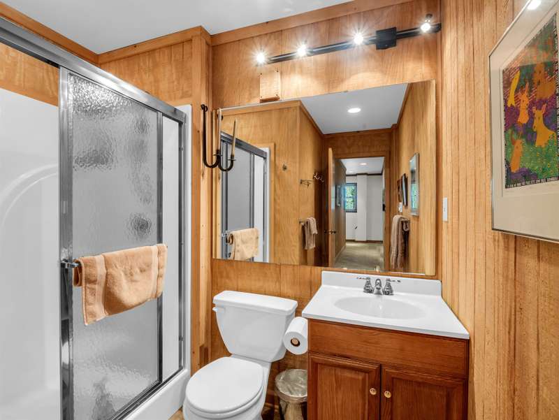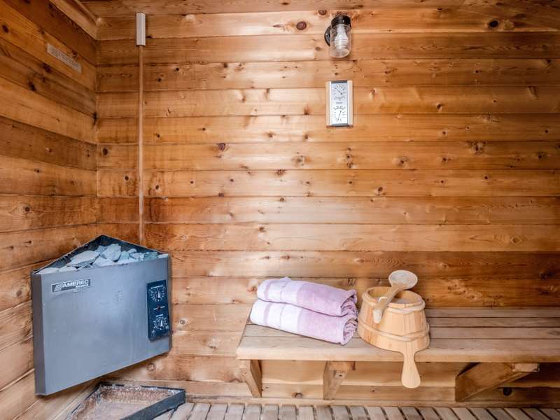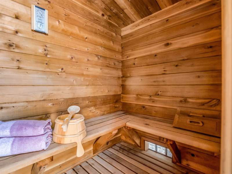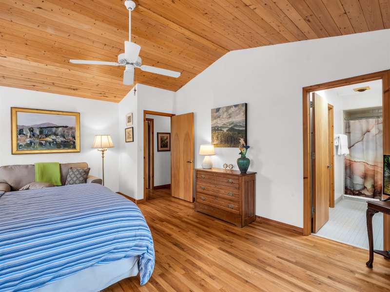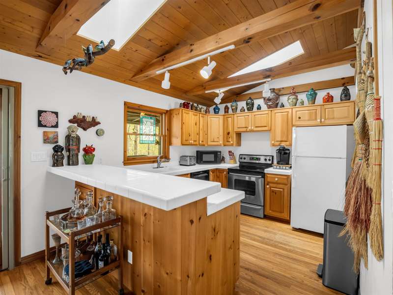 The kitchen offers ample cabinetry and generous counter space for all your prep and storage needs. The spacious and charming primary suite includes and ensuite bath wth dual sinks, a walk-in shower, a large walk-in closet. There are French doors from the primary leading to the deck—perfect for enjoying quiet mornings outdoors as well as direct access to exterior sauna.
