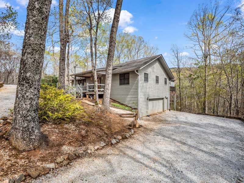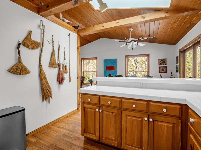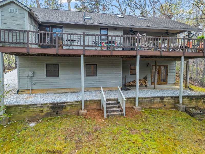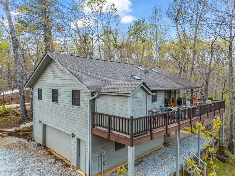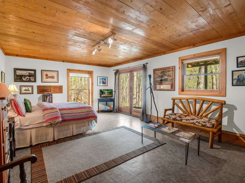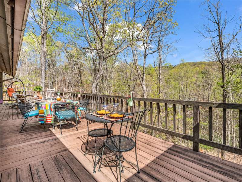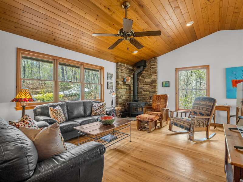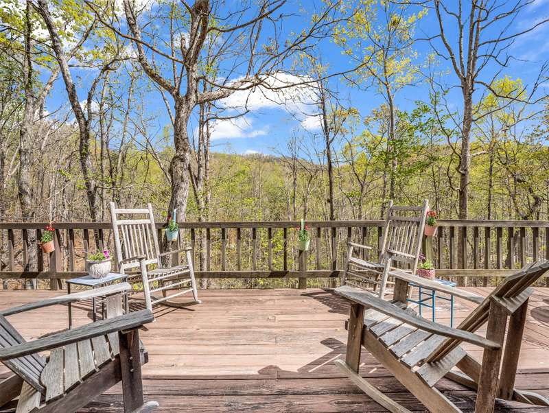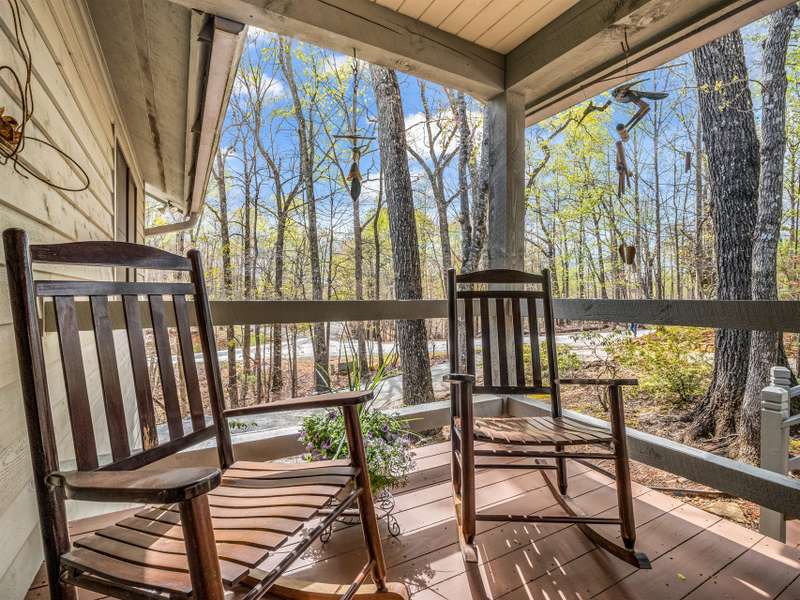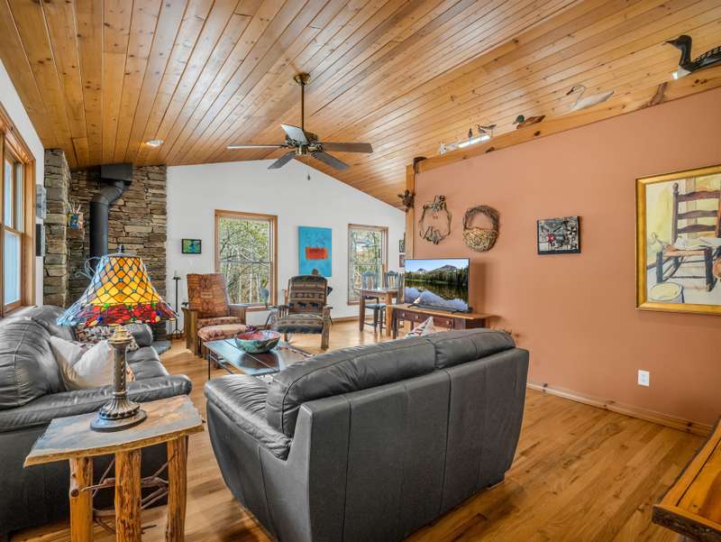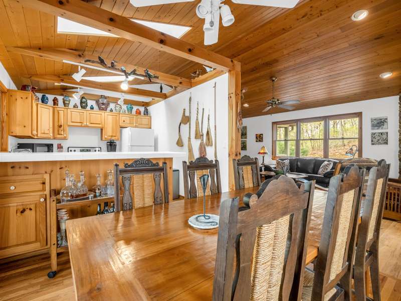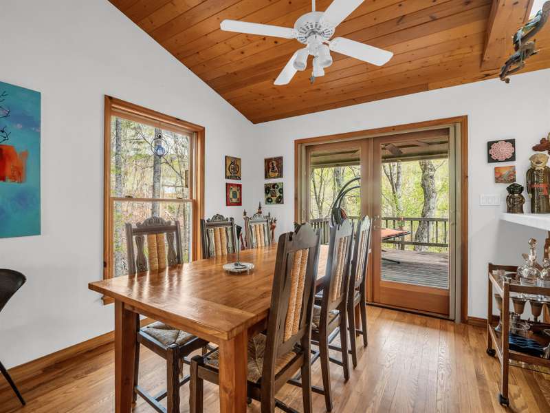 A covered front porch with a swing and rocking chairs welcomes you home and sets the tone for relaxed mountain living. Surrounded by forest, the peaceful setting makes every day feel like a breath of fresh air. Inside, the warm and inviting living room features rich wood ceilings and a wood-burning stove - perfect for chilly evenings. A cozy dining space opens through French doors to a grand deck, complete with a private outdoor sauna. The expansive deck is ideal for relaxing under the canopy or entertaining your guests in a wooded setting.