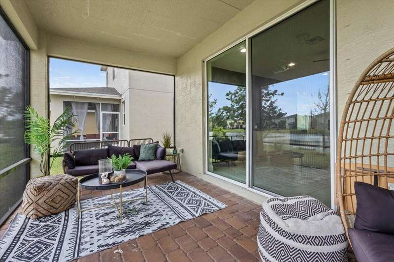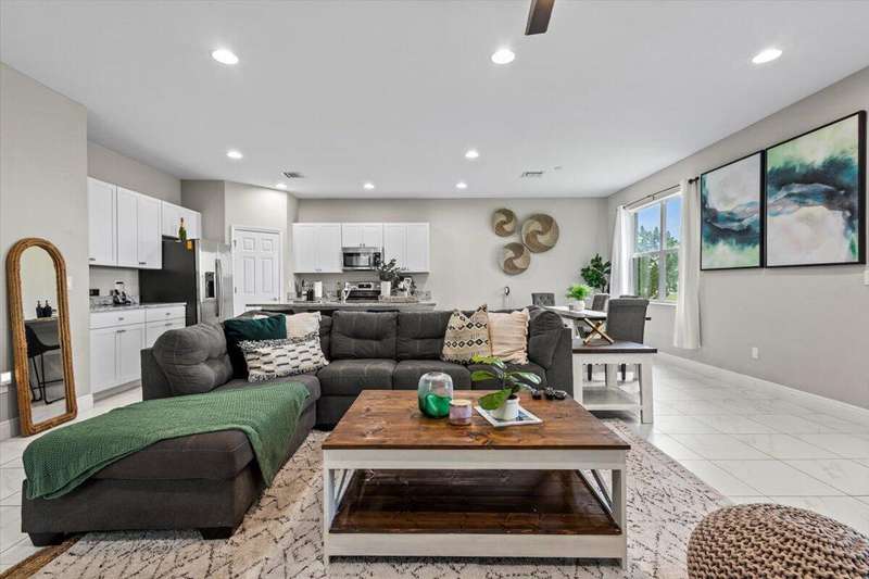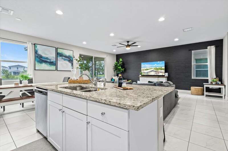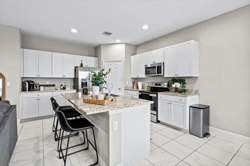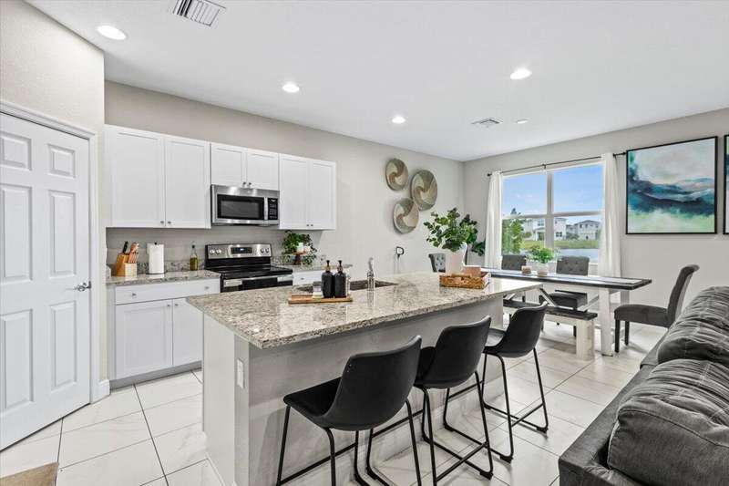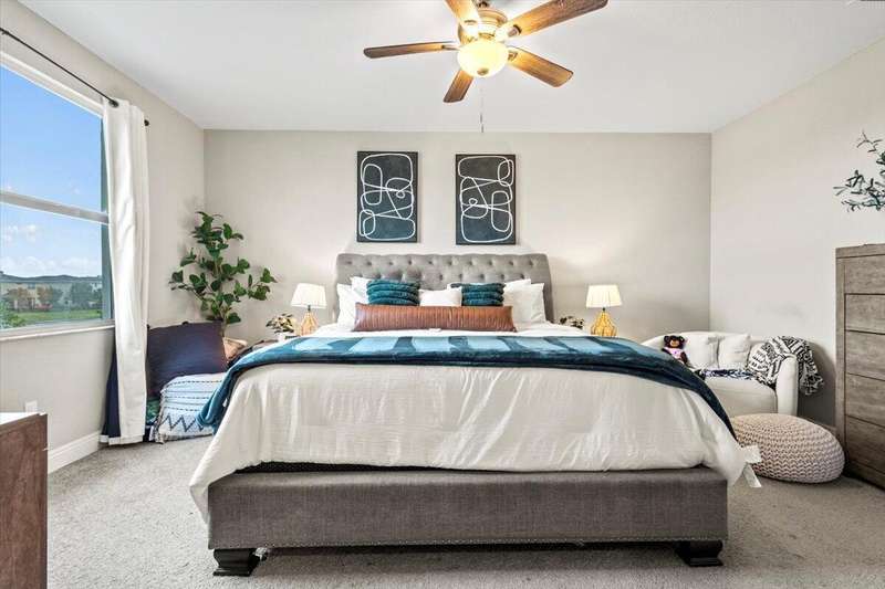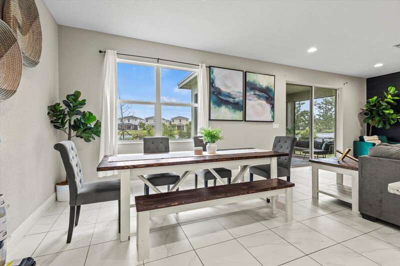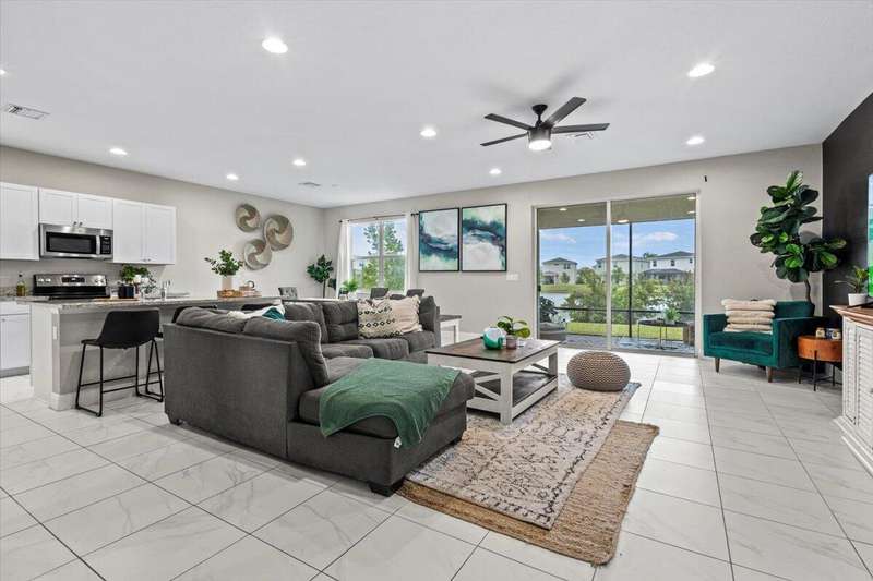 . The open-concept living area is highlighted by high ceilings and large windows, while the kitchen offers stainless steel appliances, granite countertops, and a sizable island. The master suite boasts a luxurious en-suite bathroom with a walk-in shower. The beautifully landscaped yard and covered patio, which offers a serene lake view, creating an ideal setting for outdoor living. The community also provides amenities such as a clubhouse, pool, fitness center, and walking trails.