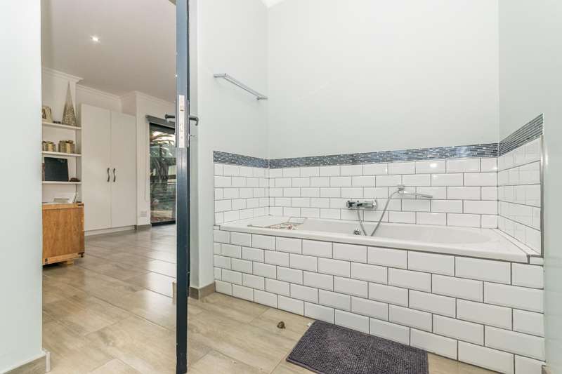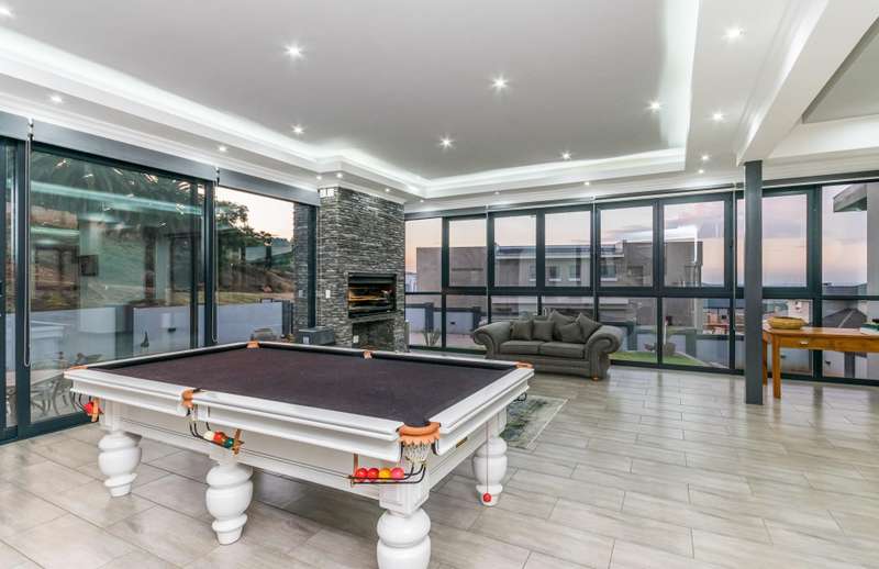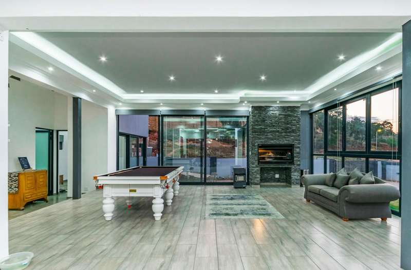 Open plan to TV room/casual lounge area. All windows are Aluminum stack away frames. Open plan dining area and large inside entertainment lounge area, with built in braai, ample space to entertain in style. Leads onto pool area and large double size stand with beautiful lawns.
