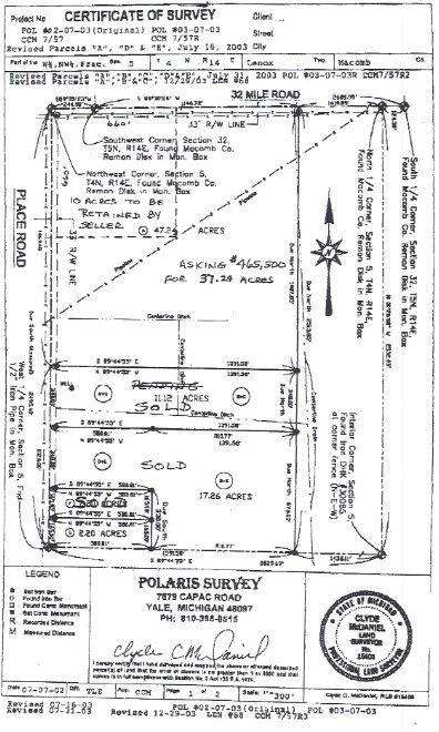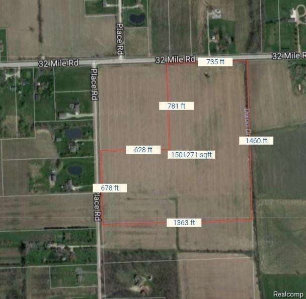 SOUTHEAST CORNER OF 32 MILE AND PLACE ROAD WITH FRONTAGE ON BOTH ROADS WITH 735 FEET ON 32 MILE ROAD AND 678 FEET ON PLACE ROAD. WRAPS AROUND THE CORNER PIECE.