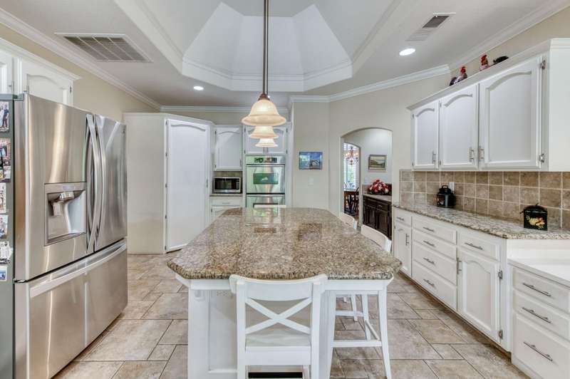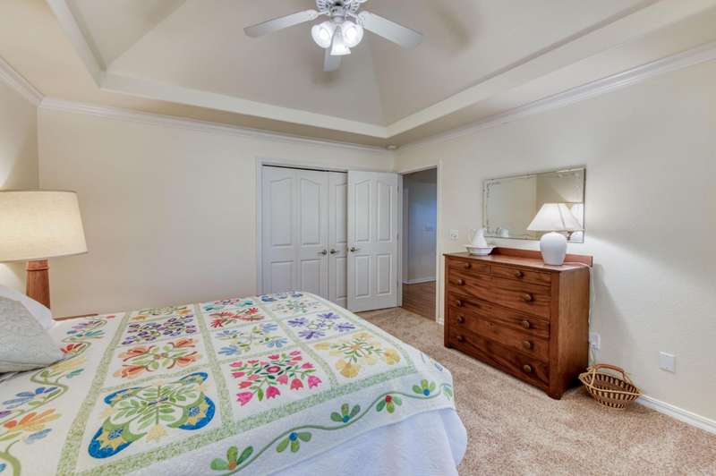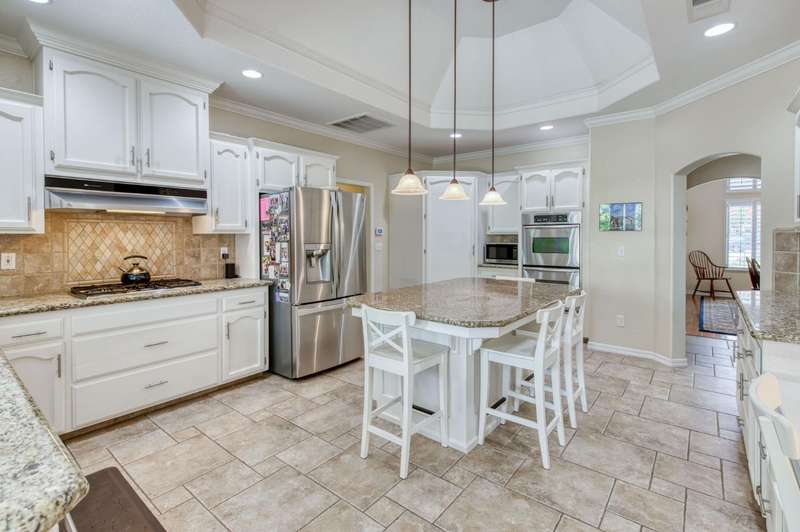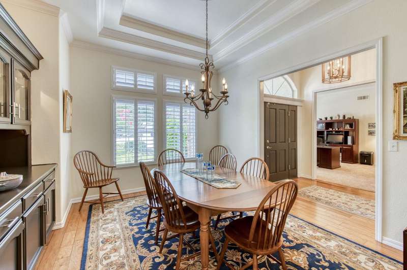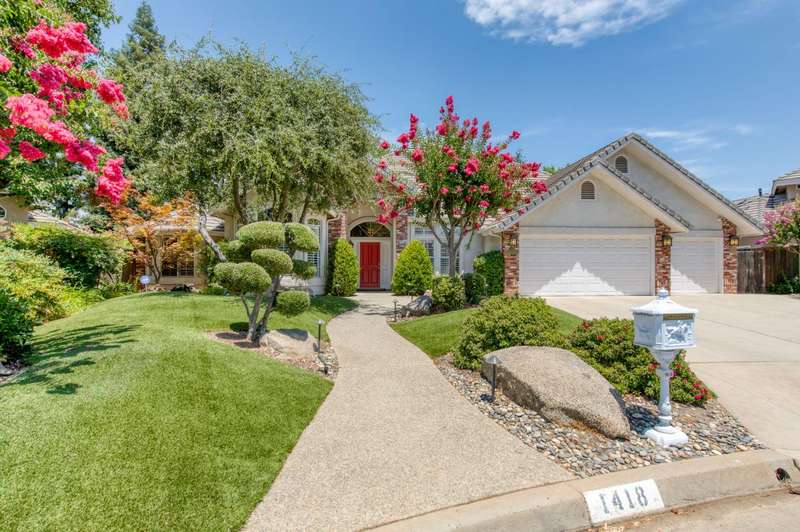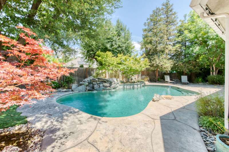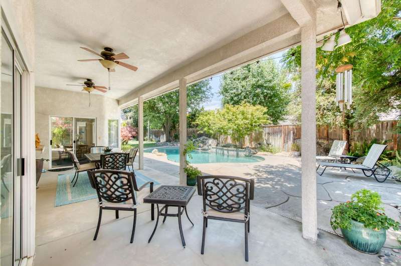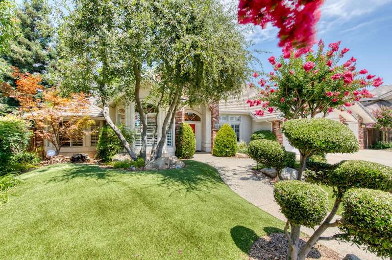 Fantastic location!! Tucked in a quiet cul-de-sac on a large pie-shaped lot in Madison Ridge East, this well-loved 3163 sq ft, 4 BR/3BA Custom home offers you a retreat from traffic and noise, yet it is within walking distance of shopping, restaurants, banks, library, gym and Liberty Elementary. Vibrant crepe myrtle trees and easy-care synthetic grass extend a beautiful welcome, and classic architecture makes you feel at home! Relax and play in this large back yard featuring a solar-heated pebbletec pool, rock waterfall, shady patio with fans, synthetic lawn, fountain, and a generous side yard with an apricot tree and raised veggie garden. The flexible floor plan is perfect for entertaining as well as everyday functionality. It flows effortlessly from the great room, with a fireplace and entertainment center, to the formal dining room with a built-in hutch and butler's pantry/bar for serving. This connects to the gourmet kitchen with an island, granite counters, stainless appliances, pantry, and bay-window breakfast area. Plus, the spacious bonus room can be a formal living room, game room, office or 5th bedroom! You'll love the huge closet in the primary suite, and the elegant bath with a large tub and separate shower. Both the isolated bedroom and remodeled 3rd bath have access to the patio and pool area. A large laundry room has a sink and counter space. You'll find lots of storage above the 3-car garage and in the outdoor shed. This well-maintained home includes a newer AC system and updated solar for the pool. Award-winning Clovis Schools complete the package. This serene oasis is calling you to come home!
