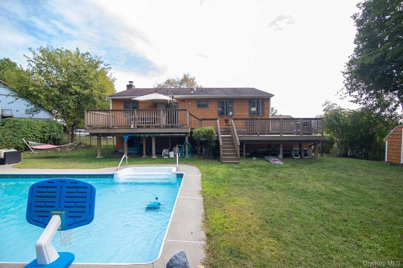 Welcome to this 4-bedroom, 2 bath bi-level home located on a quiet cul-de-sac! Boasting 2,000 sq. ft. of living space on 0.26 acres, this move-in-ready property offers comfort, style, and incredible updates throughout. The kitchen features custom cabinetry, granite countertops, built-in granite counter/table for additional seating, stainless steel appliances, and a pull-out pantry, perfect for cooking and entertaining. The main bath has a custom double-sink vanity, whirlpool tub, and laundry chute. Upstairs, enjoy a bright living room and dining area that flows seamlessly to the kitchen, while the lower level offers a spacious family room with a wood-burning fireplace, an additional den/office, a fourth bedroom, and a full recently updated tiled bath—ideal for guests or a potential in-law setup. This solidly built home showcases Anderson windows, hardy plank siding, and hardwood floors throughout. Modern amenities include a high efficiency gas boiler, brand new central air, central vac, security system, and a two-car garage. The fenced-in backyard is an entertainer’s dream with a double-deck (partial composite) that has scenic mountain views, and a 16x32 in-ground pool with heater and pool equipment included. Mature plantings for privacy. Scuttle attic located in primary bedroom closet and attic area with pull-down stairs located in the garage for extra storage space. Upgraded 200 amp electric (2020). Public water and sewer add convenience. This home offers the perfect blend of quality, comfort and charm in a sought-after location in the Washingtonville School District. Close to shopping, restaurants, highways, wineries, nature trails, and within walking distance to public park, etc. Come make this your home and explore what the beautiful Hudson Valley has to offer.