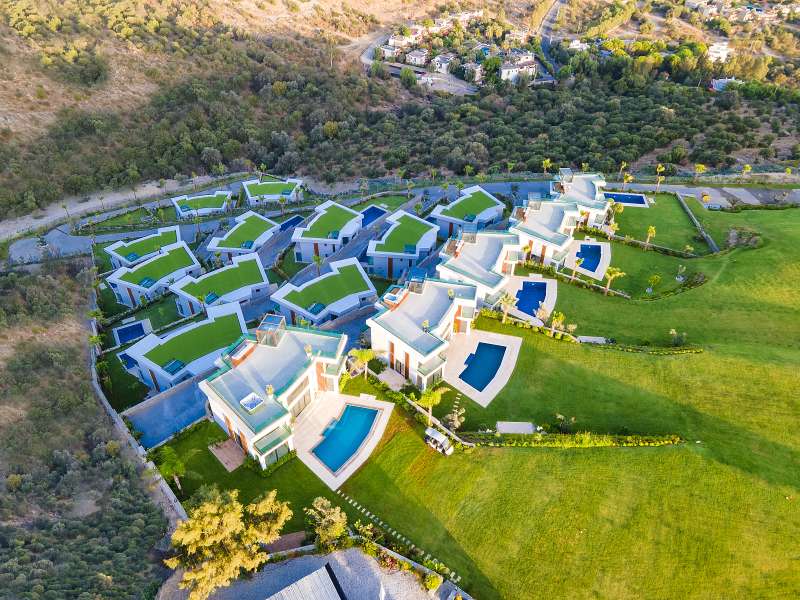 Villas for sale in Bodrum are located 2 km from beachfront restaurants, 14 km from Palmarina, 22 km from Bodrum State Hospital and Bodrum center, 24 km from Mausoleum of Halicarnassus, considered one of the 7 wonders of the world, 48 km from Milas Airport.