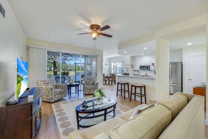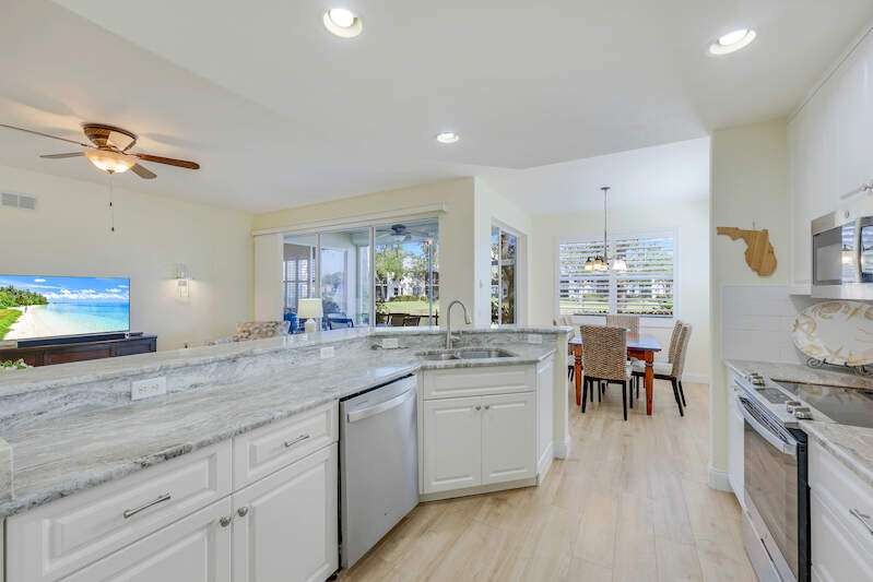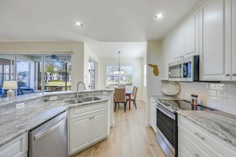 This sunny south end home is ready for you to come and play in the best, all-inclusive community in Southwest Florida, Pelican Sound Golf and River Club! Enjoy the resort lifestyle in comfort as this home offers you a beautifully renovated and maintained property. Take it all in from the chef's kitchen re-imagined by highly regarded Cornerstone Kitchen with quality made 42" to-the-ceiling cabinets and added features like a real pantry with a regular door on it, and finished with gorgeous stone countertops. The spacious laundry room has the special addition of a tankless hot water, and now you will also enjoy the extra storage space of a nice deep linen closet in the wall where the HW heater used to be! Newer EVERYTHING, FROM THE AC TO ALL THE APPLIANCES! After a fun day playing pickleball or golf, sleep well on your incredible Sleep Number King-sized mattress. The owner has seen to every detail to make living in this home comfortable and ready for you, including the best available storm shutters and even a brand new garage door opener! Other great items are the comfort level toilets, the gorgeous planation shutters, the quality TV's and furniture that the Seller will include. Situated west of US 41 in exciting Estero, Pelican Sound offers and unparalleled lifestyle and location. Whatever your interests are, whether you are searching for an excellent golfing experience, world class pickleball facilities and tennis programs, a super attended fitness center, on-campus dining choices from formal to very casual, 6 pools and spas to enjoy, a social calendar that is the envy of other clubs - Here, beside the Estero River you have everything! There's more even, with a community water taxi out the beach on the Gulf; on-site boat storage if you want your own fishing and cruising experience! Maybe you are more interested in things like a good book club and lots of cards and gaming available? It is all right here! Let us give you the 'Chamber of Commerce' tour of the best community in Southwest Florida!