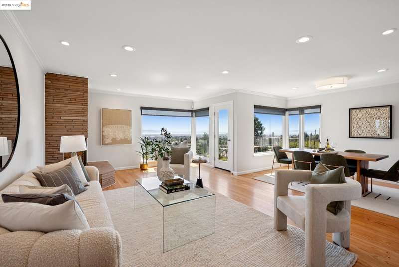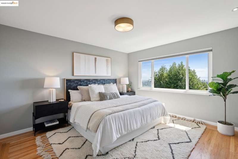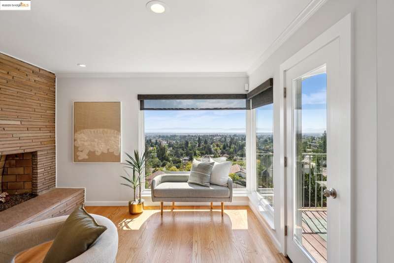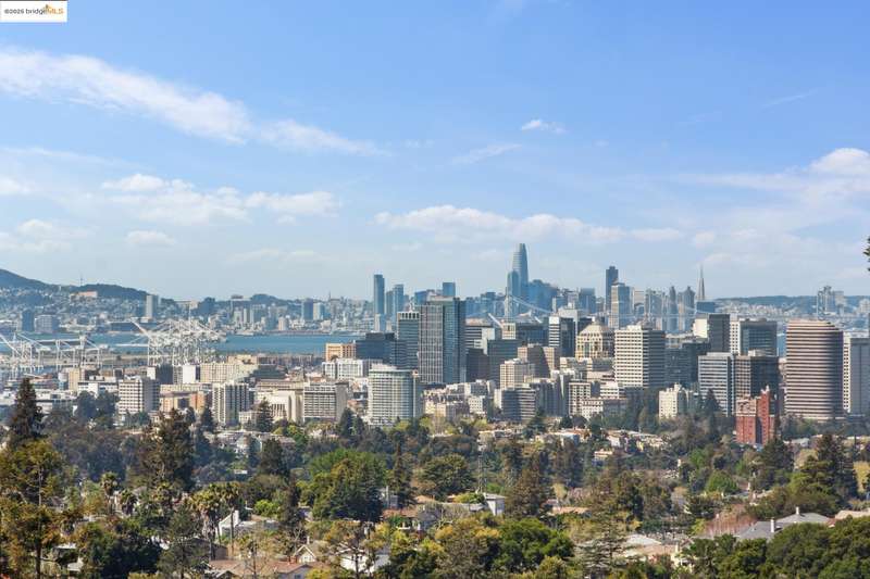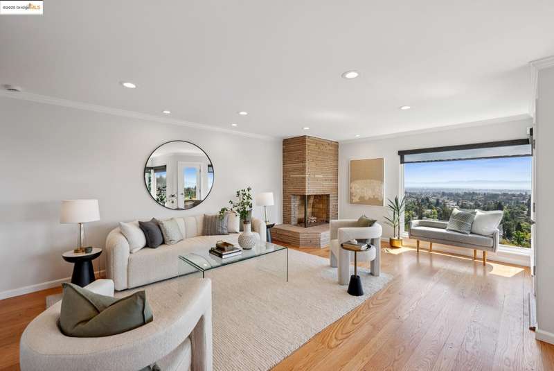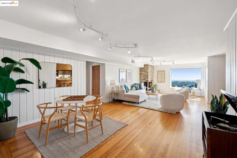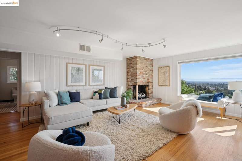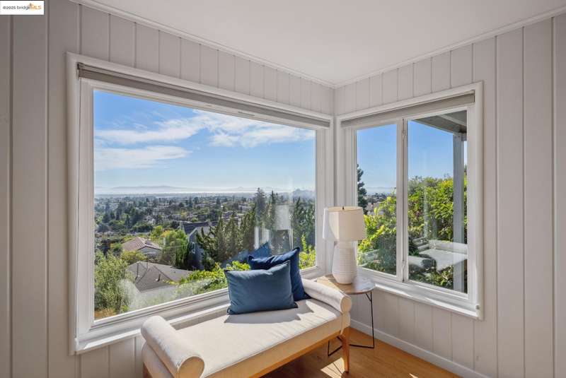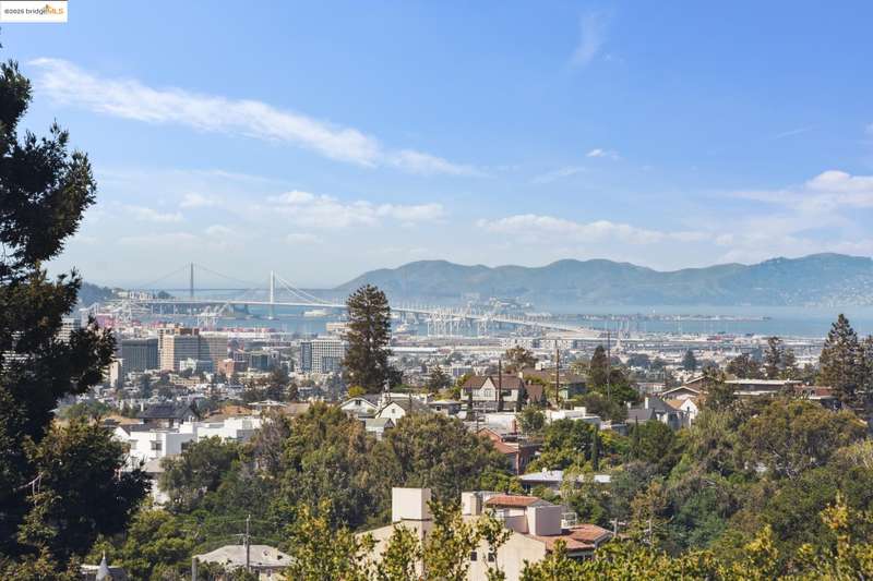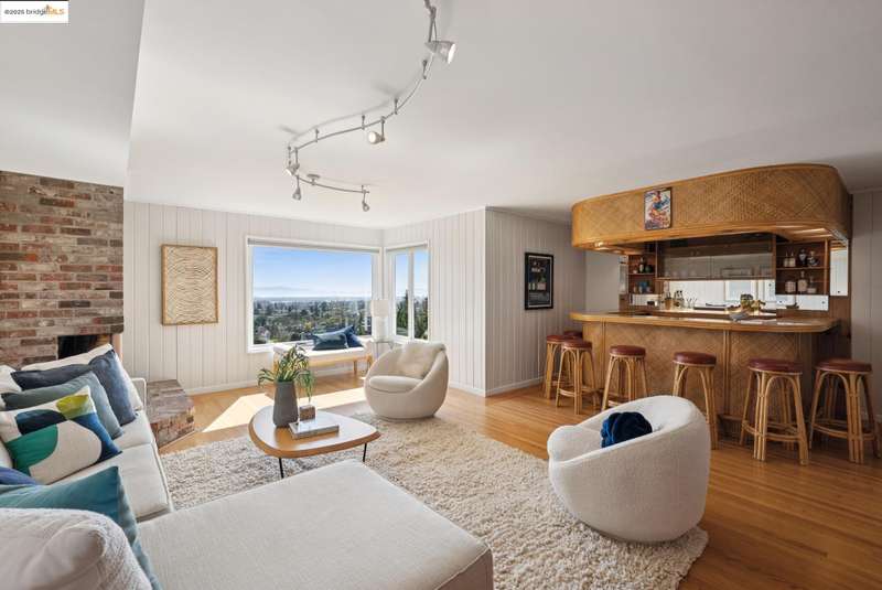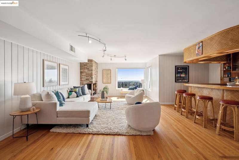 <strong>Spacious Level-in Mid-century Stunner with Panoramic Bay Views </strong> Fabulous, spacious, and ready to impress — this 5BR/3BA home offers stunning Bay, bridge, and city views, level-in access, family room with Tiki Bar, and exceptional outdoor space. Main Level Highlights <dl><li>Level-in entry from both garage and front door (no steps)</li> <li>Sun-drenched living room with floor-to-ceiling windows, classic mid-century fireplace, and access to the view deck</li> <li>Chic dining area with views flowing into a kitchen with new hardwood floors (summer 2025), granite island, stainless steel appliances, and abundant storage</li> <li>Three spacious bedrooms and two updated baths</li> <li>Dreamy view deck for morning coffee or evening sunsets</li></dl> Lower Level Fun & Flexibility <dl><li>Two additional bedrooms and full bath</li> <li>Huge family room with built-in Tiki Bar and second fireplace</li> <li>Bonus workshop/storage space</li></dl> Outdoor Oasis <dl><li>Private backyard with patio, grape arbor, fruit trees, and hot tub with deck surround</li> <li>Lush and private front courtyard patio</li> <li>Perfect for entertaining or quiet relaxation</li></dl> Prime Location <dl><li>Tucked at the end of a serene cul-de-sac in the coveted Oakmore neighborhood</li> <li>Minutes from shops, dining, parks, and schools</li></dl>