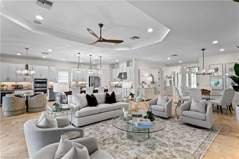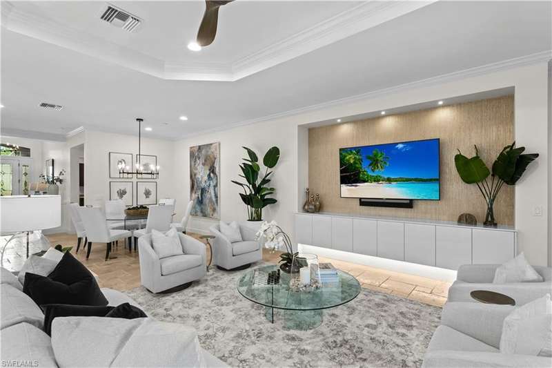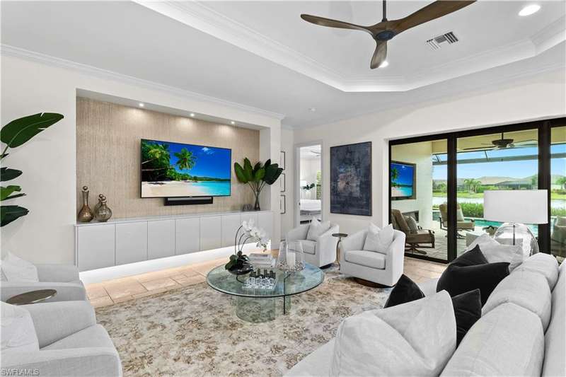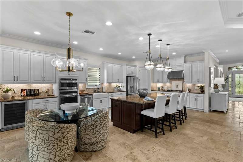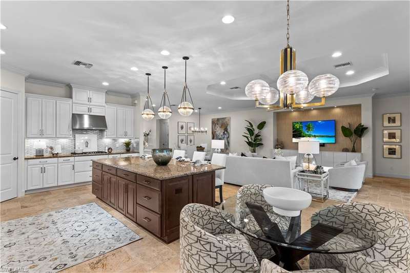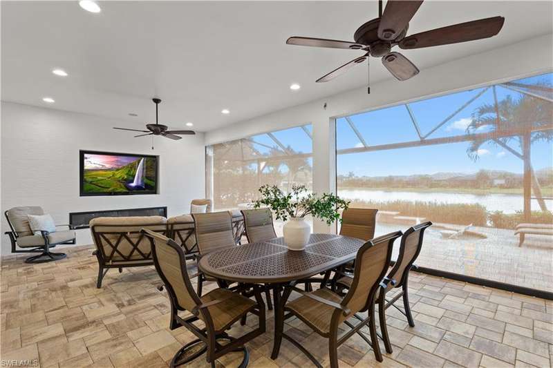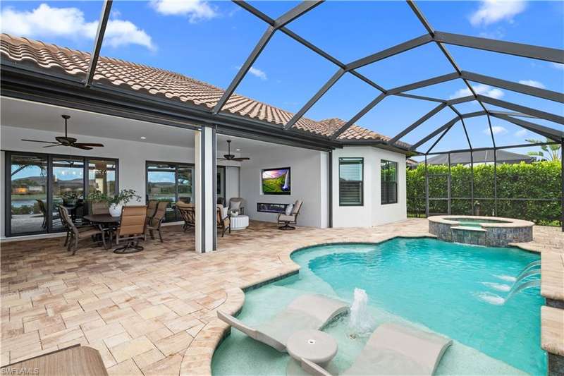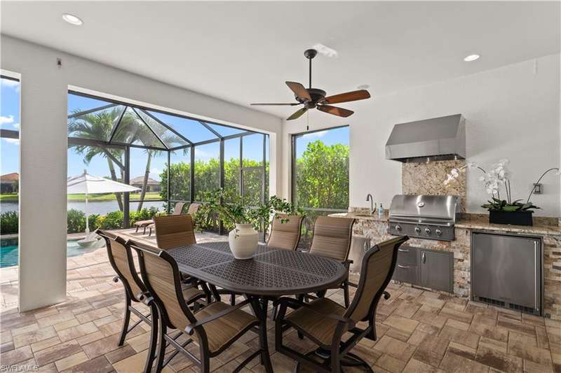LIVE A VACATION LIFESTYLE IN ESPLANADE! FULL GOLF MEMBERSHIP INCLUDED! Step into this highly upgraded Palazzio offering 3 spacious bedrooms, den, 3 full bathrooms, and 3,116 sq ft under air. With oversized rooms throughout, the open great room floorplan creates a seamless flow for entertaining and comfortable living. Two sets of pocketing sliding glass doors invite you to the expanded lanai, where you can enjoy picturesque wide lake views and SOUTHERN EXPOSURE, making this outdoor space an absolute retreat. The private pool area boasts a gas-heated saltwater pool with a raised spa and sunshelf. For those who love outdoor living, the lanai is equipped with an outdoor kitchen, feature wall with an LED fireplace & TV, all enclosed by electric motorized roll-down hurricane screens, ensuring year-round enjoyment. Inside, the home features rich travertine marble tile throughout the entire home. The expanded kitchen has been fully updated with white raised-panel cabinetry with contrasting w