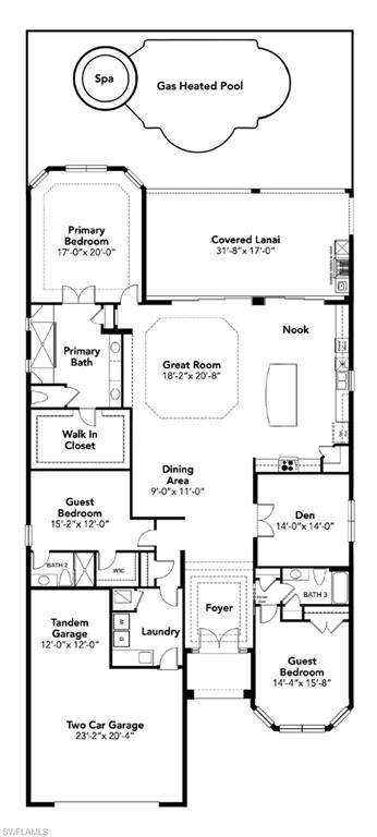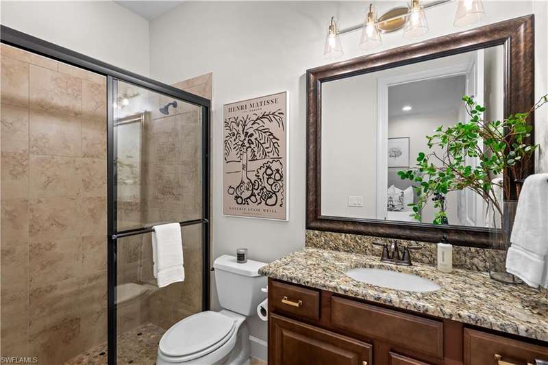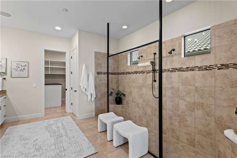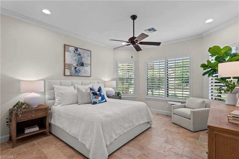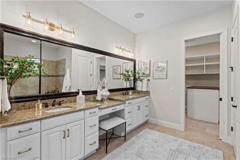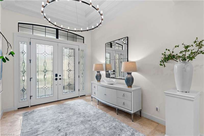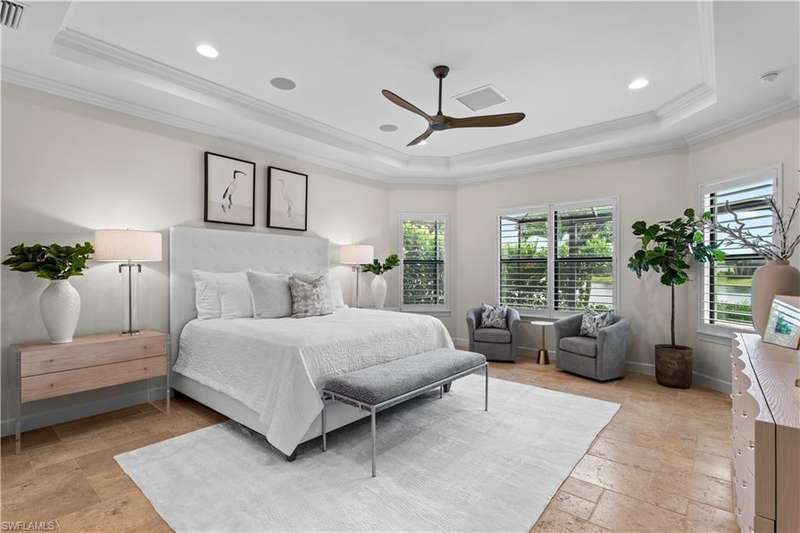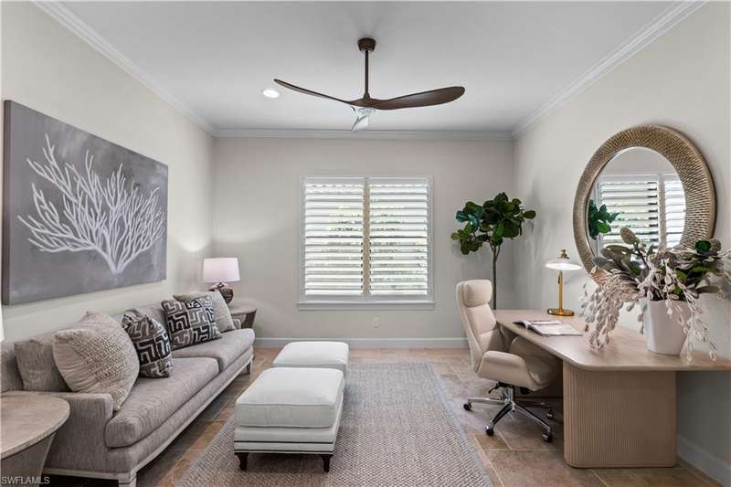 LIVE A VACATION LIFESTYLE IN ESPLANADE! FULL GOLF MEMBERSHIP INCLUDED! Step into this highly upgraded Palazzio offering 3 spacious bedrooms, den, 3 full bathrooms, and 3,116 sq ft under air. With oversized rooms throughout, the open great room floorplan creates a seamless flow for entertaining and comfortable living. Two sets of pocketing sliding glass doors invite you to the expanded lanai, where you can enjoy picturesque wide lake views and SOUTHERN EXPOSURE, making this outdoor space an absolute retreat. The private pool area boasts a gas-heated saltwater pool with a raised spa and sunshelf. For those who love outdoor living, the lanai is equipped with an outdoor kitchen, feature wall with an LED fireplace & TV, all enclosed by electric motorized roll-down hurricane screens, ensuring year-round enjoyment. Inside, the home features rich travertine marble tile throughout the entire home. The expanded kitchen has been fully updated with white raised-panel cabinetry with contrasting w