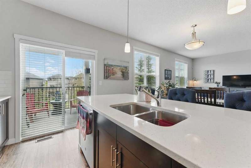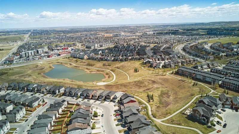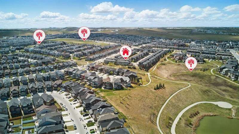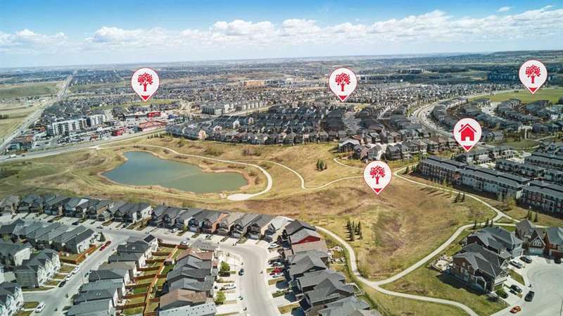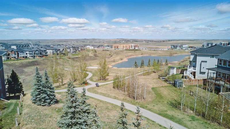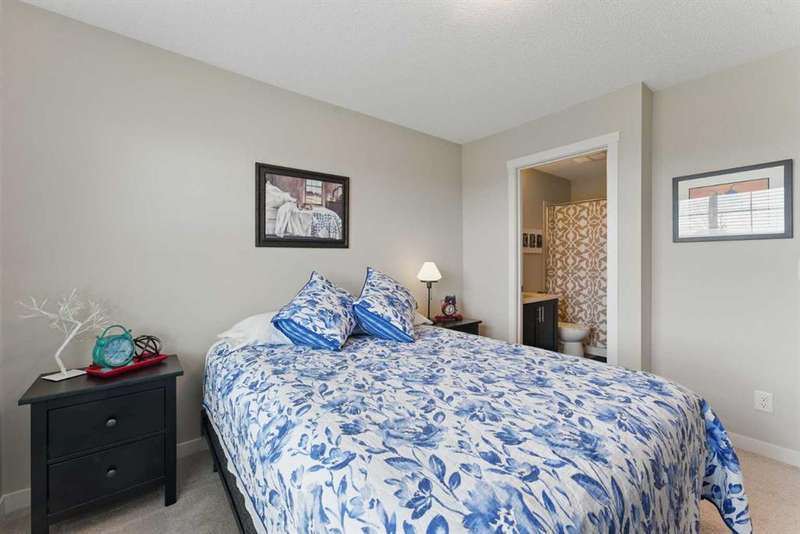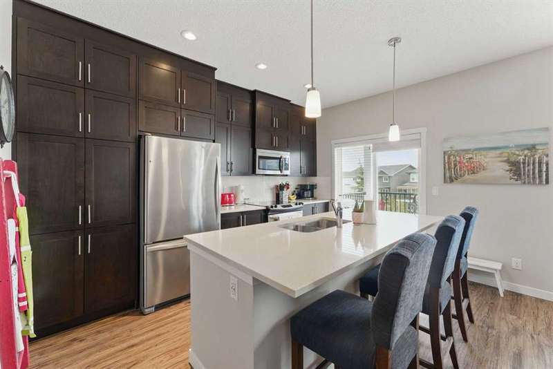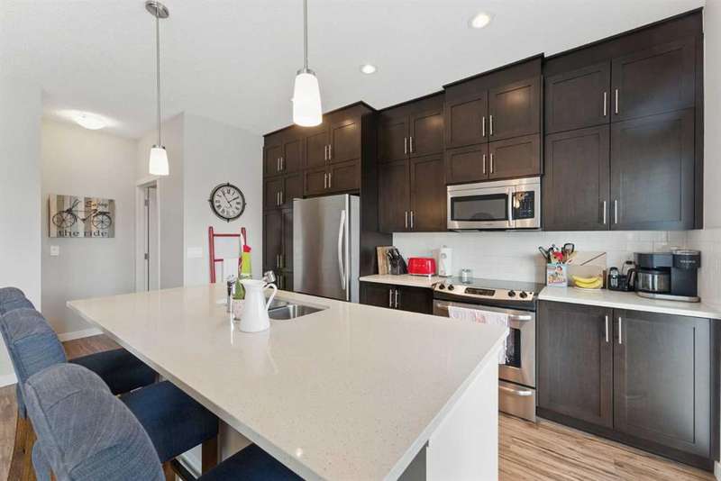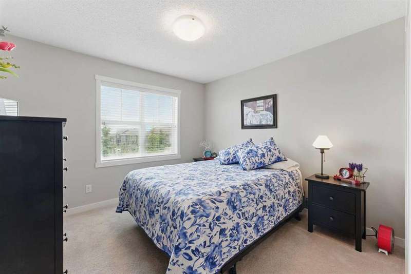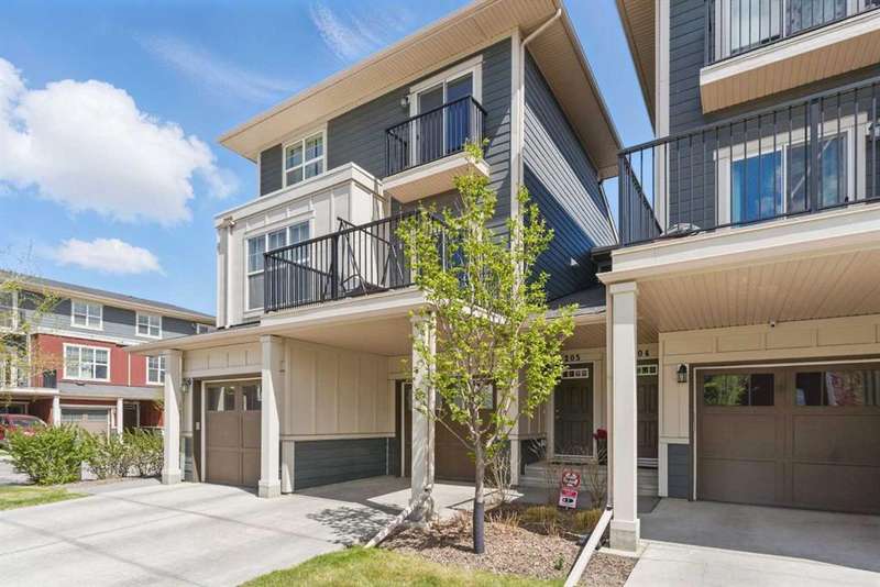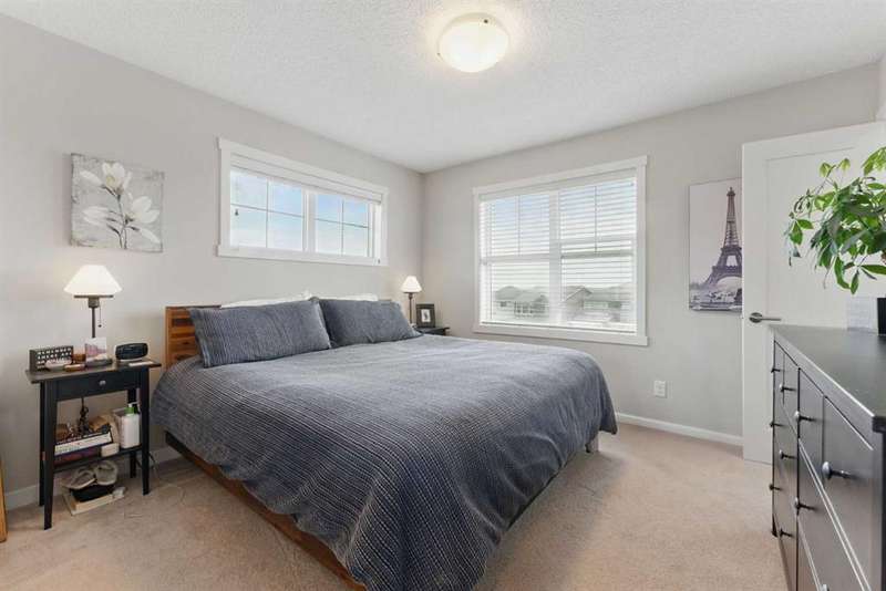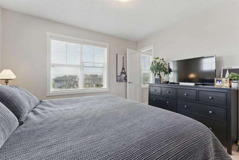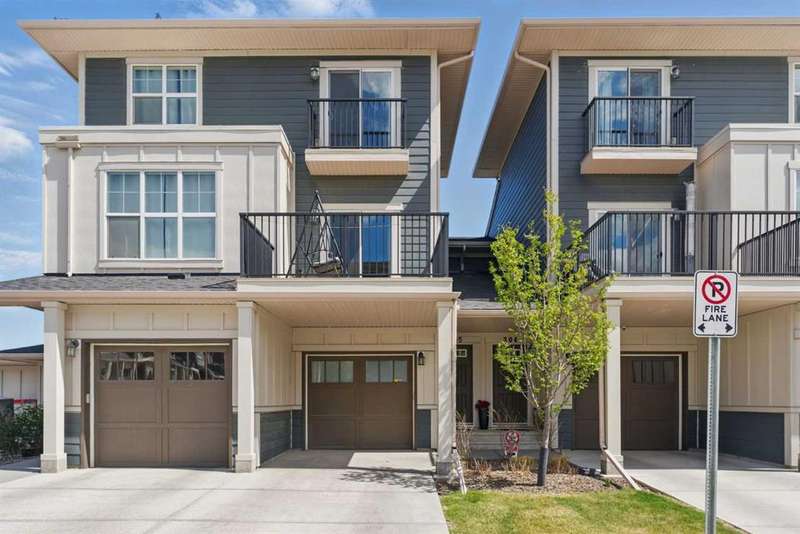 It’s rare to find a beautiful townhouse in such a coveted location—backing onto peaceful green space with scenic walking paths and overlooking a tranquil pond, offering privacy and breathtaking views. The front back stacked layout of these units gives this unit the feel of an END UNIT. Step inside this impeccably maintained 2-bedroom, 2.5-bathroom townhouse and be greeted by an expansive open-concept layout, where the main floor is bathed in natural light. The thoughtfully designed kitchen features rich dark cabinetry, sleek stainless steel appliances, and a large island that seamlessly flows into the spacious living room—perfect for both everyday living and entertaining. Just off the kitchen, step out onto your private deck, ideal for morning coffee or summer evening BBQs. A stylish 2-piece powder room completes the main level. Upstairs, you'll find two generously sized primary suites, each offering its own 4-piece ensuite and a large walk-in closet—creating the perfect balance of comfort and privacy. Every room is carefully positioned to capture the best views and promote relaxation. A convenient laundry room completes the upper floor. The fully developed basement adds even more versatility with a large rec room—ideal as an additional living space, home office, or entertainment area. This home truly has it all: a single attached garage, extended driveway, ample visitor parking, and a backyard oasis with direct access to walking paths and serene pond views. Located in the highly sought-after community of Nolan Hill, this home offers the perfect blend of luxury and functionality, with close proximity to parks, schools, shopping, and major roadways.