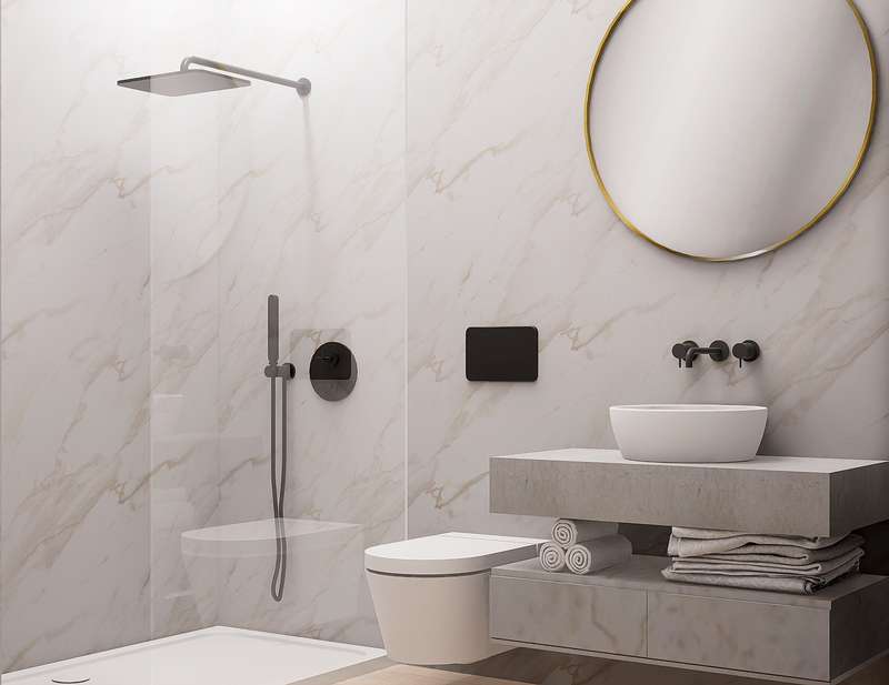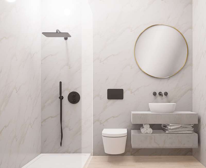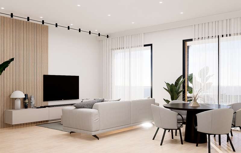 Inside the modem villa on the ground floor, you have a large double bedroom with a fitted wardrobe, a bathroom with a walk-in shower, an open-plan kitchen and dining area, and a spacious living room.