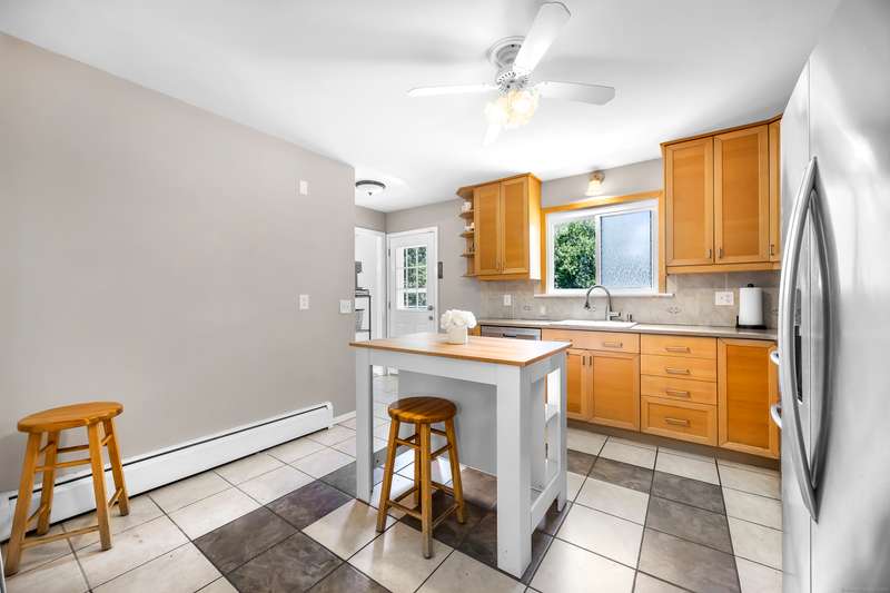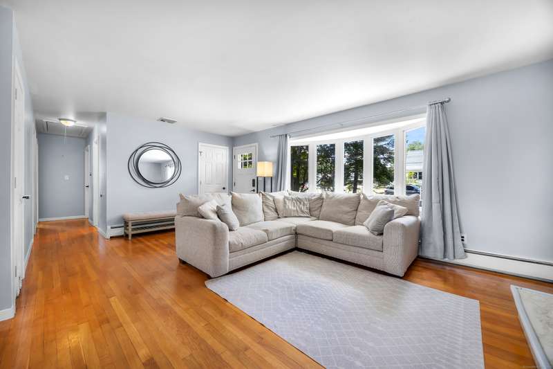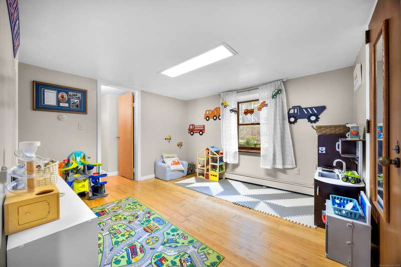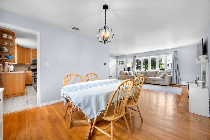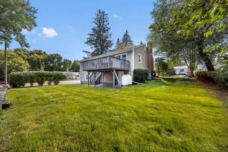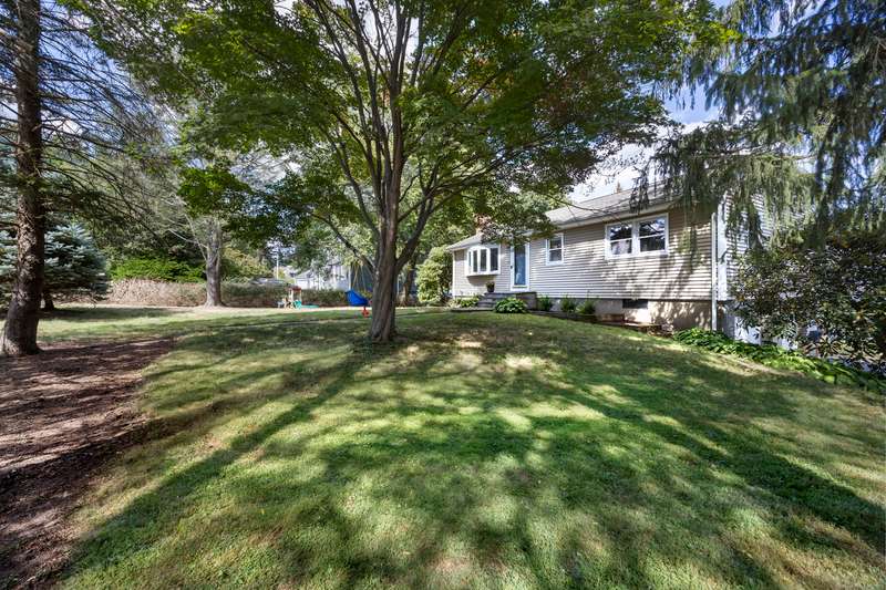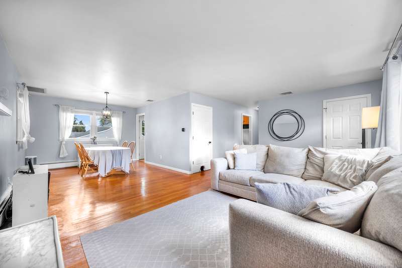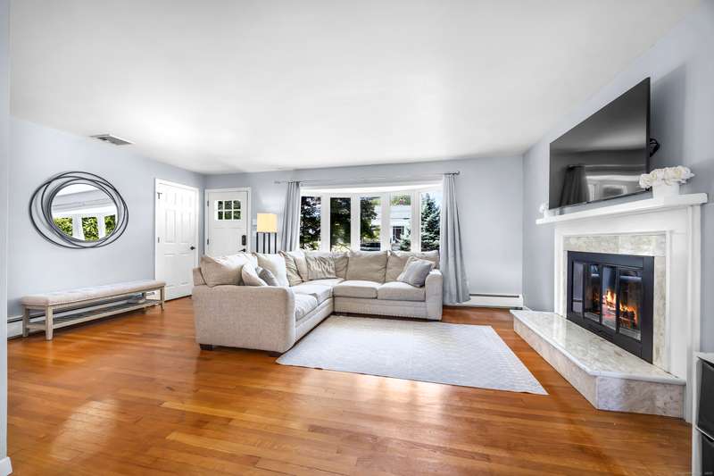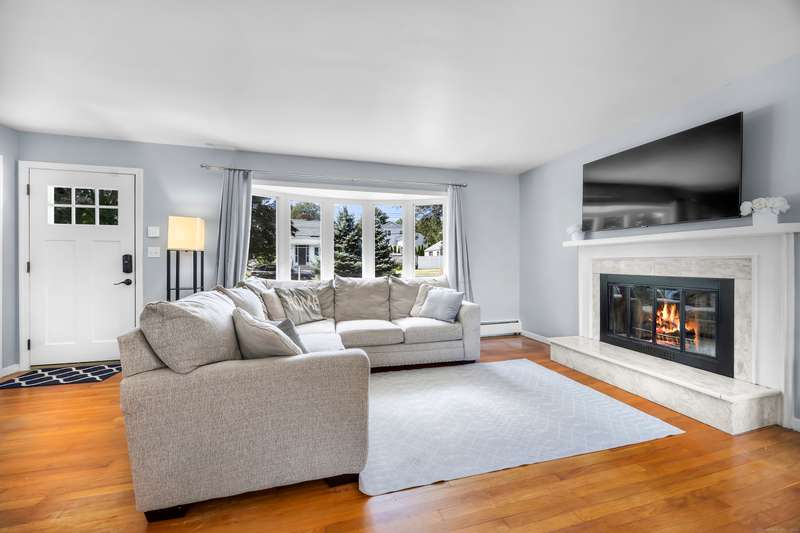 Welcome to this bright and inviting 2-3 bedroom ranch, offering a flexible layout and move-in ready comfort. The main level features a spacious living room with a large bay window that fills the space with natural light and a cozy fireplace that anchors the room. The adjoining dining area flows into a cheerful kitchen with abundant cabinetry, new stainless steel appliances, and a center island, making it the perfect hub for both everyday meals and entertaining. Two well-sized bedrooms and a full bath complete this level, all accented by warm hardwood floors and fresh, neutral tones. The finished lower level has its own private entrance and offers endless versatility. A den or playroom, as well as a private room with full-sized closet that easily serves as a 3rd bedroom, office, or gym, plus a full bathroom with shower, provide options to fit any lifestyle. Bright windows, updated flooring, and ample storage add to the appeal. Outside, enjoy a level backyard with a raised deck for grill