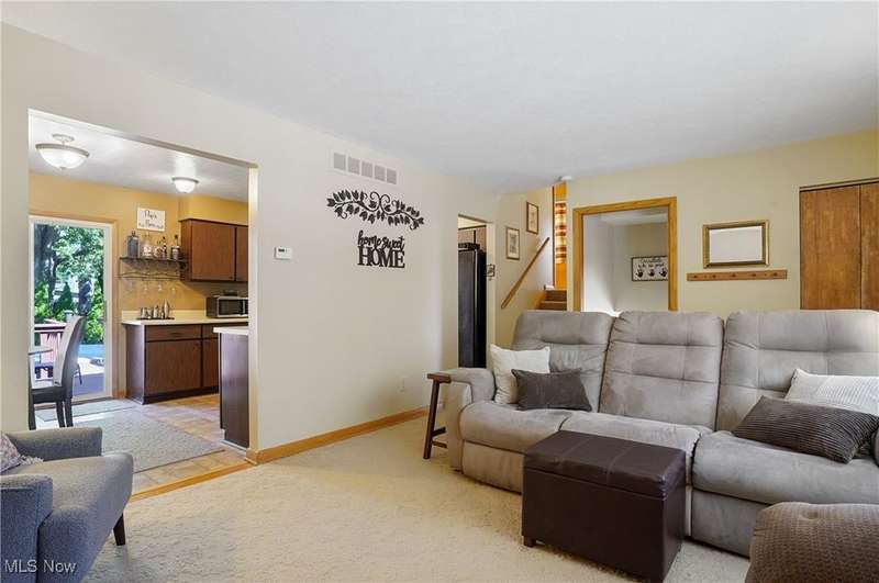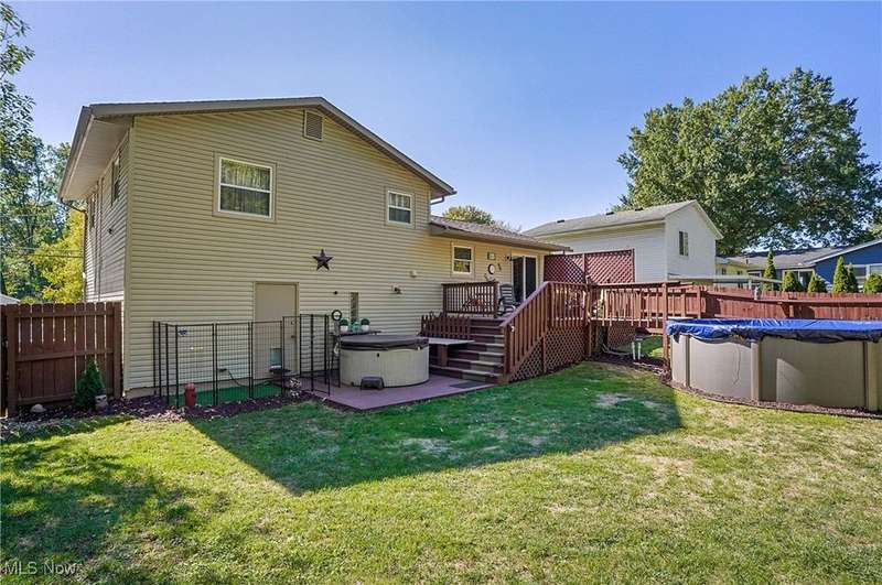 It just feels like home! This lovingly, cared-for home has an inviting covered front porch that greets you...perfect forenjoying this fall weather. The open floor plan with the living, dining area and kitchen on the main level is the perfect place to gather for meals, movies and more. The kitchen, with all appliances included, has an abundance of cabinet space and an added sideboard for extra storage and counter space. A patio door off the eating area leads you to the spacious deck (furniture included) overlooking the private, fenced backyard with shed for storage. (The solar heated pool can be removed by seller at seller's expense prior to closing if buyer so chooses. The second-floor features three large bedrooms, all with hardwood floors and plenty of closet space, and a roomy updated full bath off the hallway. The lower-level family room is easily closed off to the main level with the addition of a pocket door. The family room, also with hardwood floors, has a vinyl flooring that can easily be lifted out of place. This floor has also been thoughtfully redesigned to accommodate a full bath also with a pocket door. The basement features a large laundry area and plenty of space for either a workshop and/or storage. The one car garage has extra space for storage, a man door leading to the backyard, as well as an extra parking pad off to the side to accommodate a second vehicle. This quality-built home with hardwood floors throughout also features a newer hot water tank (2024), furnace and A/C (2015), and updated vinyl siding and roof. There is nothing to do here but move in and enjoy!