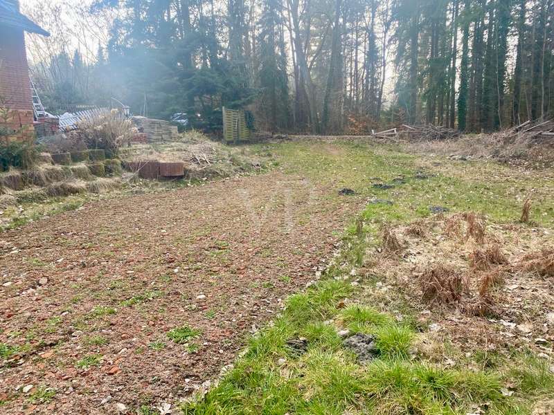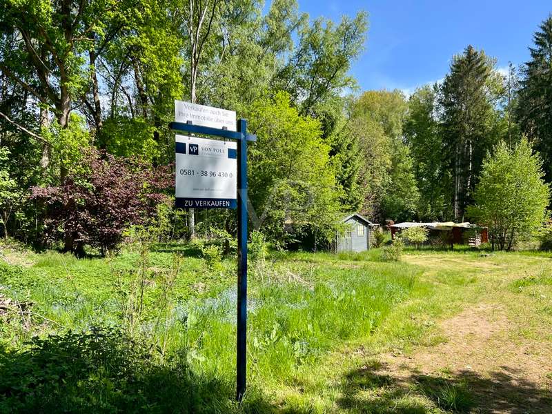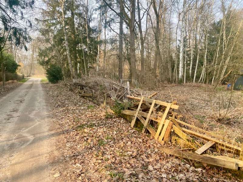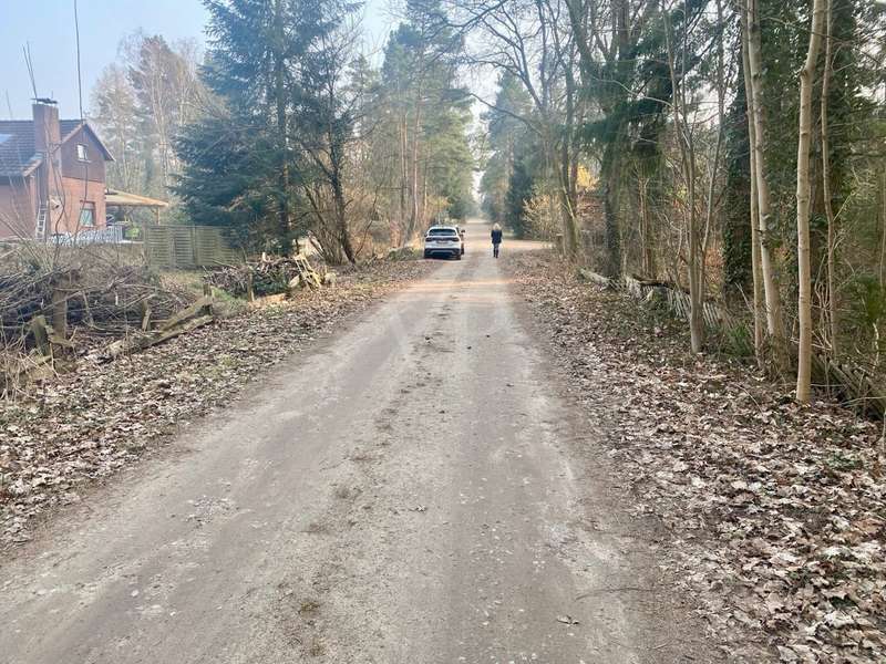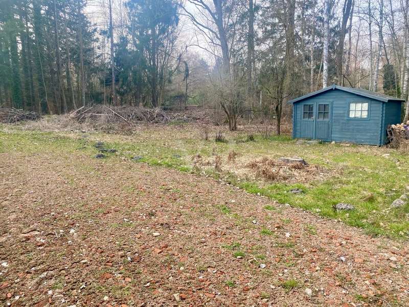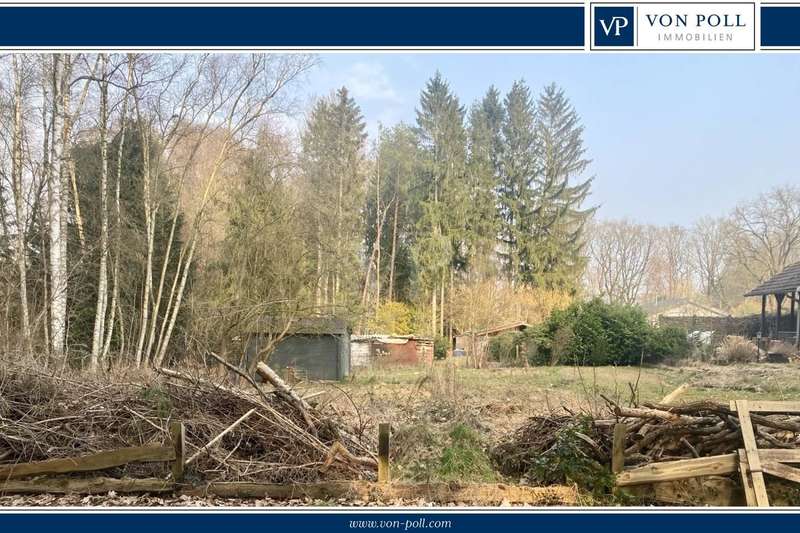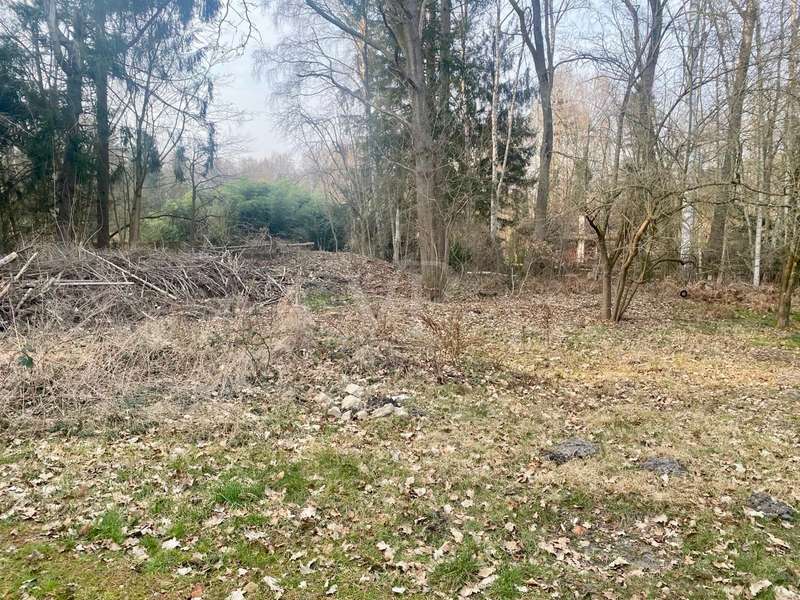 The approx. 1300 m² plot is located in an original weekend house area that has been converted into a purely residential area. There is a small garden shed on the plot. The driveway and a parking space have been paved with gravel. Some trees have already been cut down. Development with a residential house is possible.
