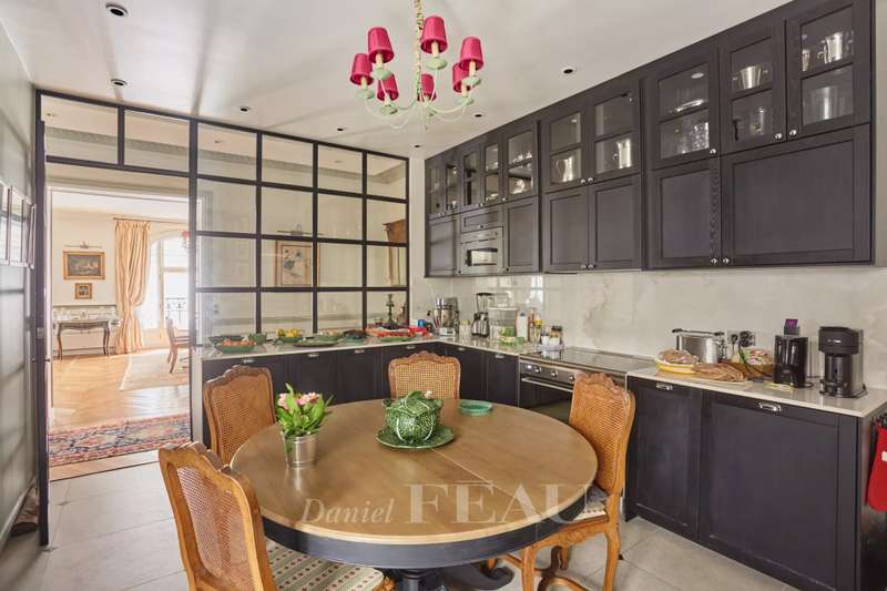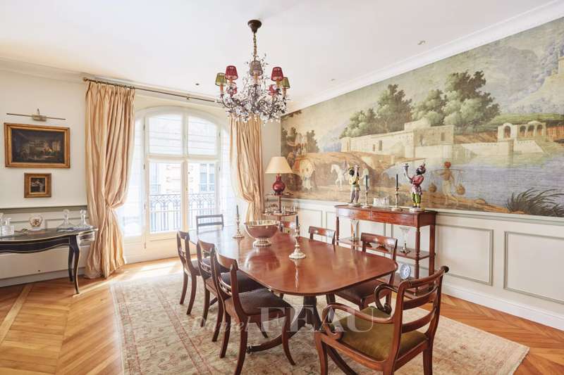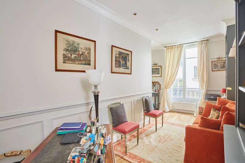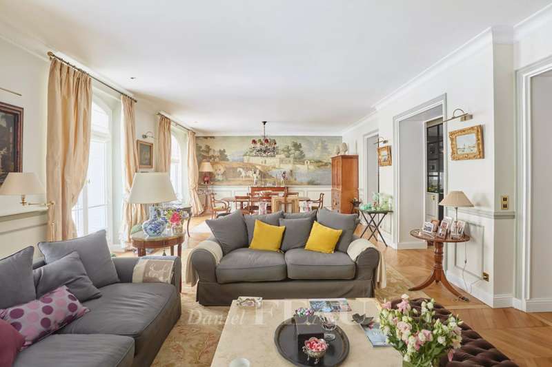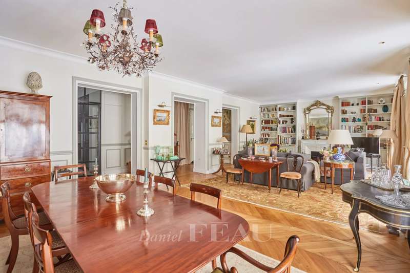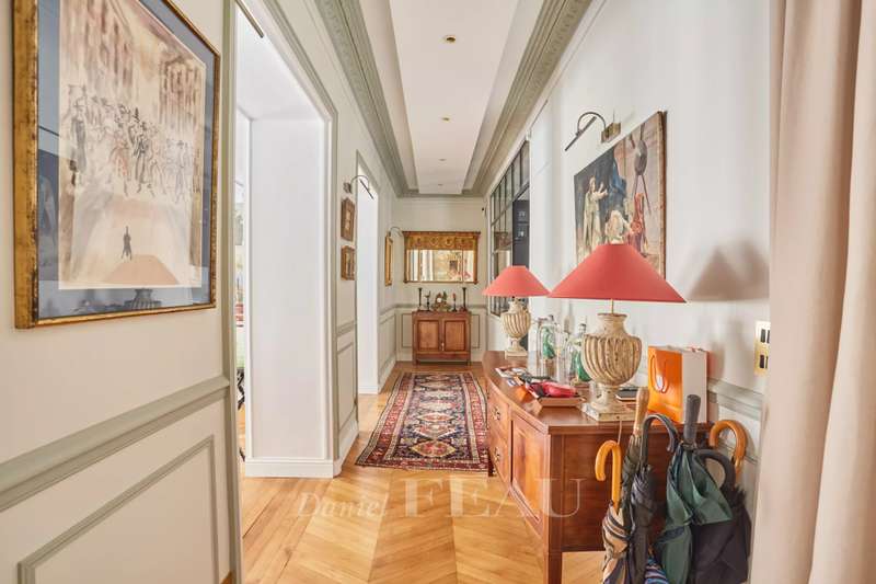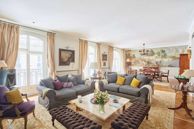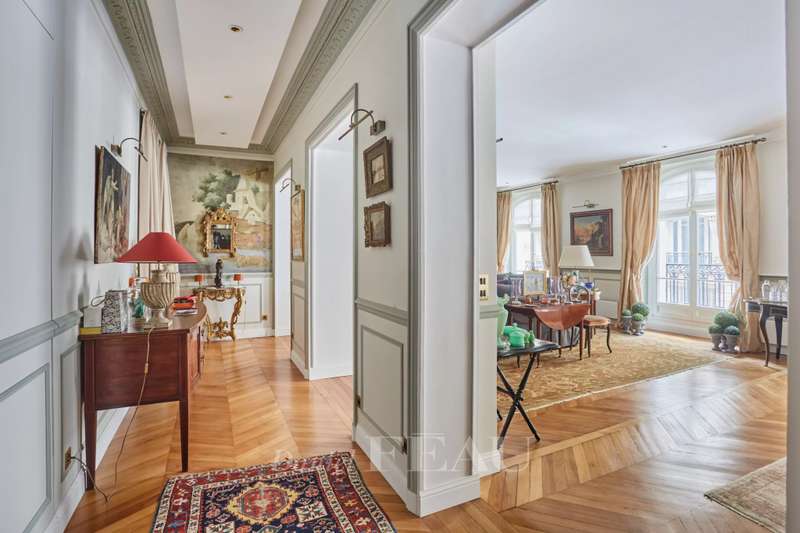This superb apartment on the 1st floor of a fine Haussmannian building offers 181 sqm of living space which has been renovated throughout by an interior decorator. Featuring parquet flooring, mouldings and a fireplace, it includes an entrance hall, a 70 sqm triple living/reception room, a spacious kitchen with dining facilities, a suite with a study, a bathroom and a dressing room, a guest bedroom with a bathroom, and two wc. With two maid’s bedrooms (13.01 and 8.51 sqm of living space as defined by the Carrez Law) and two cellars. Air conditioning.