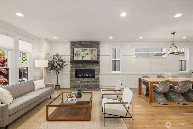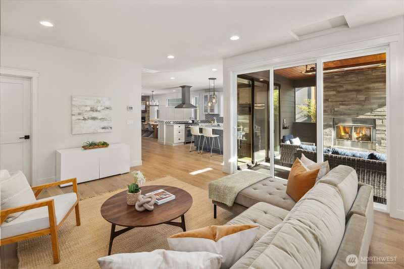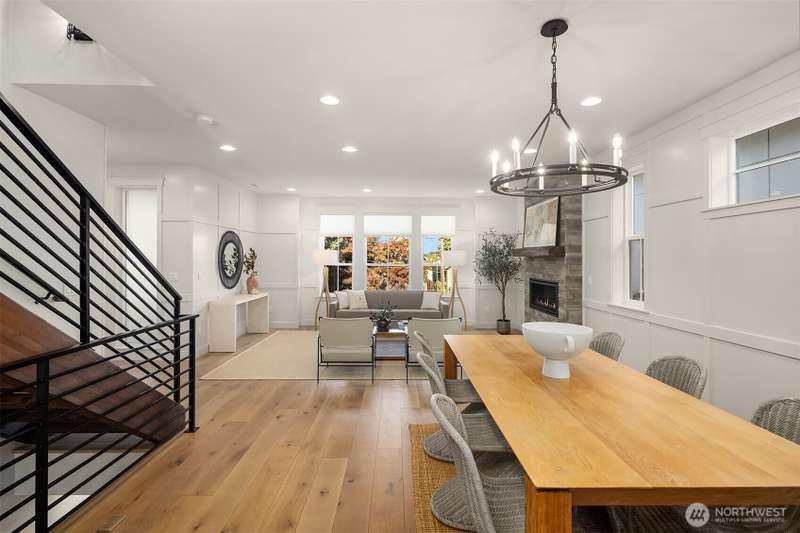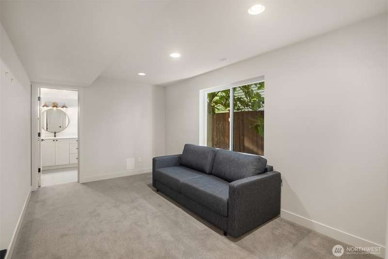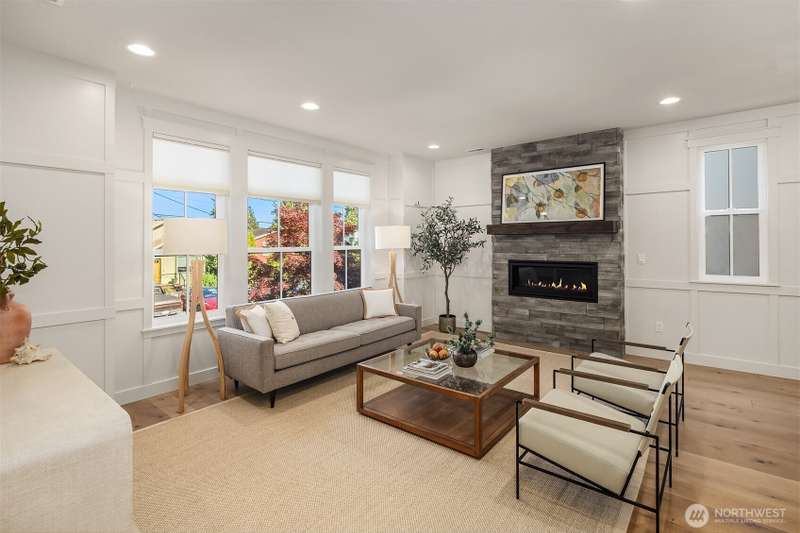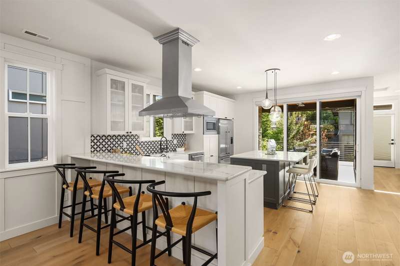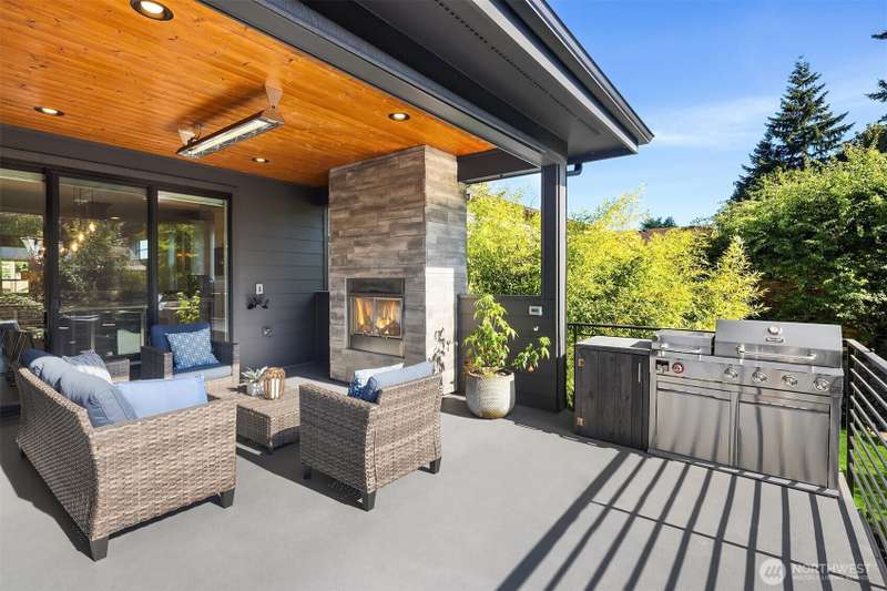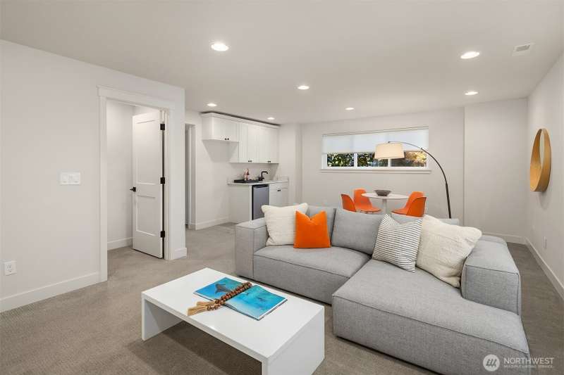 This jewel of Crown Hill is a modern farmhouse in the heart of the neighborhood. Well appointed throughout, it features a spacious open main floor with a gas fireplace in the living room, formal dining, and a sleek kitchen w/ high end appliances. Covered and heated patio includes a fireplace and outdoor range, plus a bonus room and half bath off the kitchen. Private office near the entry is ideal for working from home. Luxury plank floors throughout. Upstairs has a lush primary suite, two beds, full bath, and laundry. Downstairs can be rental, MIL, or guest suite w/ 2 beds, wet bar, plumbed for wd, and own entrance. Big 2 car garage and extra alley parking. You’ll love how the space flows, it's really setup well.