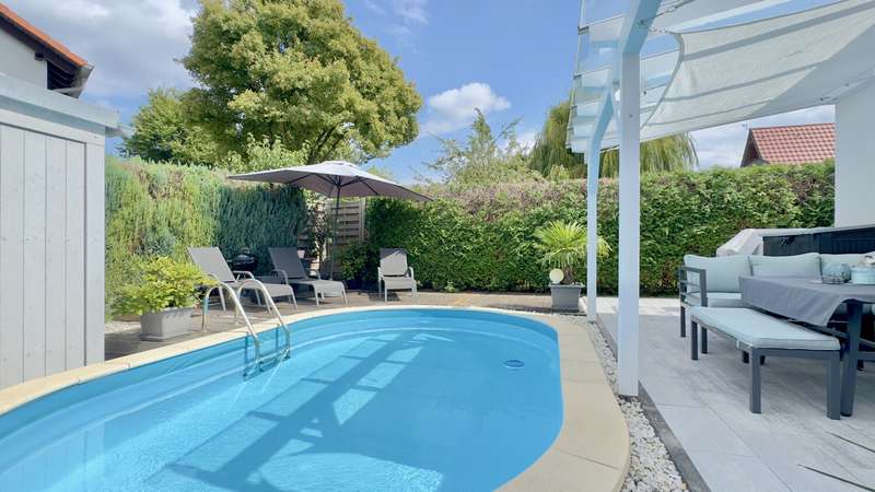 Harmonious living in Nägelestal - peace, comfort and proximity to the city center A real residential gem awaits you in the middle of the idyllic Nägelestal valley: this tastefully modernized semi-detached house combines the best of both worlds - the tranquillity of a mature residential area with direct proximity to the city. A home that is more than just four walls - a place to arrive, live and feel good. The location? Wonderfully relaxed and yet with excellent connections: Only a few minutes separate you from the S-Bahn connection and the A8 highway - ideal for commuters or day-trippers. The Ludwig-Uhland-Gymnasium is also within walking distance - a real plus for families with school-age children. With around 123 m² of living space and a generous plot of approx. 419 m², this house offers numerous possibilities - for couples, families or self-employed people who want to combine living and working under one roof. A total of 6.5 versatile rooms, including four bright bedrooms, create space for individuality and retreat in equal measure. One highlight is the high-quality, modernized bathroom - stylish, functional and state-of-the-art. It is complemented by a practical shower room with WC - perfect for your guests from near and far. The converted attic offers further scope for design: an existing water connection in one of the rooms makes it easy to set up another kitchen or an additional bathroom - entirely according to your needs. The living area on the first floor welcomes you with spaciousness, brightness and direct access to the newly covered terrace. The lovingly designed garden with its modern pool area becomes a private oasis - a retreat that promises a vacation feeling in everyday life. The new high-quality, custom-made fitted kitchen blends seamlessly into the stylish room concept and meets high standards - including high-quality electrical appliances and clever storage space solutions. The offer is complemented by a modern tool shed and a spacious carport - convenience that makes everyday life easier. The house was originally built in 1956 and extended in 1976 with a massive extension. Since then, it has been continuously maintained and modernized - which is clearly reflected in its excellent overall condition. The roof with its engobed tiles and the associated insulation date back to 2005, while the façade has been partially insulated and completely painted. Together with the centrally controlled heating system, this ensures modern living comfort. A home that impresses with its atmosphere and quality: timeless design and solid construction combine to create a natural, harmonious living space - embedded in a location that offers a sense of security and excellent connections. Take a tour and see for yourself the many loving details and the special living comfort.