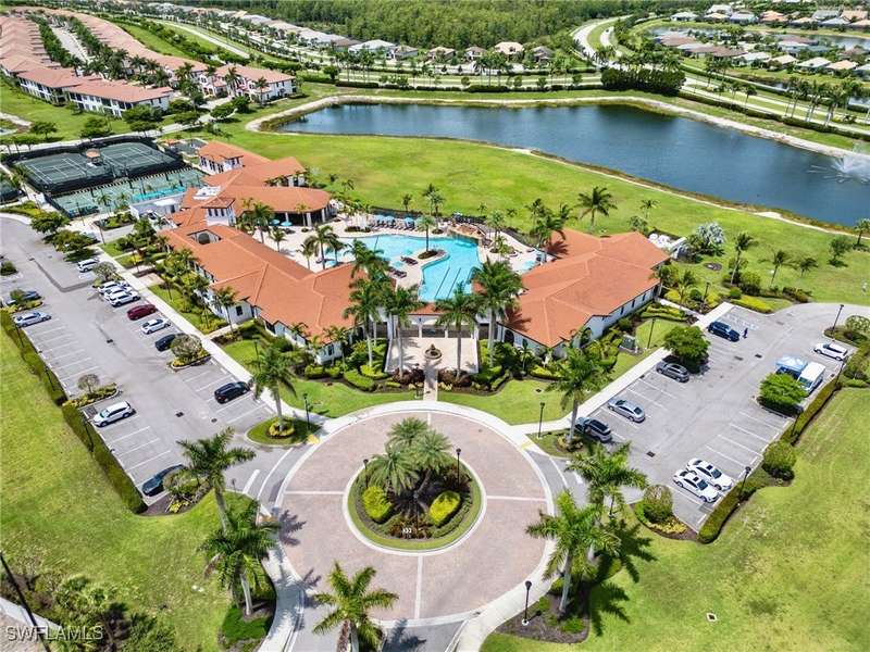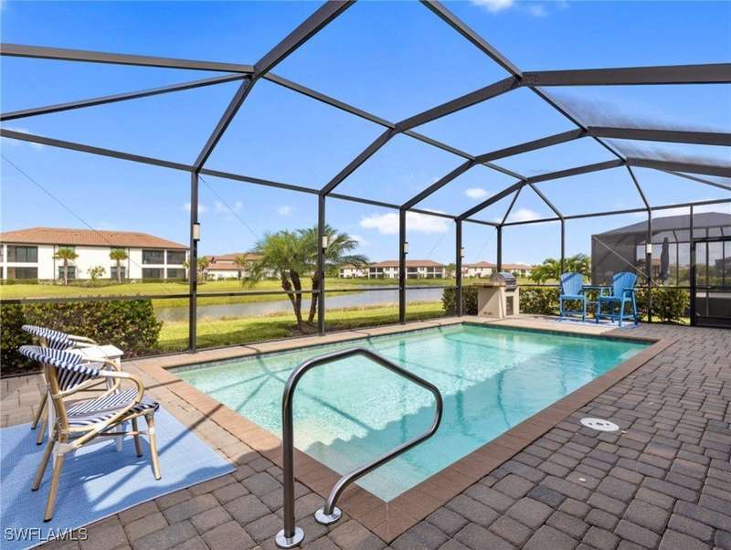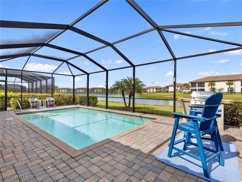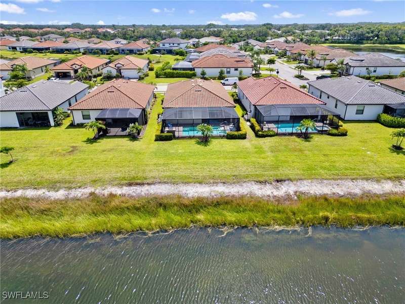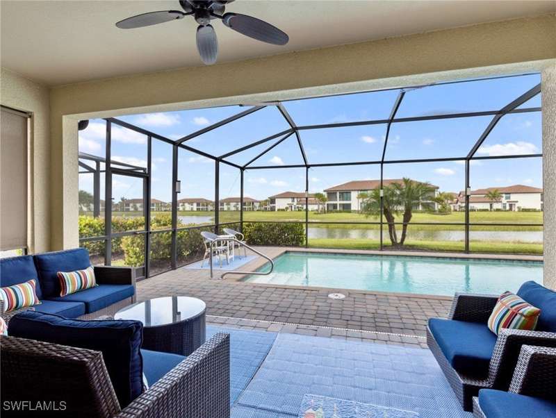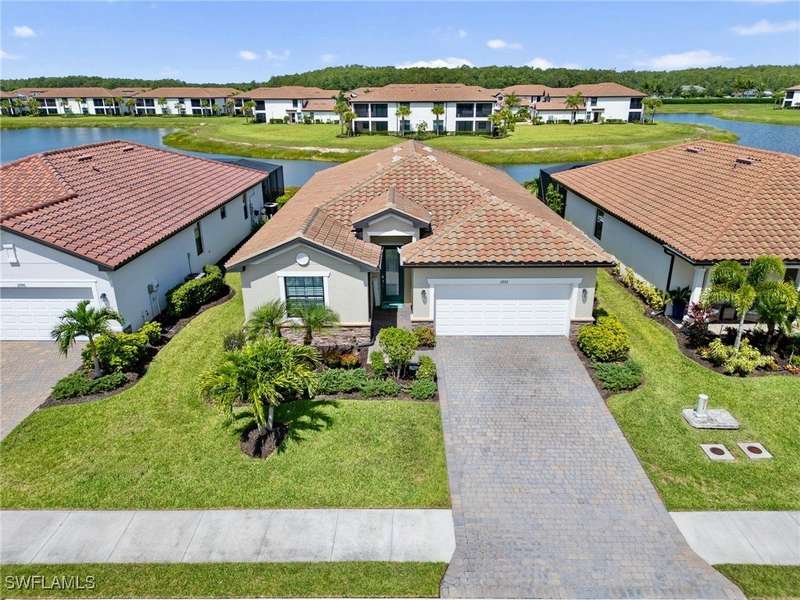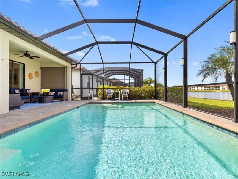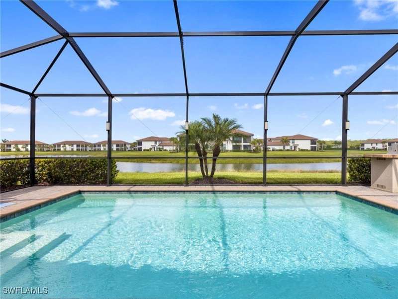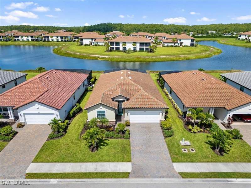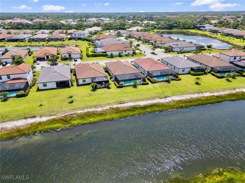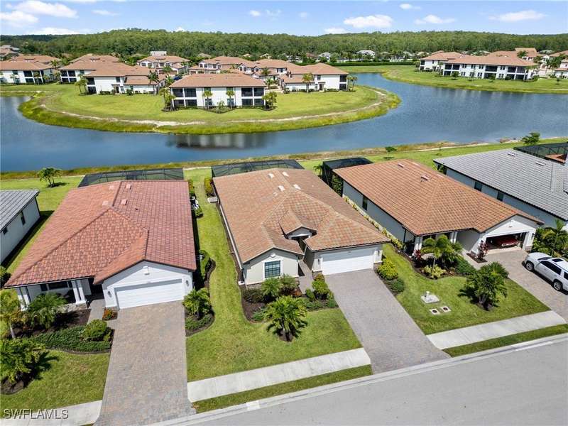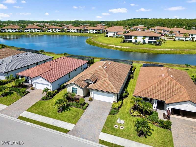 Waterfront views and stunning sunsets are included with this "Trevi" model home in the amazing resort-style gated community of Arborwood Preserve. Nestled up to a large lake, this 3 bedroom 3 bath + den "pool" home is a rare find at this price in Arborwood! Designer upgrades are abundant in this home. As you enter through the glassed etched front door, soaring volume ceilings add space and light. Tile flows through the main living area and carpet in the bedrooms. Plantation shutters, glass french doors, and crown molding add style. Large center island in the kitchen with granite countertops and pendant lighting creates a great place for family to gather. Designer fans throughout the home are a plus. Outside is a dream - long range water views combined with the tranquility of the pool create the perfect space to relax. Add in the summer kitchen, exterior lighting, and several spots to entertaining guests and this could become your favorite spot of the home! Whole house Kinetico water treatment system and epoxied garage floor are a bonus. A short walk to the award winning Arborwood Preserve Town Center featuring a resort-style pool, restaurant and bar, coffee and reading lounge, fitness center, lighted pickleball and tennis courts, art studio, library, movie theatre and so much more. Close to fine dining, world class shopping, Gulf Coast Town Center, Miromar Outlets, Hertz Arena, pristine sandy beaches, Spring Training stadiums of the Boston Red Sox and Minnesota Twins, and the SWFL International Airport. You are now HOME!