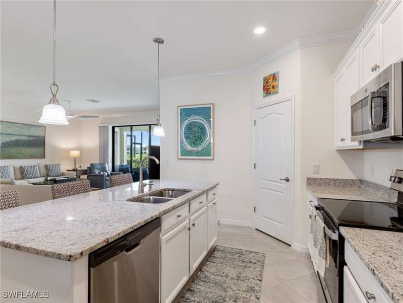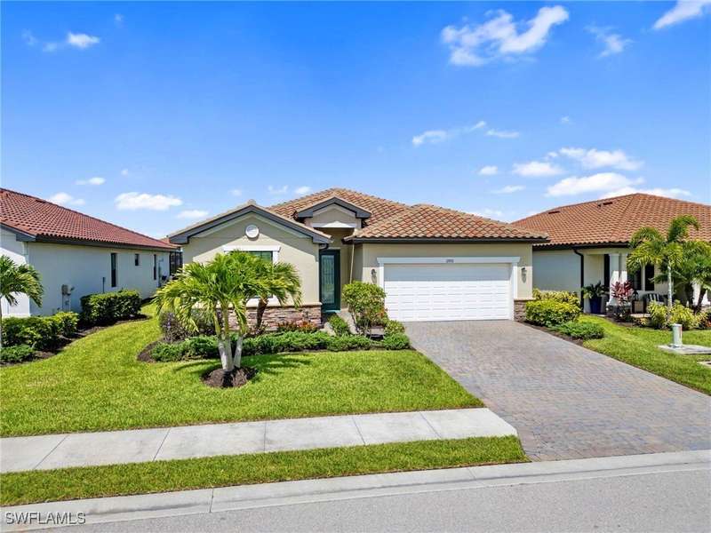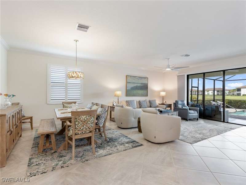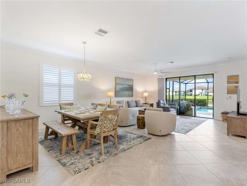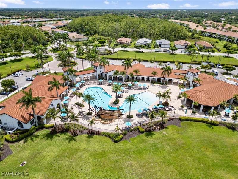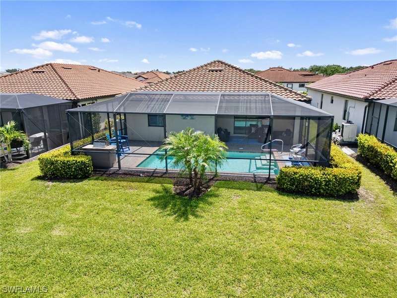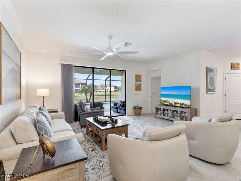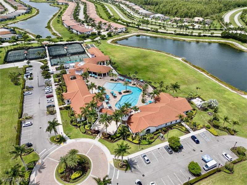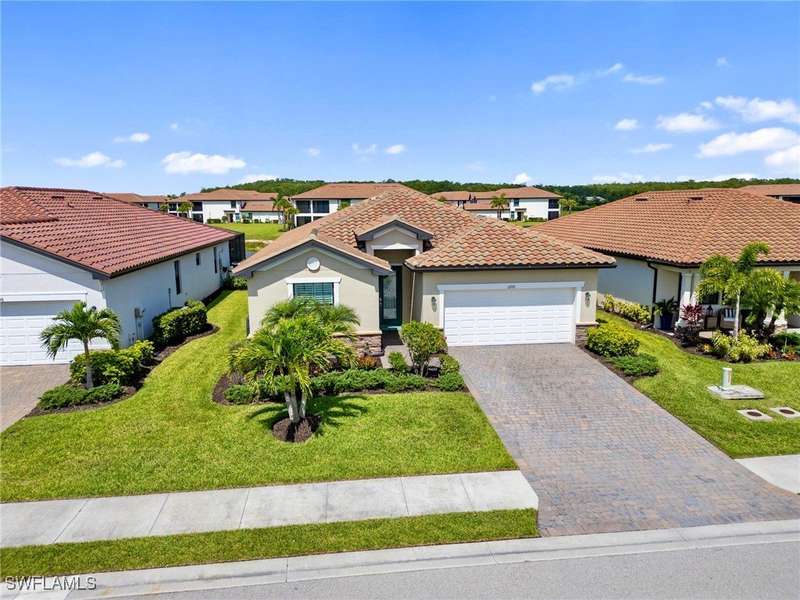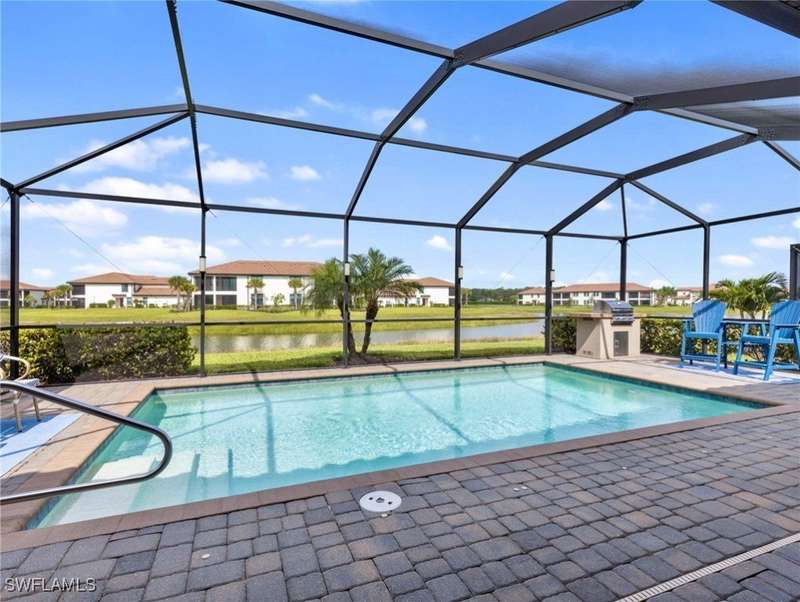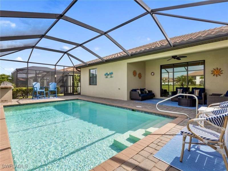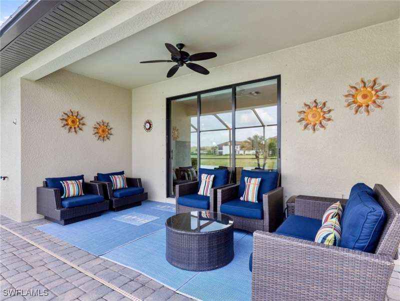 Waterfront views and stunning sunsets are included with this "Trevi" model home in the amazing resort-style gated community of Arborwood Preserve. Nestled up to a large lake, this 3 bedroom 3 bath + den "pool" home is a rare find at this price in Arborwood! Designer upgrades are abundant in this home. As you enter through the glassed etched front door, soaring volume ceilings add space and light. Tile flows through the main living area and carpet in the bedrooms. Plantation shutters, glass french doors, and crown molding add style. Large center island in the kitchen with granite countertops and pendant lighting creates a great place for family to gather. Designer fans throughout the home are a plus. Outside is a dream - long range water views combined with the tranquility of the pool create the perfect space to relax. Add in the summer kitchen, exterior lighting, and several spots to entertaining guests and this could become your favorite spot of the home! Whole house Kinetico water treatment system and epoxied garage floor are a bonus. A short walk to the award winning Arborwood Preserve Town Center featuring a resort-style pool, restaurant and bar, coffee and reading lounge, fitness center, lighted pickleball and tennis courts, art studio, library, movie theatre and so much more. Close to fine dining, world class shopping, Gulf Coast Town Center, Miromar Outlets, Hertz Arena, pristine sandy beaches, Spring Training stadiums of the Boston Red Sox and Minnesota Twins, and the SWFL International Airport. You are now HOME!