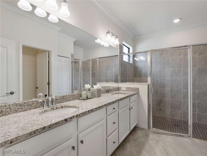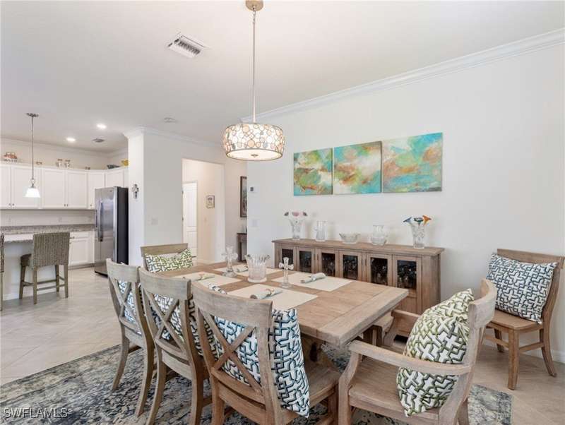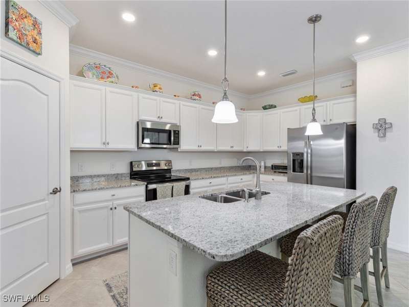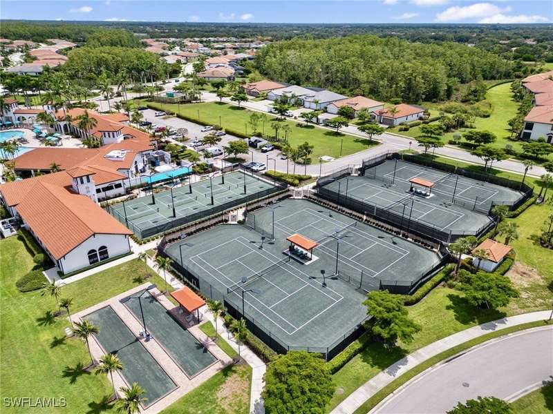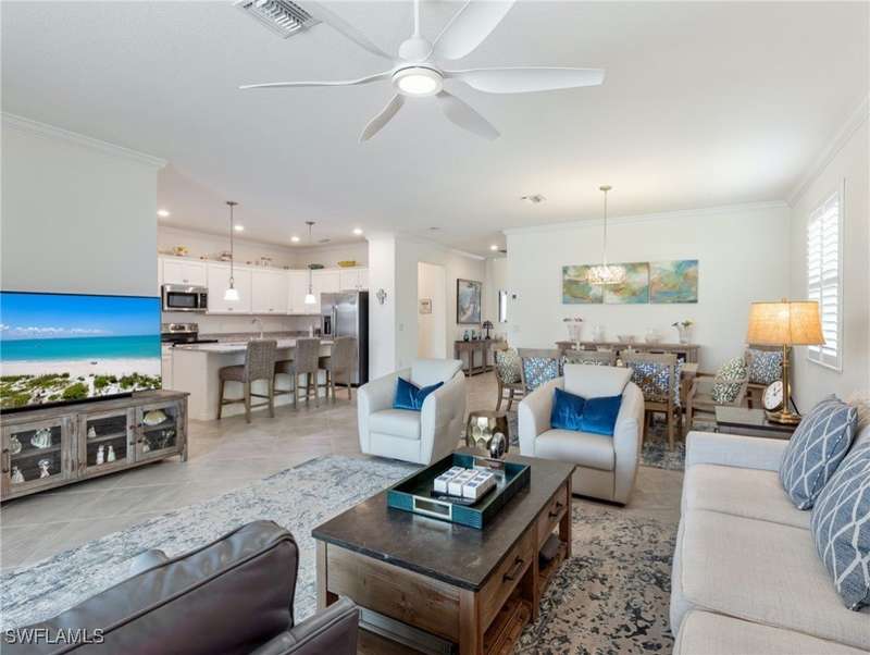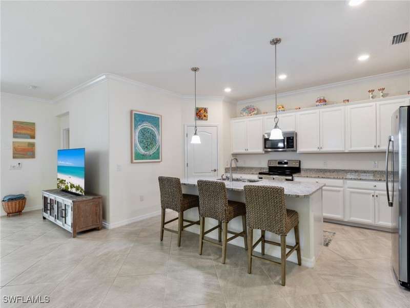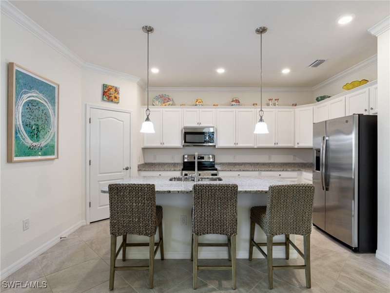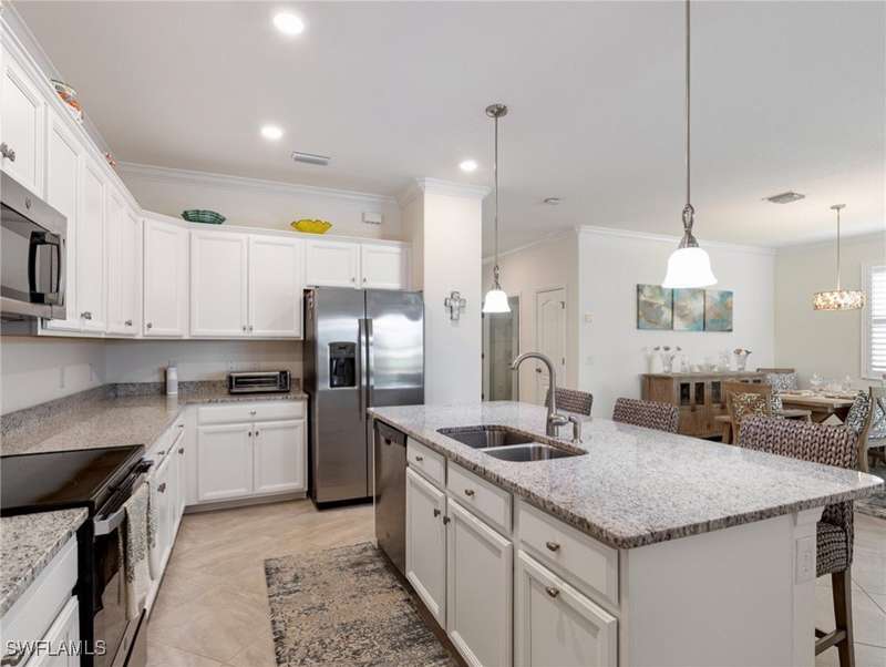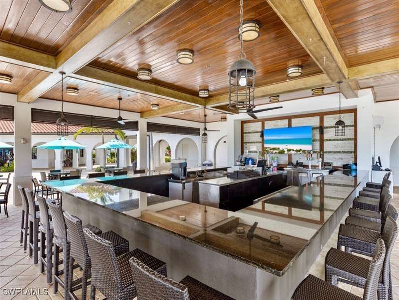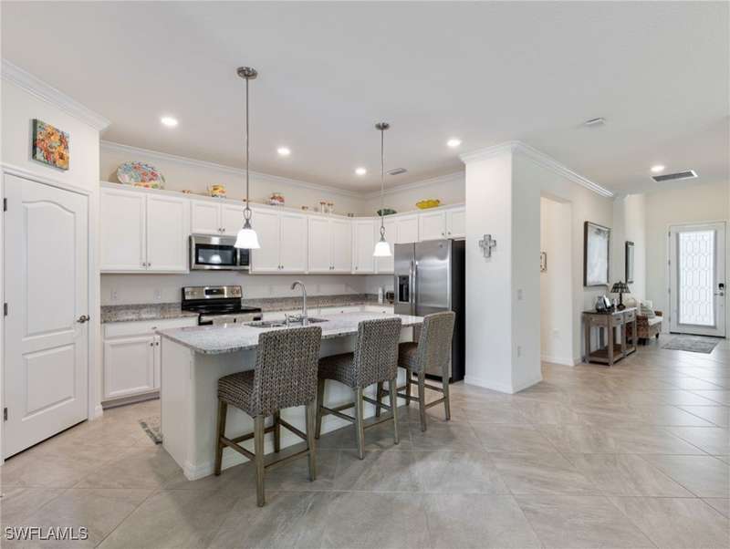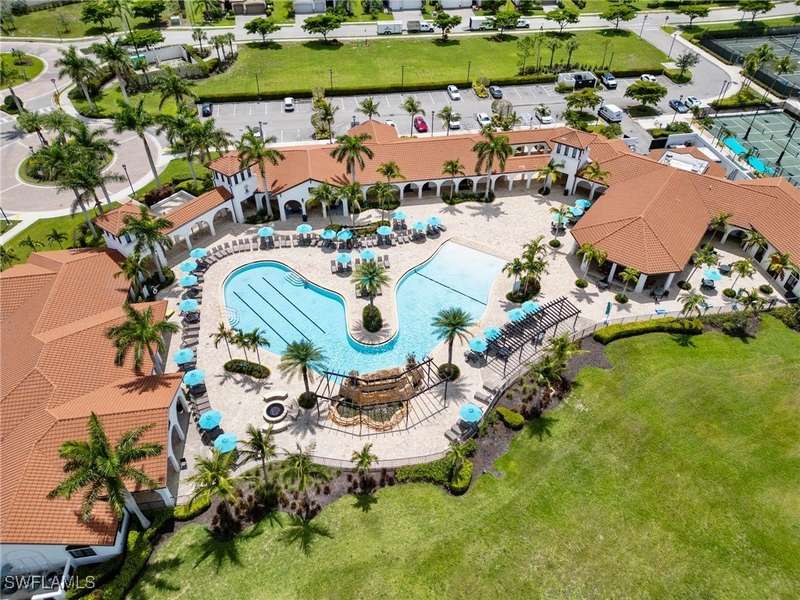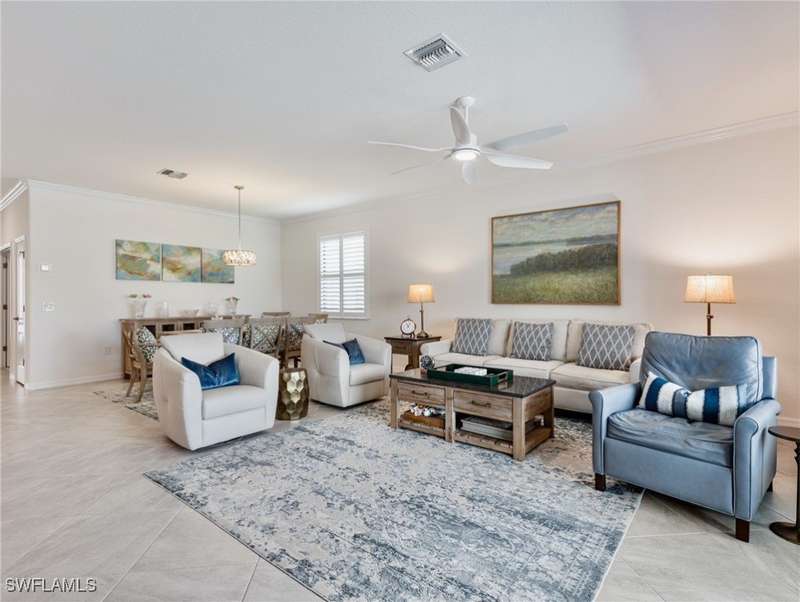Waterfront views and stunning sunsets are included with this "Trevi" model home in the amazing resort-style gated community of Arborwood Preserve. Nestled up to a large lake, this 3 bedroom 3 bath + den "pool" home is a rare find at this price in Arborwood! Designer upgrades are abundant in this home. As you enter through the glassed etched front door, soaring volume ceilings add space and light. Tile flows through the main living area and carpet in the bedrooms. Plantation shutters, glass french doors, and crown molding add style. Large center island in the kitchen with granite countertops and pendant lighting creates a great place for family to gather. Designer fans throughout the home are a plus. Outside is a dream - long range water views combined with the tranquility of the pool create the perfect space to relax. Add in the summer kitchen, exterior lighting, and several spots to entertaining guests and this could become your favorite spot of the home! Whole house Kinetico water treatment system and epoxied garage floor are a bonus. A short walk to the award winning Arborwood Preserve Town Center featuring a resort-style pool, restaurant and bar, coffee and reading lounge, fitness center, lighted pickleball and tennis courts, art studio, library, movie theatre and so much more. Close to fine dining, world class shopping, Gulf Coast Town Center, Miromar Outlets, Hertz Arena, pristine sandy beaches, Spring Training stadiums of the Boston Red Sox and Minnesota Twins, and the SWFL International Airport. You are now HOME!