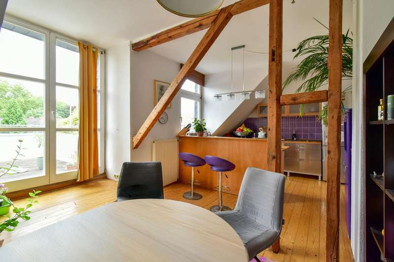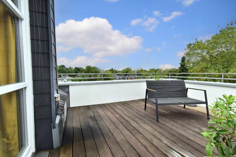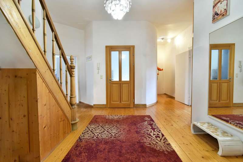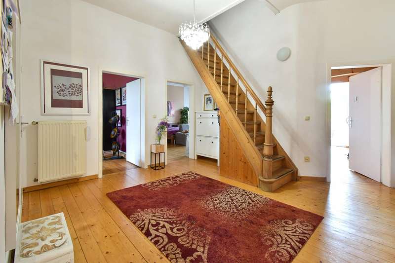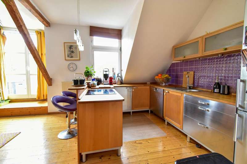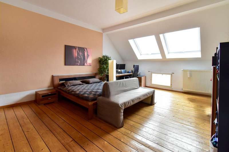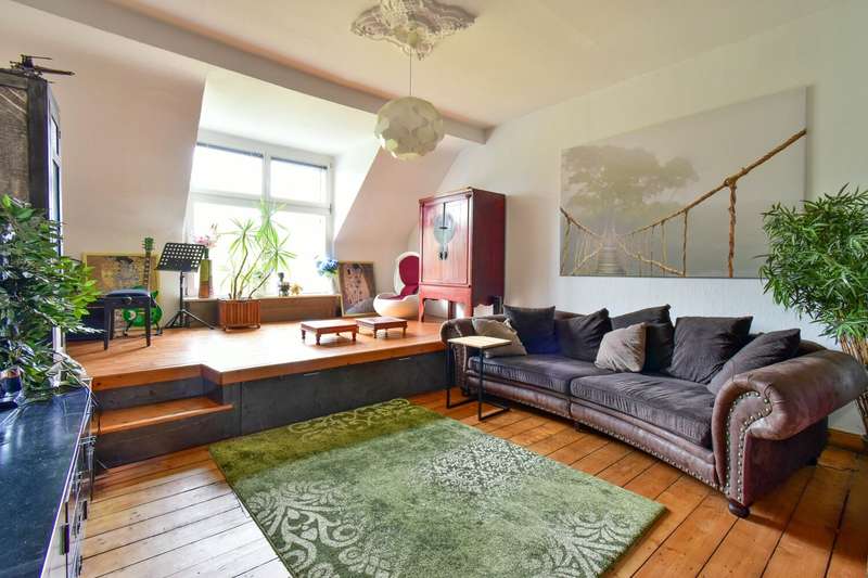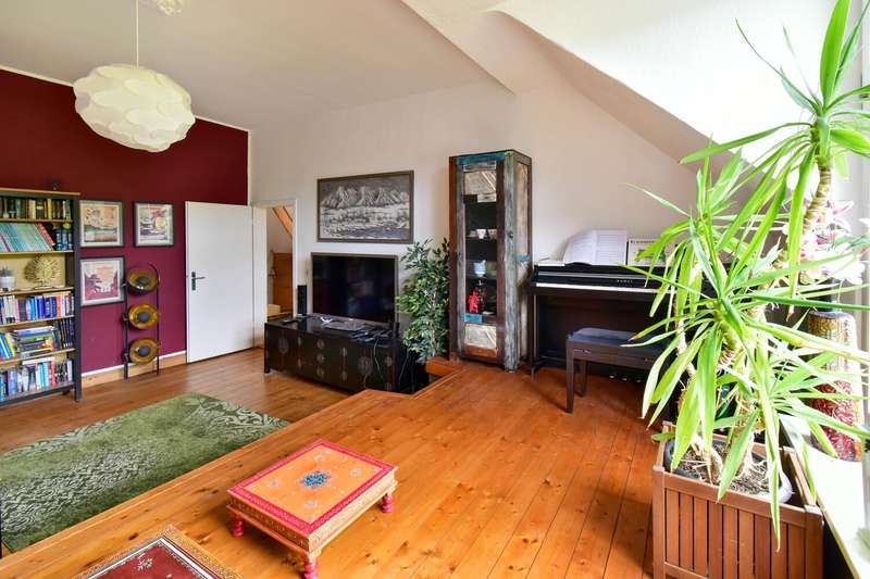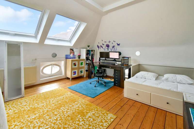 This special maisonette apartment with a generous living space of approx. 183 m² is located in a charming old building from 1905 with only three residential units. The historic character of the building is harmoniously combined with modern living comfort, creating a home full of personality. The beautiful floorboards catch the eye as soon as you enter, giving the entire apartment a warm, inviting atmosphere. All rooms are practically accessible from the hallway. The eat-in kitchen on the top floor forms the heart of everyday life. Under cozy sloping ceilings, you can not only cook here, but also enjoy time together. From there, you have direct access to the roof terrace, which was redesigned in 2024 and has an area of over 16 m² - a perfect place for relaxing summer evenings or sunny breakfast moments. Directly adjacent is the bathroom, which was also renovated in 2024 and is equipped with a modern shower/bathtub and WC. The bedroom or living room impresses with a landing that is not only a visual highlight, but also creates clever storage space. The apartment also has a spacious living room and two further rooms, which are ideal for use as children's or guest rooms. The smaller room has direct access to an approx. 5 m² balcony and offers special charm for the youngest residents with an integrated play area. A practical guest WC completes the room offer and further enhances the living comfort. A staircase in the hallway leads up to the loft, which adds further possibilities to the maisonette. There is a study - perfect for a home office or creative projects - as well as another room that can be converted into living space. A well-kept communal garden and a private cellar room round off the offer. In addition, further cellar rooms (e.g. laundry room, cellar WC, tool room ...) are available to the building community for communal use. The apartment offers a home that harmoniously combines individuality, style and quality of living - and is just waiting to be discovered.