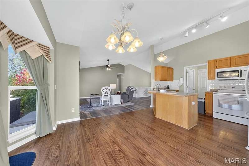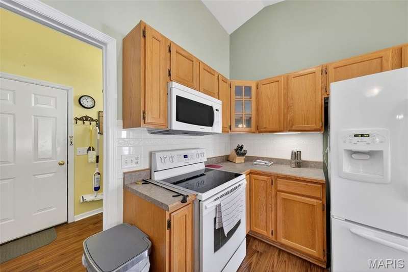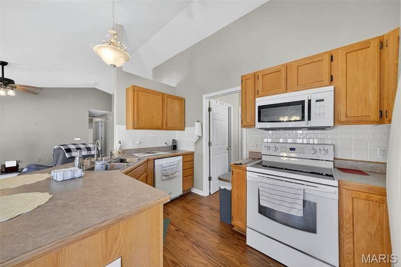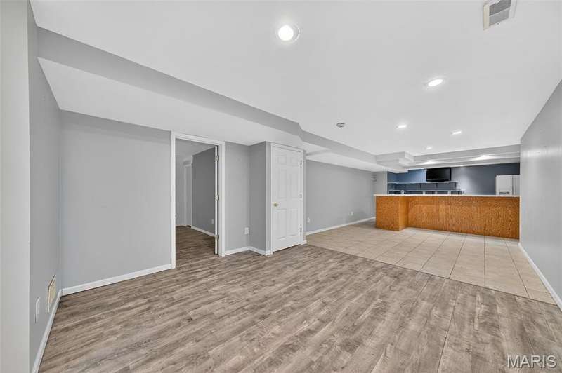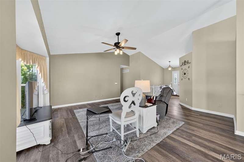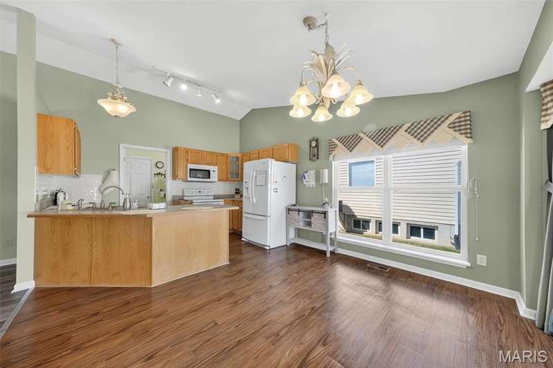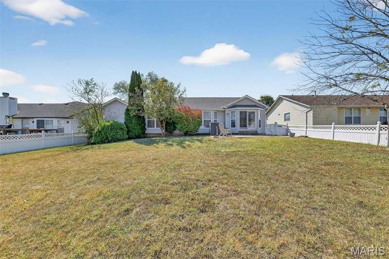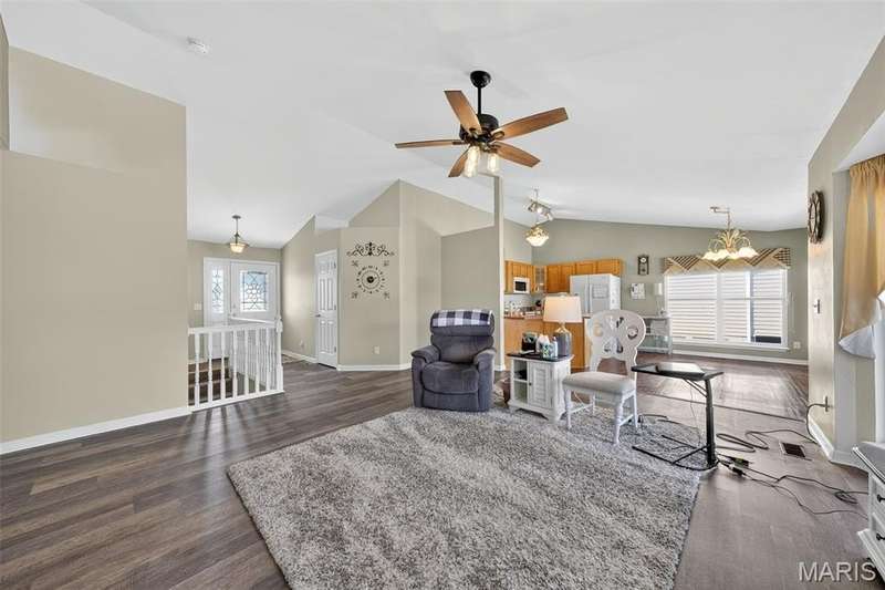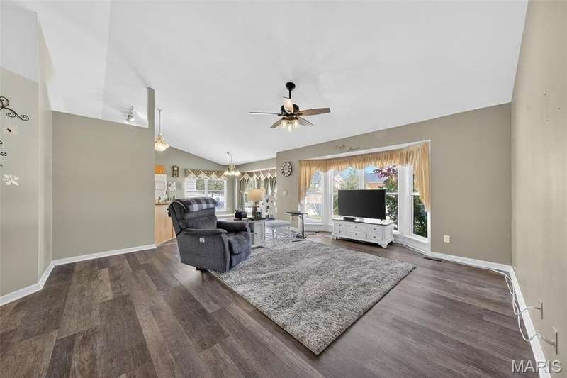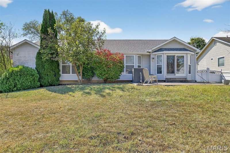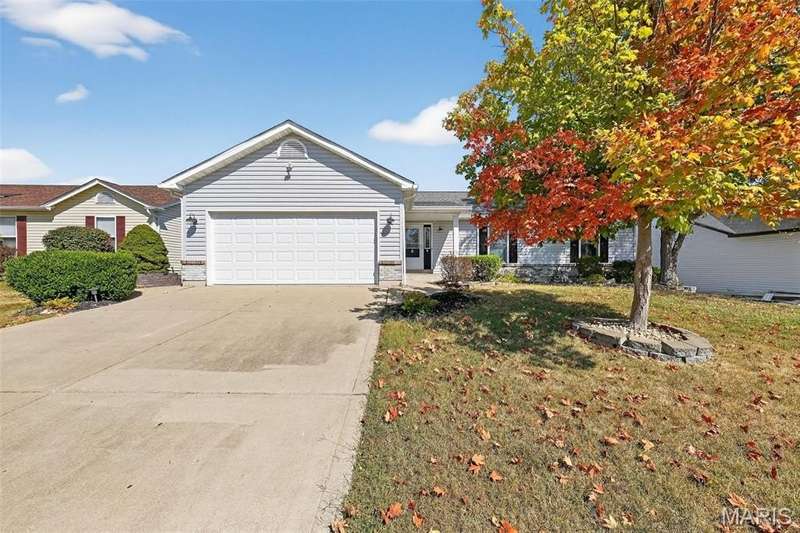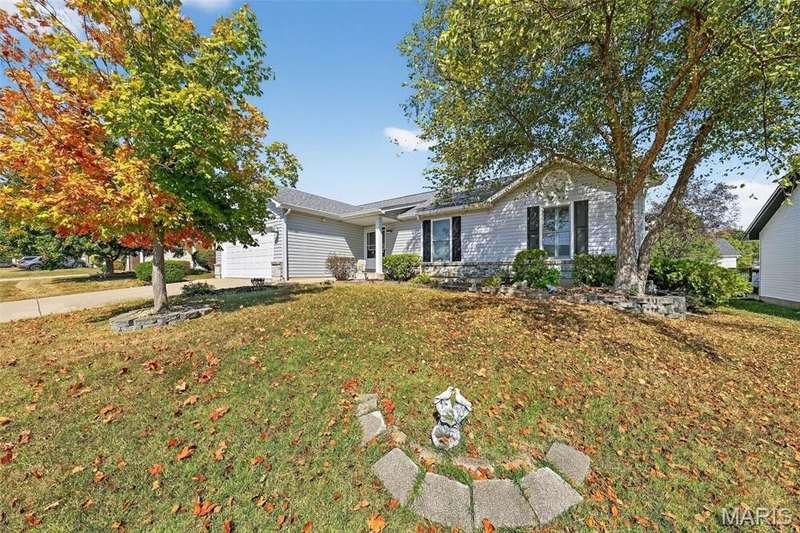Darling ranch home with NEW: ROOF, SIDING, GUTTERS & OVERHEAD GARAGE DOOR! Relax & sip your coffee on the covered front porch. Inside, discover a bright open floor plan, a neutral aesthetic, a spacious great room with soaring vaulted ceiling, newer flooring, plant shelf, and bay window. The kitchen offers a smooth-top range, refrigerator (stays), built-in microwave, and dishwasher, with ample cabinets, breakfast bar, plenty of counter space, and walk-in pantry. The dining area has a large bay window. Retreat to the primary suite, featuring vaulted ceilings, bay window, and a large walk-in closet. The primary bath has dual vanities, and a walk-in shower. The main floor also includes two other bedrooms, a hall bath, and laundry room (washer/dryer stay). The partially finished lower level includes a wet bar (refrigerator stays), huge recreation room, full bath (w/ a new toilet), a finished bonus room with walk-in closet, and a large unfinished storage room. Enjoy family gatherings in the fenced backyard, with room for kids and dogs to play. The oversized patio is perfect for fall BBQs and entertaining. 2-car garage with opener and full drywall. Ring camera stays. Easy access to highway, shopping, dining, and all the amazing Wentzville amenities. Welcome Home!
