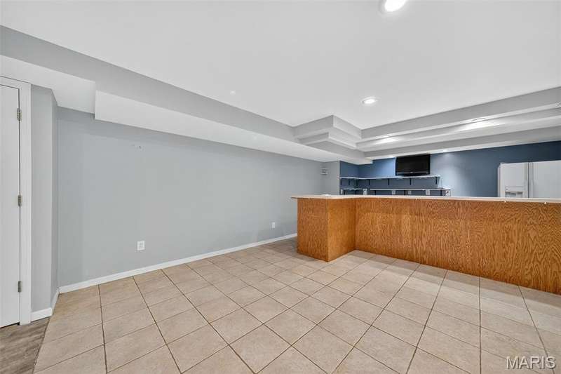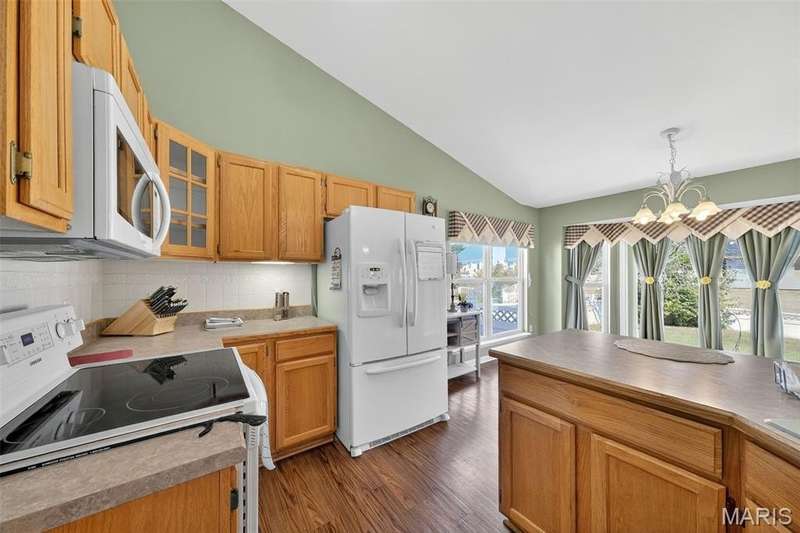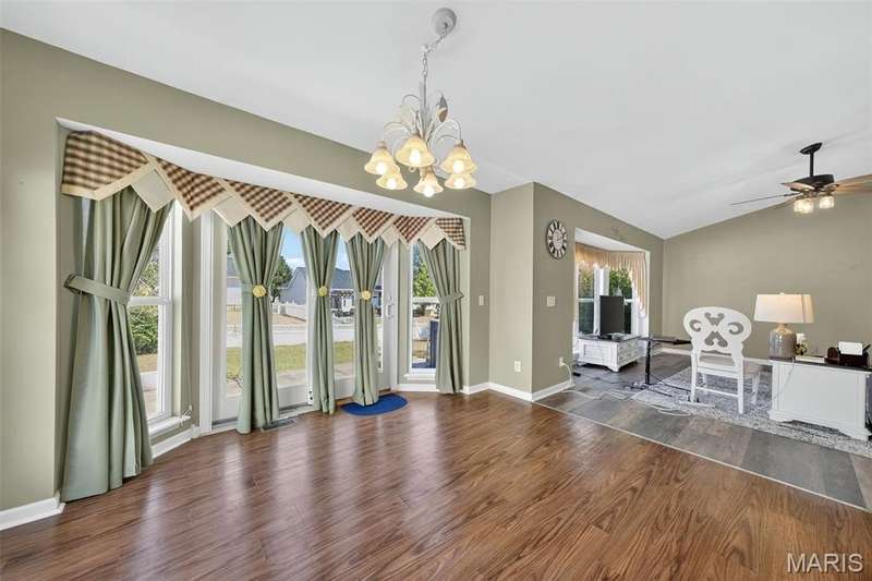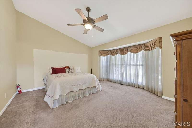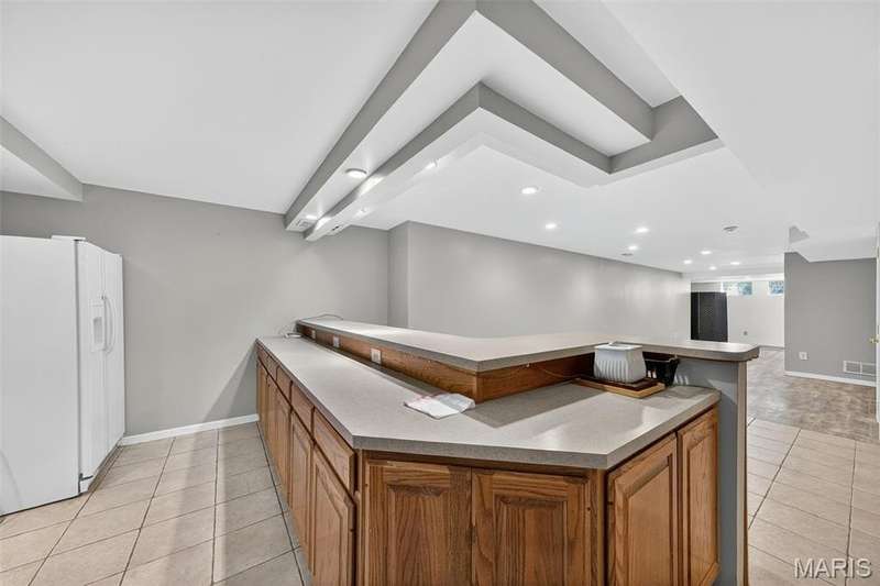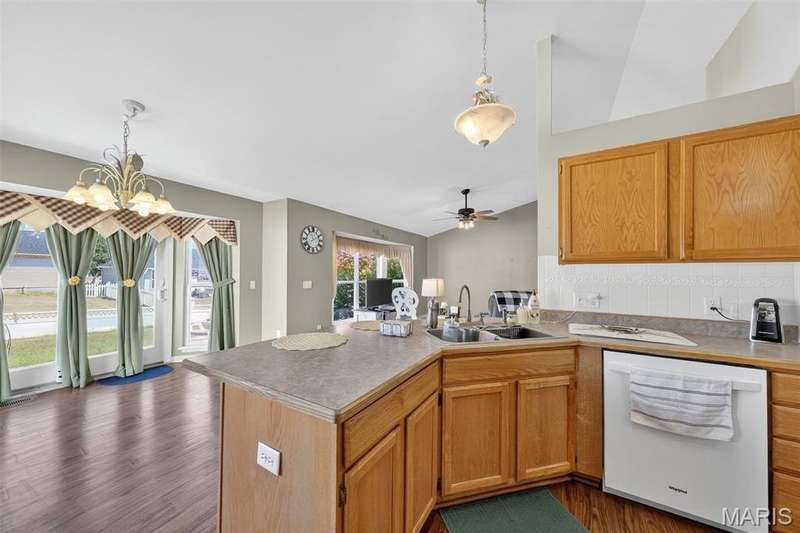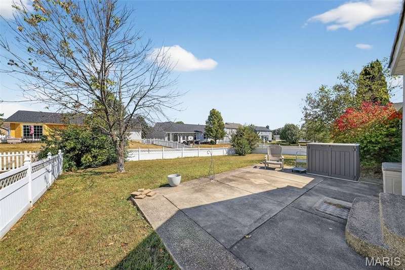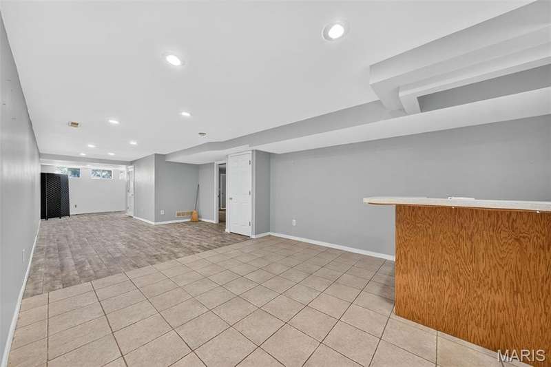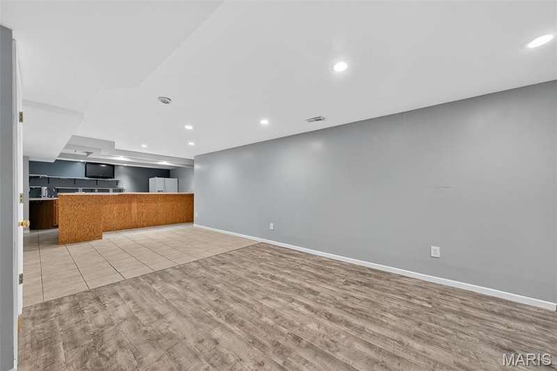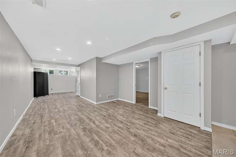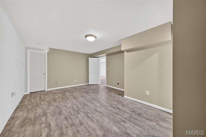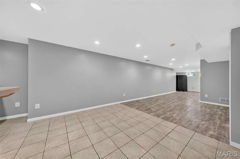 Darling ranch home with NEW: ROOF, SIDING, GUTTERS & OVERHEAD GARAGE DOOR! Relax & sip your coffee on the covered front porch. Inside, discover a bright open floor plan, a neutral aesthetic, a spacious great room with soaring vaulted ceiling, newer flooring, plant shelf, and bay window. The kitchen offers a smooth-top range, refrigerator (stays), built-in microwave, and dishwasher, with ample cabinets, breakfast bar, plenty of counter space, and walk-in pantry. The dining area has a large bay window. Retreat to the primary suite, featuring vaulted ceilings, bay window, and a large walk-in closet. The primary bath has dual vanities, and a walk-in shower. The main floor also includes two other bedrooms, a hall bath, and laundry room (washer/dryer stay). The partially finished lower level includes a wet bar (refrigerator stays), huge recreation room, full bath (w/ a new toilet), a finished bonus room with walk-in closet, and a large unfinished storage room. Enjoy family gatherings in the fenced backyard, with room for kids and dogs to play. The oversized patio is perfect for fall BBQs and entertaining. 2-car garage with opener and full drywall. Ring camera stays. Easy access to highway, shopping, dining, and all the amazing Wentzville amenities. Welcome Home!