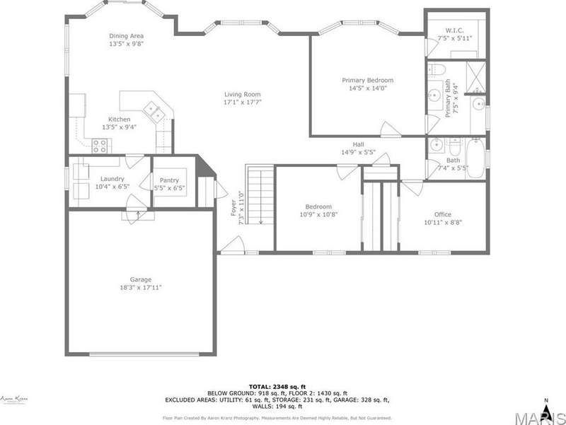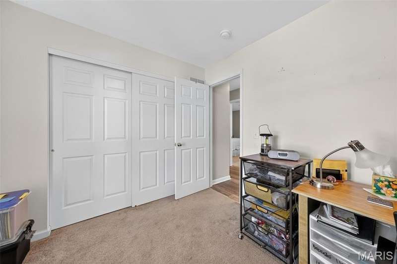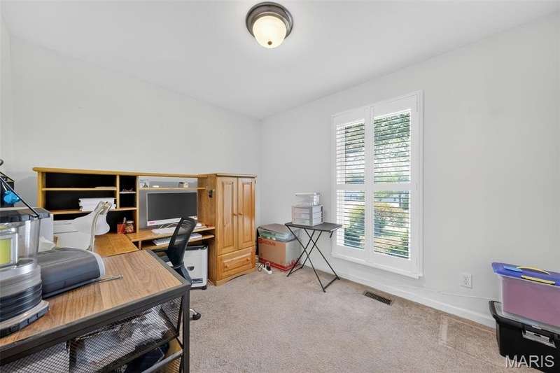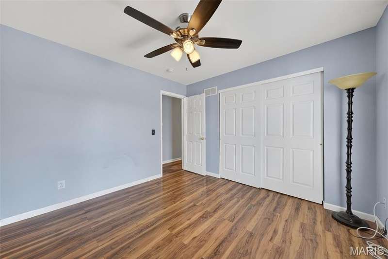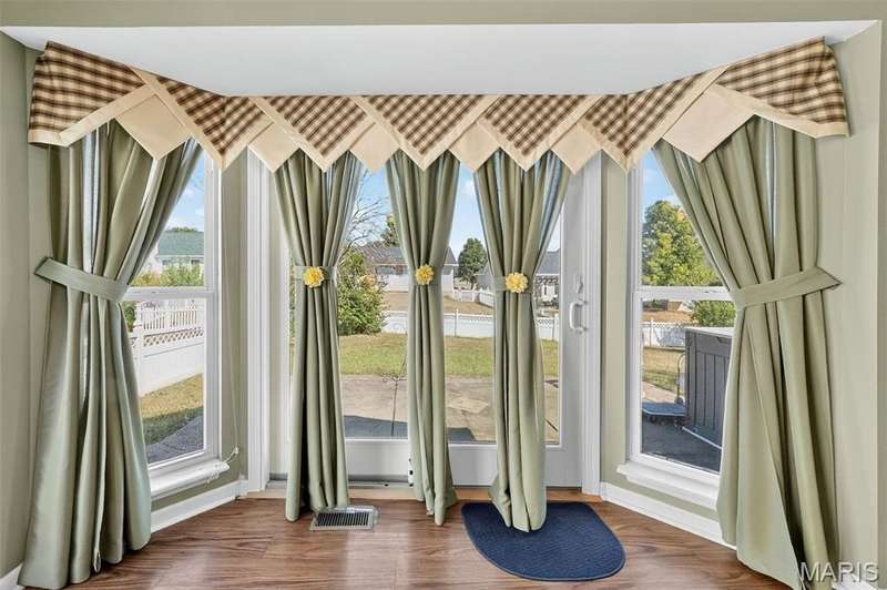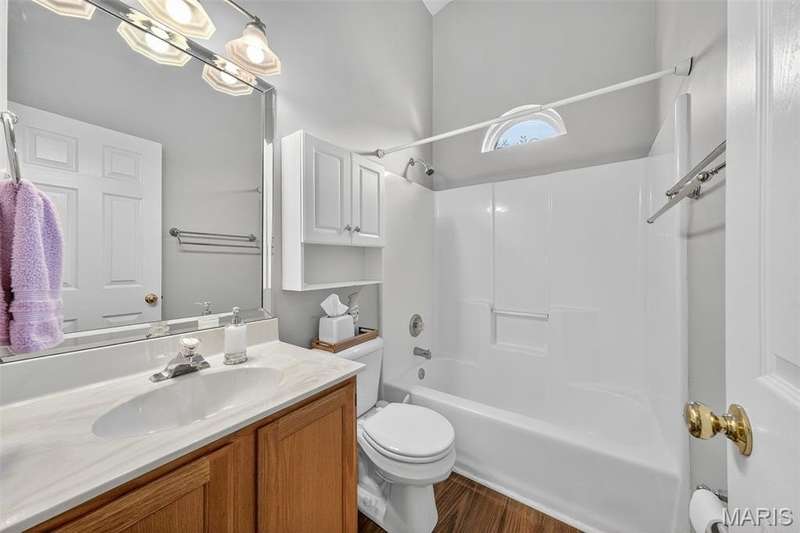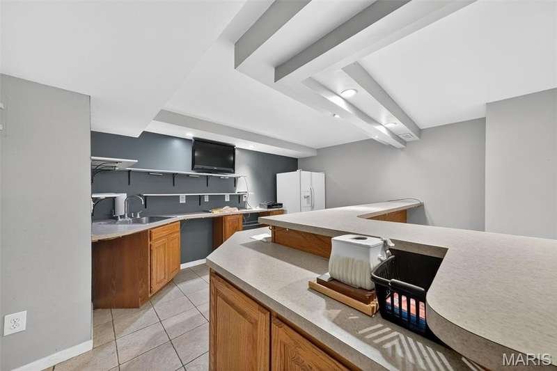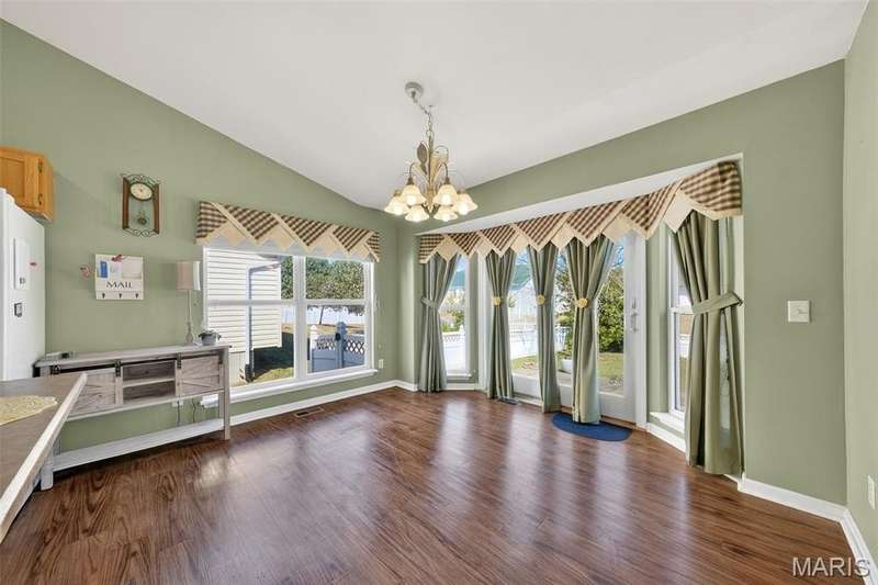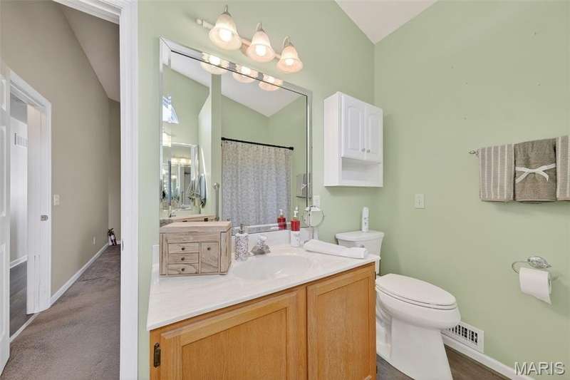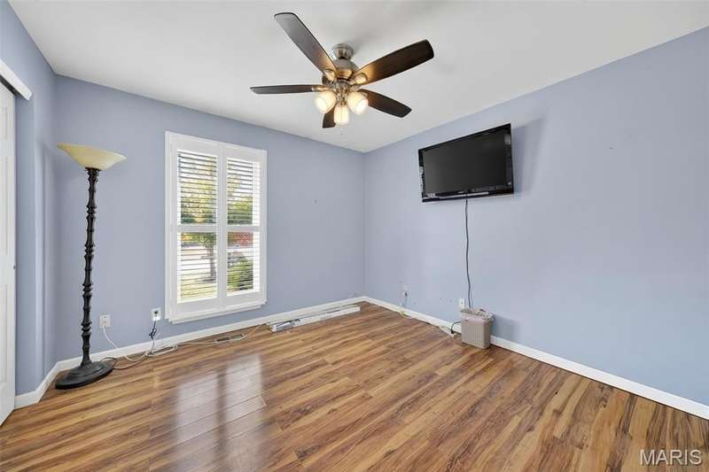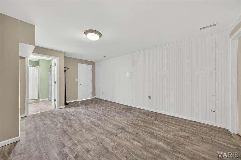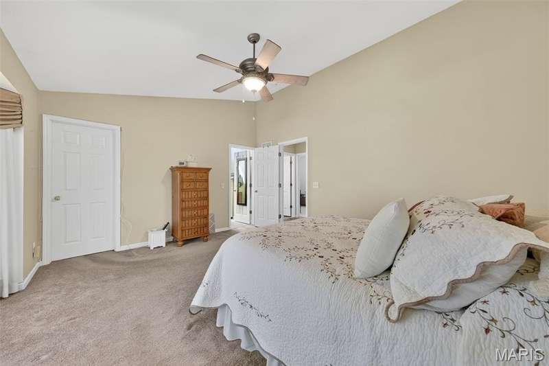 Darling ranch home with NEW: ROOF, SIDING, GUTTERS & OVERHEAD GARAGE DOOR! Relax & sip your coffee on the covered front porch. Inside, discover a bright open floor plan, a neutral aesthetic, a spacious great room with soaring vaulted ceiling, newer flooring, plant shelf, and bay window. The kitchen offers a smooth-top range, refrigerator (stays), built-in microwave, and dishwasher, with ample cabinets, breakfast bar, plenty of counter space, and walk-in pantry. The dining area has a large bay window. Retreat to the primary suite, featuring vaulted ceilings, bay window, and a large walk-in closet. The primary bath has dual vanities, and a walk-in shower. The main floor also includes two other bedrooms, a hall bath, and laundry room (washer/dryer stay). The partially finished lower level includes a wet bar (refrigerator stays), huge recreation room, full bath (w/ a new toilet), a finished bonus room with walk-in closet, and a large unfinished storage room. Enjoy family gatherings in the fenced backyard, with room for kids and dogs to play. The oversized patio is perfect for fall BBQs and entertaining. 2-car garage with opener and full drywall. Ring camera stays. Easy access to highway, shopping, dining, and all the amazing Wentzville amenities. Welcome Home!