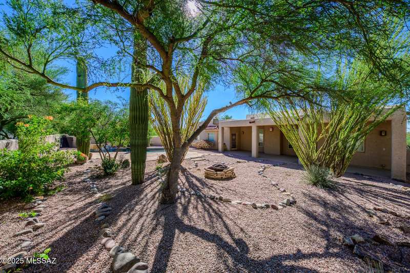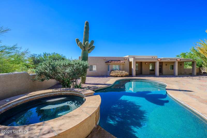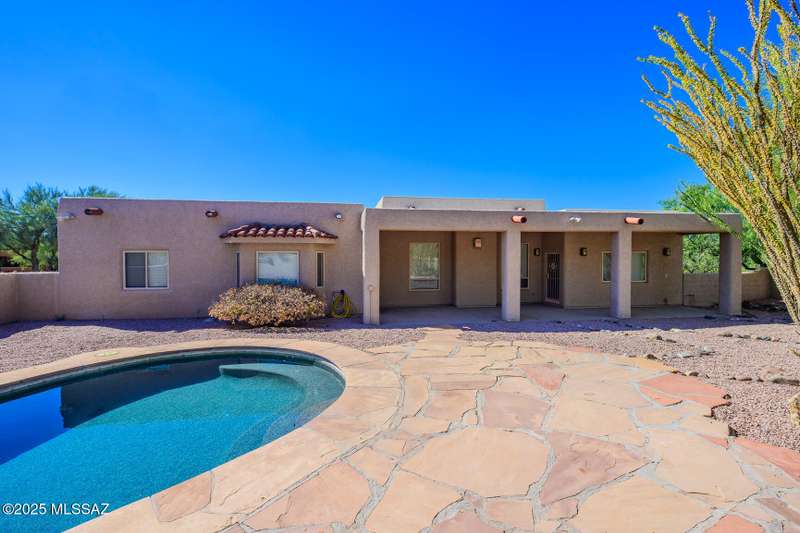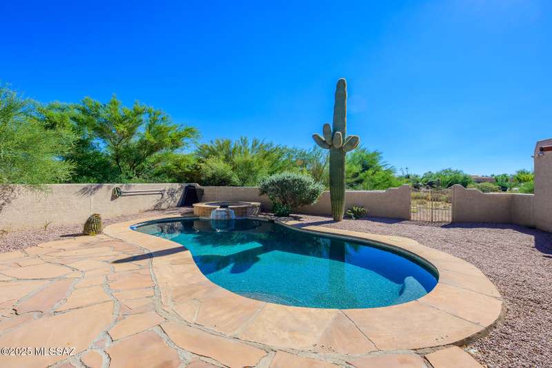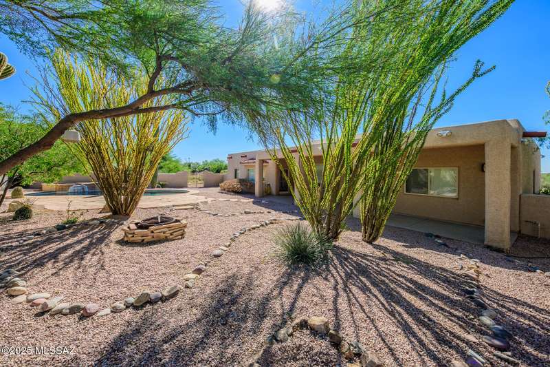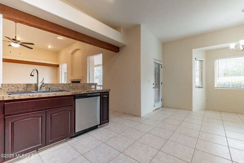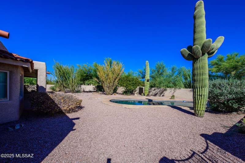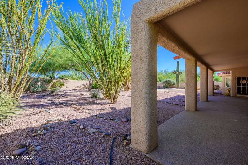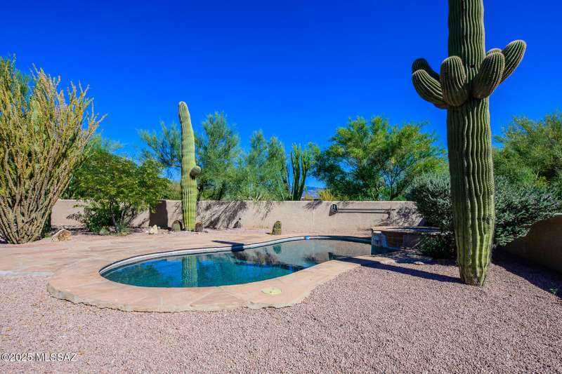 Set in the desirable Antler Crest neighborhood, this spacious 3-bedroom, 2.5-bath custom home offers a private den off the kitchen and an open great-room layout accented by dramatic wood beams, architectural pillars, and a cozy fireplace. The kitchen shines with granite counters, stainless appliances, ample upgraded cabinetry, and a bright eat-in space beneath a skylight. The primary suite includes patio access, jetted tub, separate shower, and walk-in closet. Enjoy high ceilings, ceiling fans, and blinds throughout. Outdoor living features a covered patio overlooking the sparkling pool and spa surrounded by mature, low-maintenance landscaping for privacy. Park-like desert front yard with trees and gravel adds to the curb appeal.