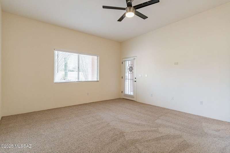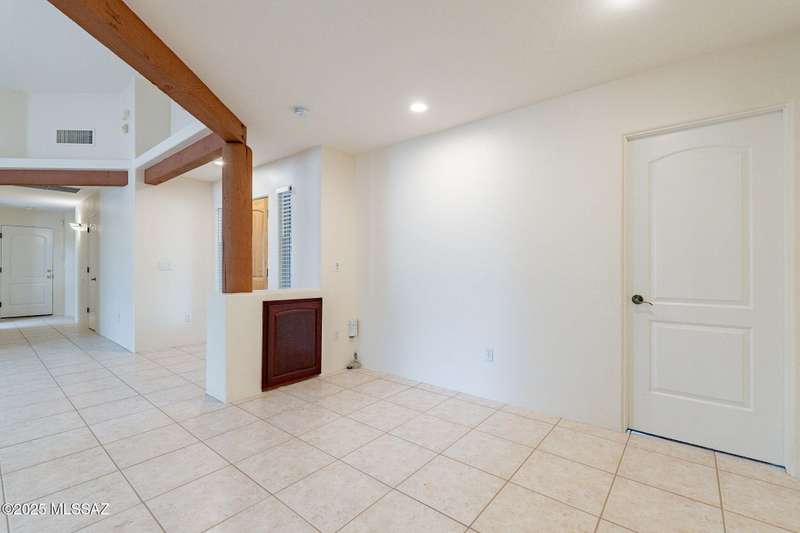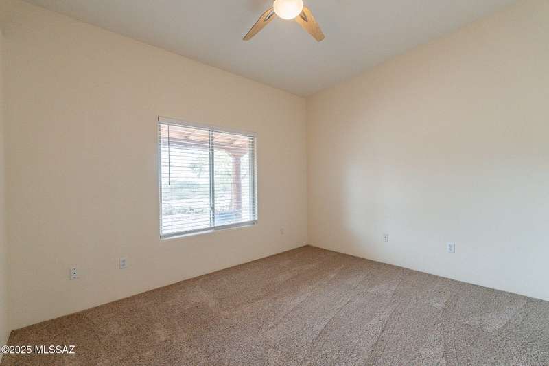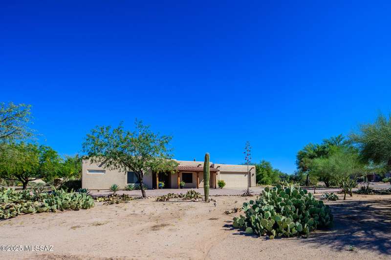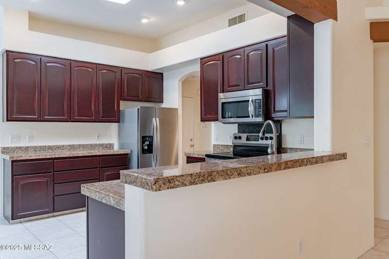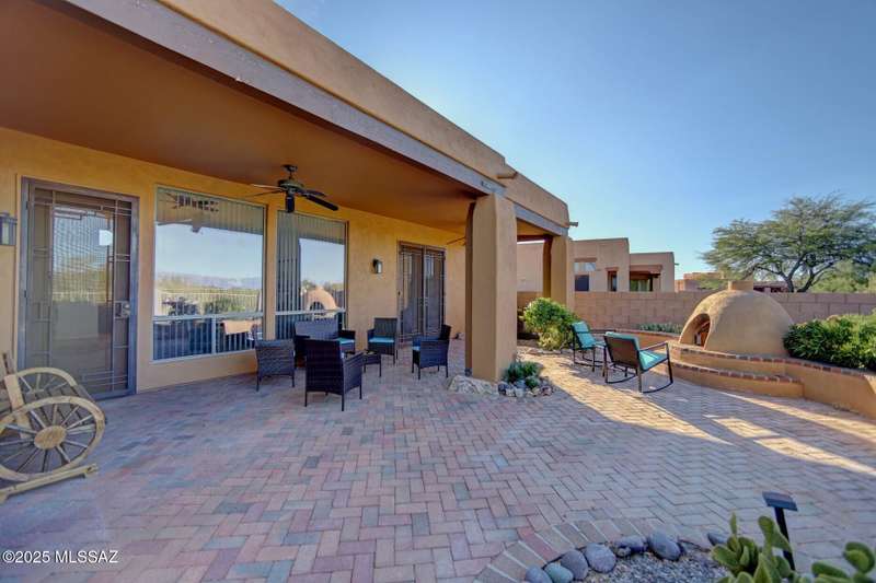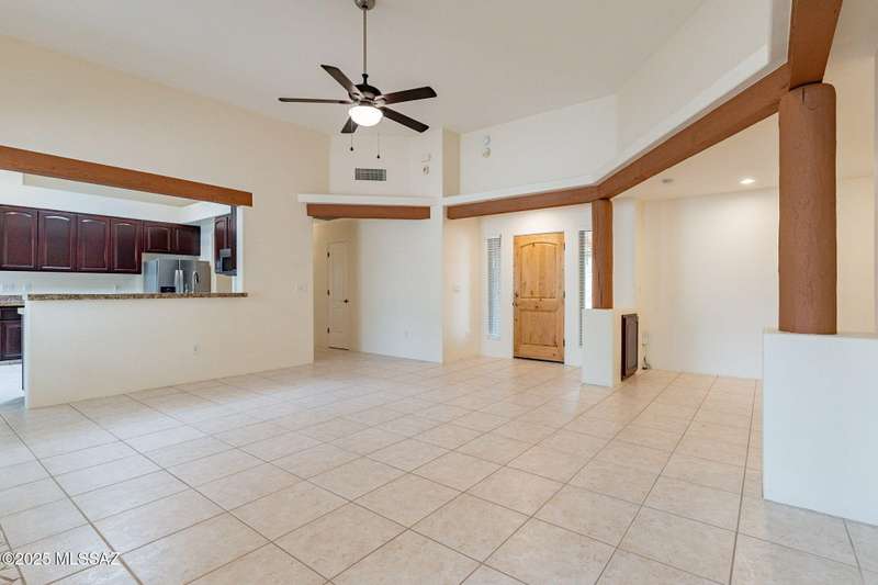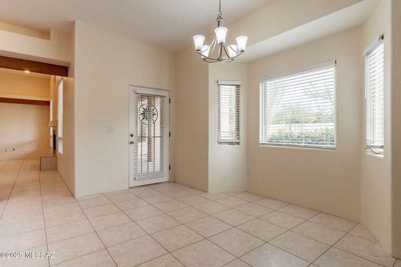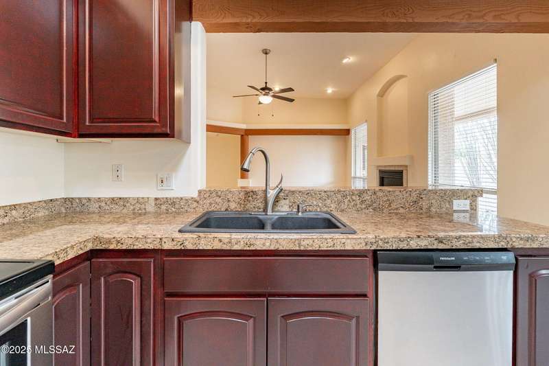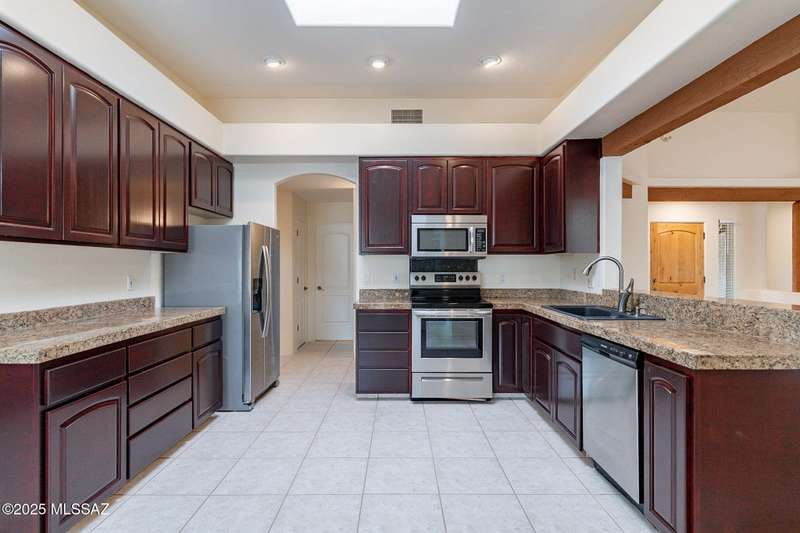 Set in the desirable Antler Crest neighborhood, this spacious 3-bedroom, 2.5-bath custom home offers a private den off the kitchen and an open great-room layout accented by dramatic wood beams, architectural pillars, and a cozy fireplace. The kitchen shines with granite counters, stainless appliances, ample upgraded cabinetry, and a bright eat-in space beneath a skylight. The primary suite includes patio access, jetted tub, separate shower, and walk-in closet. Enjoy high ceilings, ceiling fans, and blinds throughout. Outdoor living features a covered patio overlooking the sparkling pool and spa surrounded by mature, low-maintenance landscaping for privacy. Park-like desert front yard with trees and gravel adds to the curb appeal.