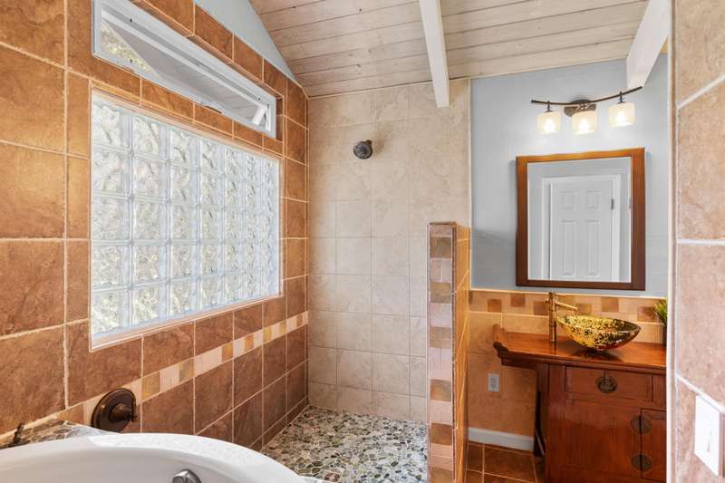 Upstairs you’ll find a 640 sf private suite featuring vaulted ceilings, walk-in closet, and a spacious balcony facing Mauna Kea. The ensuite bathroom encompasses glass koi-fish sinks, a walk-in shower, and a tranquil Japanese ofuro soaking tub. The 3 downstairs bedrooms are each unique. One with a private entrance and mountain views, another with his and her closets, and the other with its own ensuite bathroom.