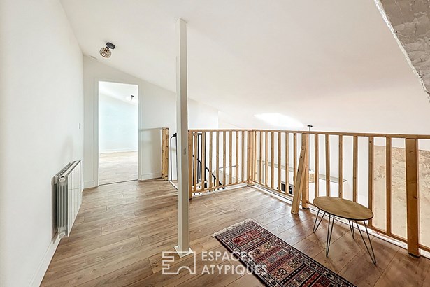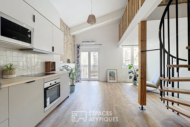 The entrance opens onto a bright living room with a newly fitted and equipped open-plan kitchen, enhanced by a stone wall that lends authenticity and character to the space. An elegant spiral staircase in metal and wood leads to a mezzanine with an office space and an open-plan bedroom overlooking the living room. A second, more intimate bedroom is located on the ground floor. The apartment also features a modern shower room with a toilet, thoughtfully placed on the same level as the living room.