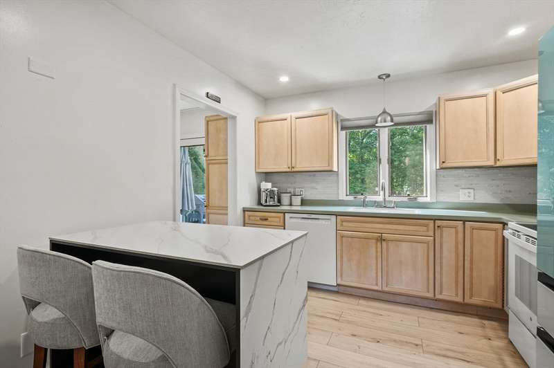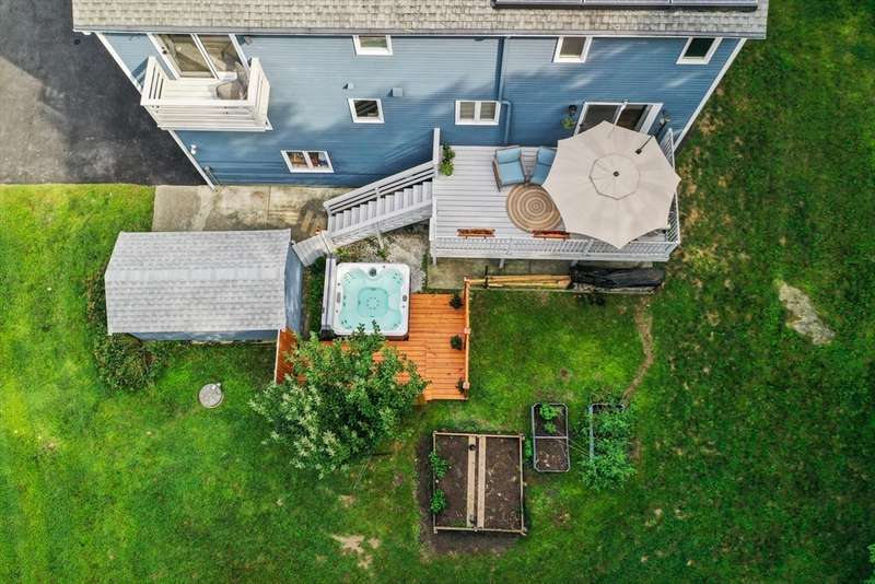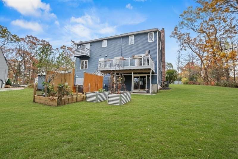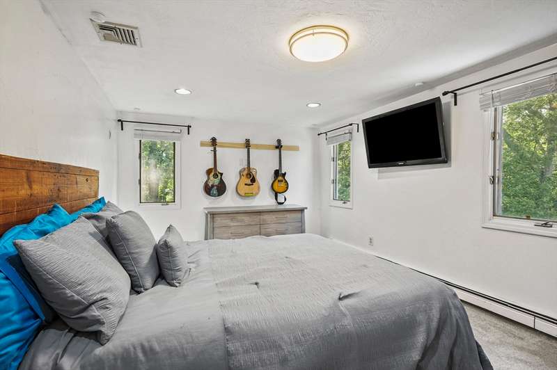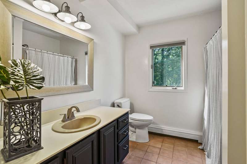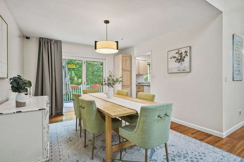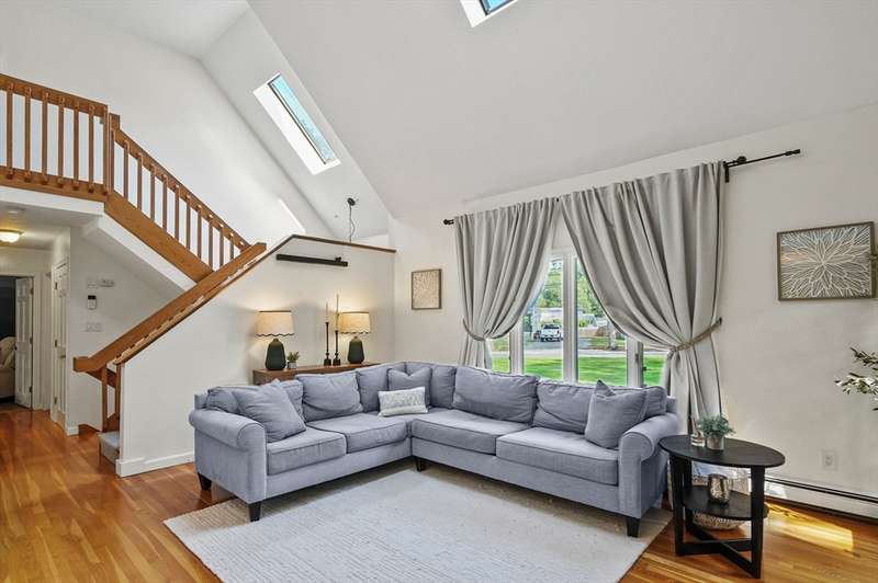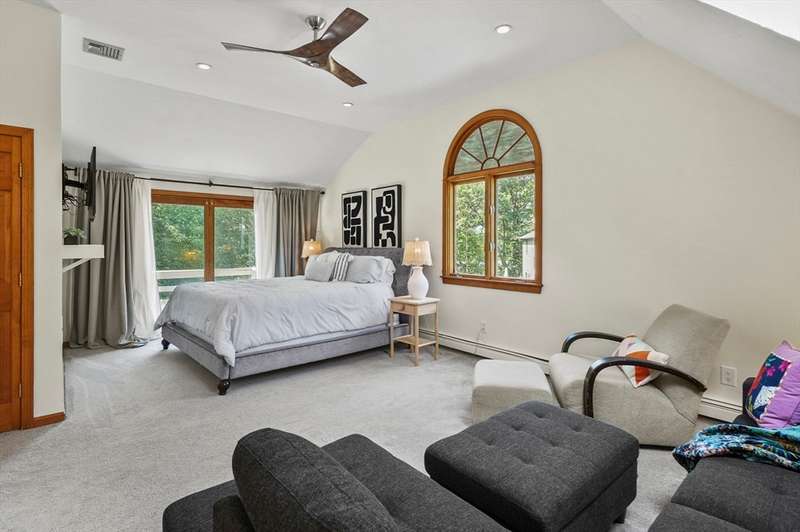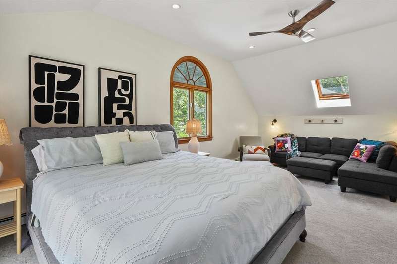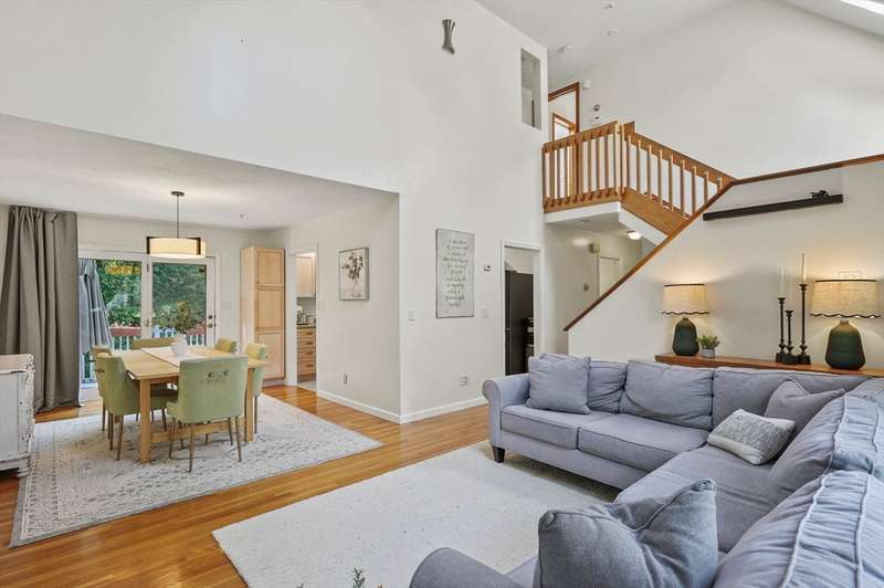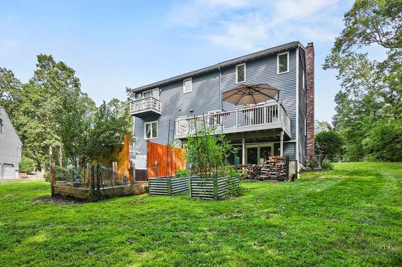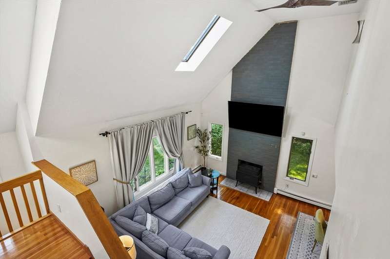 Step inside this revitalized contemporary Cape! The sun-drenched, open-concept living & dining area is spectacular, vaulted ceiling w/skylights pours in warmth & light, all complemented by a cozy wood stove. The bright dining room flows seamlessly out to the back deck. In the kitchen, you'll find newer appliances & sleek recessed lighting. Two spacious bedrooms w/ample closets & full bath are down the main hall. Upper level is a private retreat: primary suite boasts a vaulted ceiling w/skylights, walk-in closet & updated bath with modern amenities. Step onto your private balcony to unwind with the peaceful sounds of nature. 4th bedroom has multiple windows finishes this floor. The lower level offers a versatile bonus room with half bath & slider that lead directly to the backyard. Enjoy tree-lined privacy, relaxing hot tub & wooden privacy fence, storage shed, along with spacious back deck. Superbly located just minutes from conservation trails, T-station, Tufts Vet School & dog park!