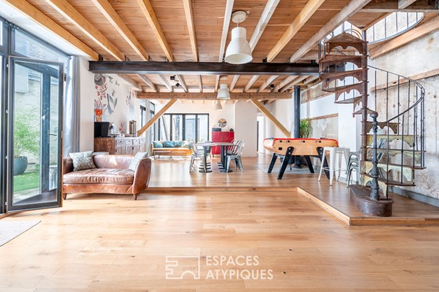An entrance hall leads to a dining kitchen, followed by a living room characterized by its extension under a light-filled veranda, providing an unobstructed view of Paris. This inviting space continues onto the green terrace, which completes the ensemble.