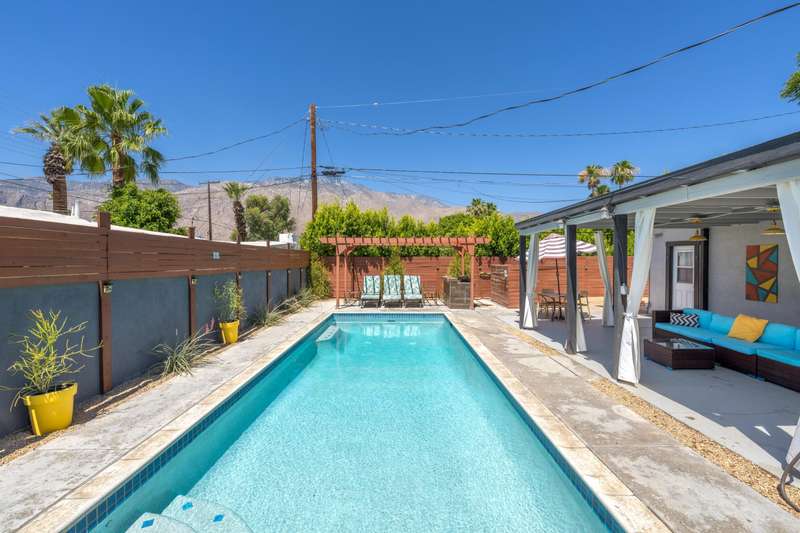 Experience the allure of Palm Springs in this charming MID-CENTURY BUNGALOW-STYLE home with owned SOLAR, nestled in the popular Movie Colony East neighborhood. Currently a successful vacation rental, this classic PS residence offers versatile living options just moments from downtown. Gated for privacy, it features an enclosed front yard perfect for pets, ideal for full-time residency, weekend getaways, or seasonal escapes. Enjoy leisurely days by the sparkling pool, perfectly positioned for maximum sun exposure and beautiful westerly mountain views. A pergola and cabana-style patio overhang create inviting spaces for relaxation. This 4-bedroom/2-bath home lives large with an updated open kitchen, breakfast bar, expansive dining/family room, and cozy living room with fireplace and French doors opening to the patio/pool area.The primary bedroom offers direct access to the pool/patio and to an updated bath. Three additional bedrooms and the two shared updated baths easily accommodate guests, with one bath and bedroom each opening directly to the patio. Additional highlights include a one-car attached garage, separate laundry room, and tile & laminate flooring throughout. Furnishings available per inventory. This is THE essence of relaxed Palm Springs living. No HOA fees!