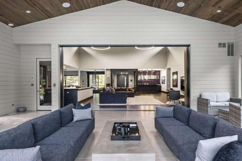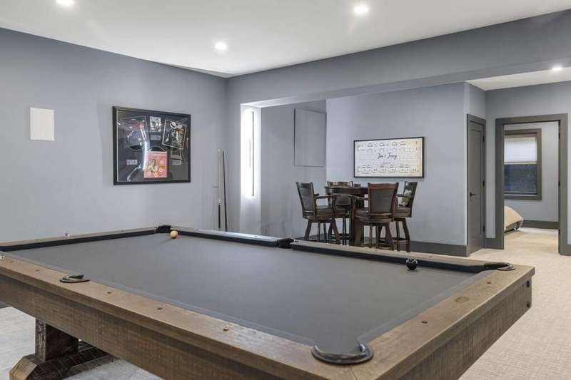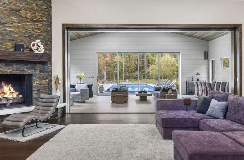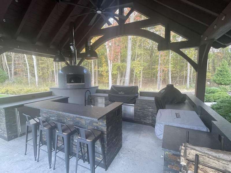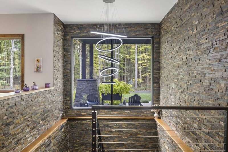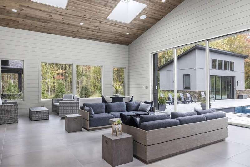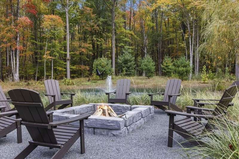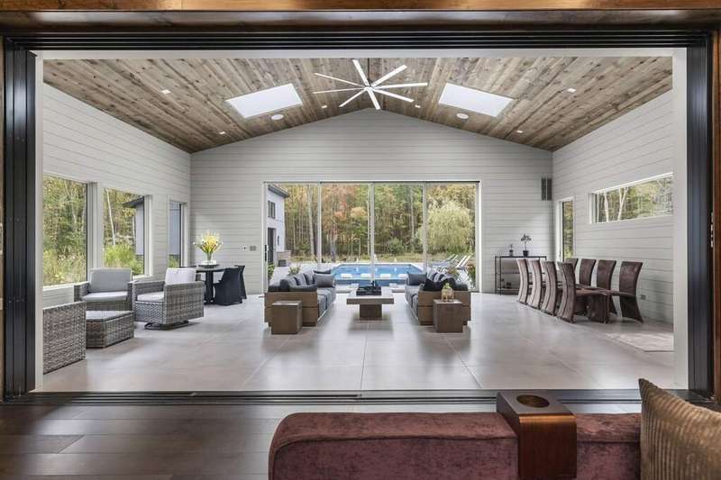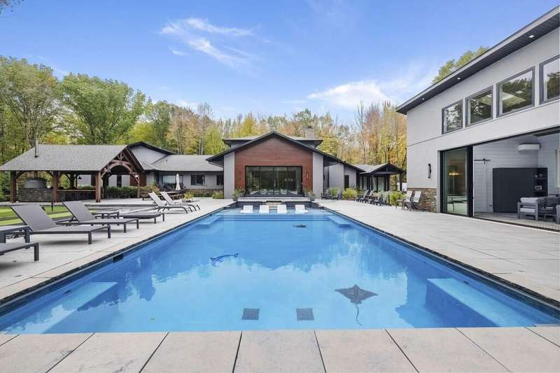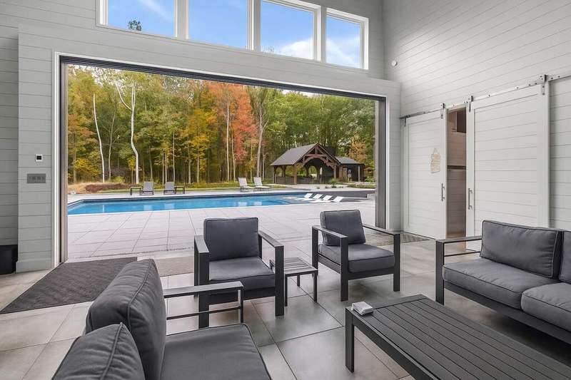 Nestled into seven wooded acres of complete privacy, this 9,828 sq ft architectural estate was designed and built as the personal residence of the Custom home builder, showcasing a level of craftsmanship rarely seen today. The 30 x 33 ft great room rises beneath 23-foot cedar ceilings wrapped with custom Cedar beams and illuminated by four circular LED fixtures. The chef's kitchen features a 17-foot island with three-inch-thick countertops, while the adjoining butler's pantry provides a second refrigerator, oven, microwave, and abundant storage. A striking live-edge Parota island conceals a hidden staircase leading to the wine cellar below. Two guest suites with private baths, an office with full bath, and a luxurious primary suite with heated floors in the bathroom, freestanding tub beside a fireplace, and steam shower complete the main level. Walls of motorized 20 x 10 ft Andersen pocket sliders connect the great room and 25 x 30 ft sunroom, extending to the 20 x 40 ft infinity-edge gunite pool with linear gas fireplace, illuminated putting green, bocce, and bean bag courts. The lower level includes a professional gym, billiard area, 4K theater with 160-inch screen and full bar. Outside, a hand-crafted Amish pavilion anchors the outdoor kitchen with pizza oven, multiple grills, bar island, and ambient lighting. A custom 18 x 36 ft pool house with full kitchen, bath, and Murphy bed completes this one-of-a-kind property.