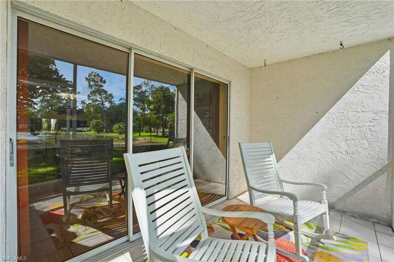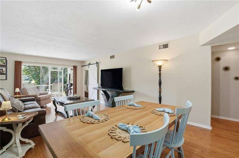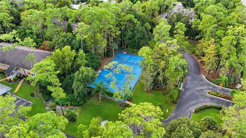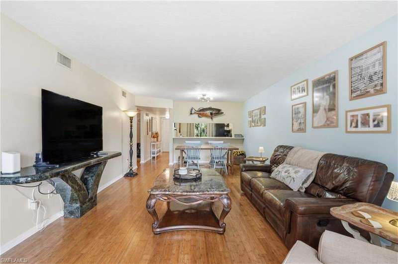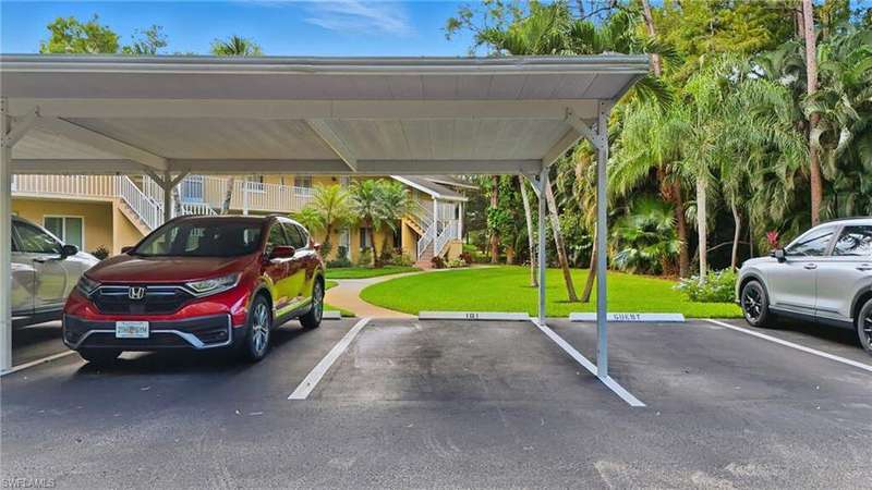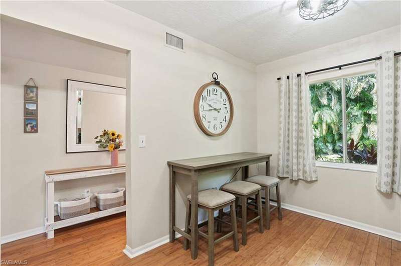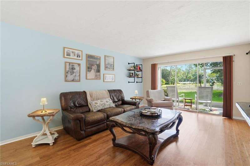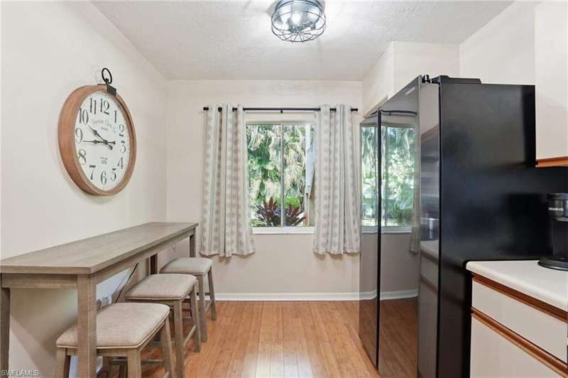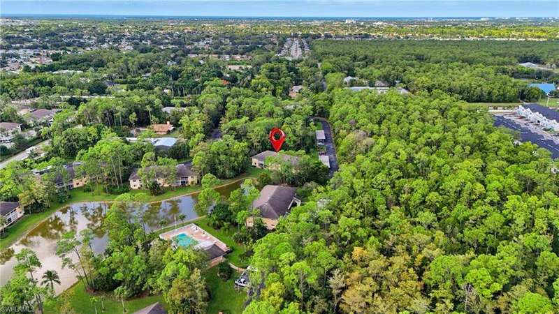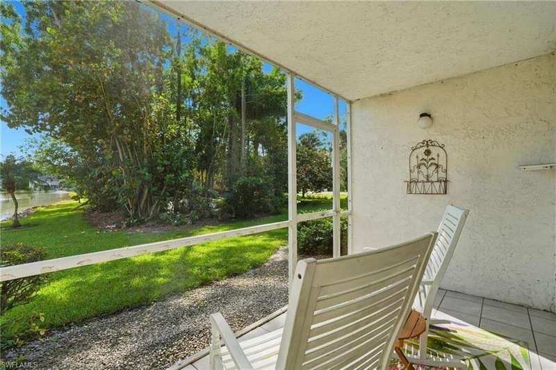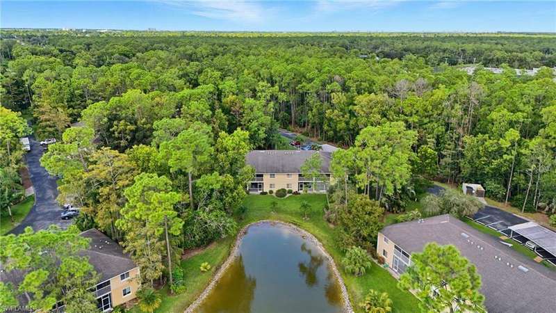 Welcome to your peaceful Naples retreat - a rare opportunity to own close to Downtown Naples and the beach at an exceptional value. Tucked in a tranquil, wooded setting with serene pond and water-feature views, this corner unit offers a private escape just minutes from the area's best dining, shopping, and the iconic white-sand shoreline. Inside, you'll find fresh flooring throughout, a refreshed kitchen appliance package, and a bright, open layout. The primary suite includes a spacious walk-in closet and en suite bath, while a dedicated laundry room with washer, dryer, and extra storage adds everyday convenience. The pet-friendly community features a resort-style pool, pickleball and tennis courts, and low-maintenance living with HOA coverage that includes flood insurance, lawn care, pest control, and water. There's one assigned parking space, plenty of guest parking, and an overflow lot available for RV, boat, or other vehicle storage (by application). This home blends a peaceful setting with unbeatable proximity to everything that makes Naples living special.