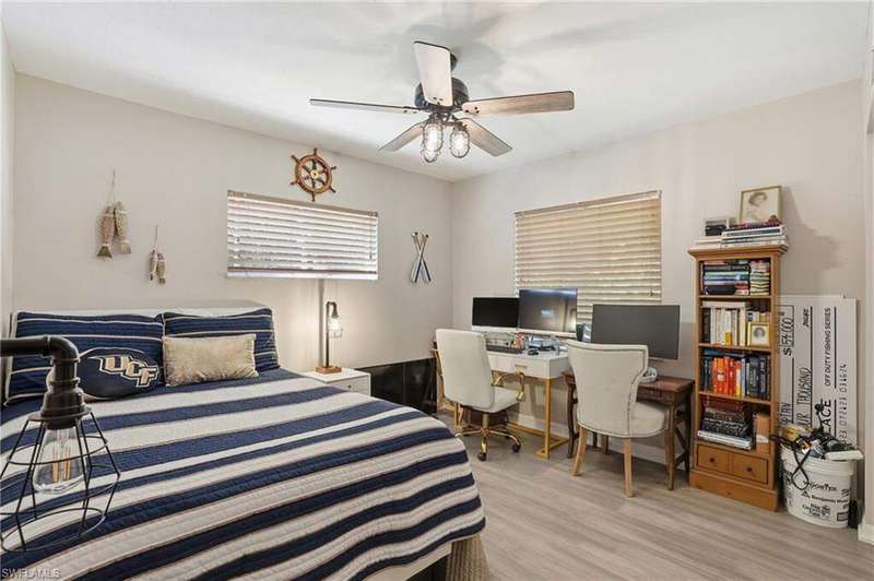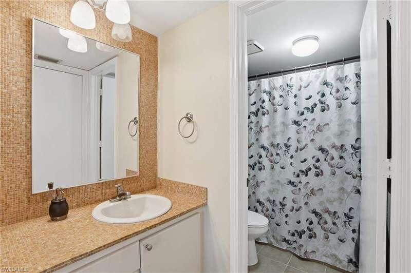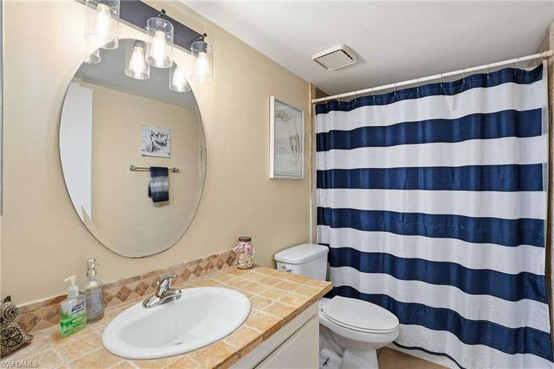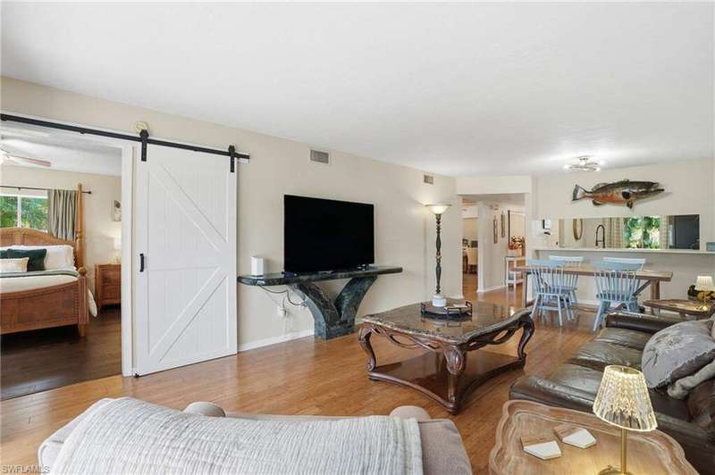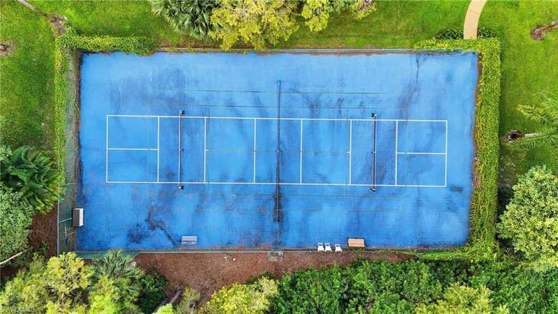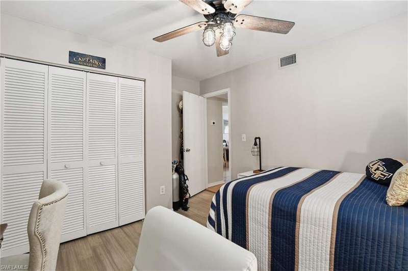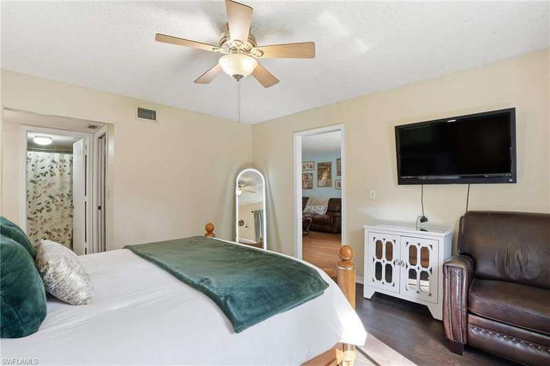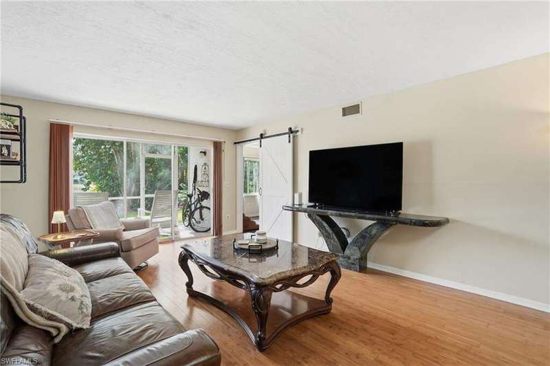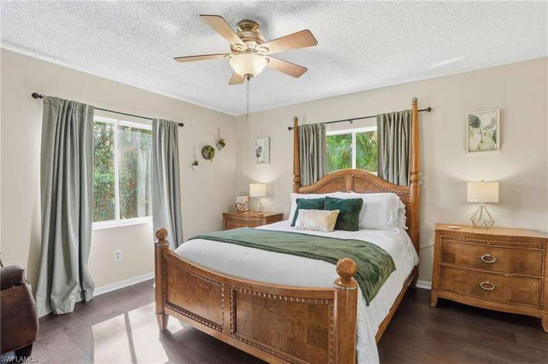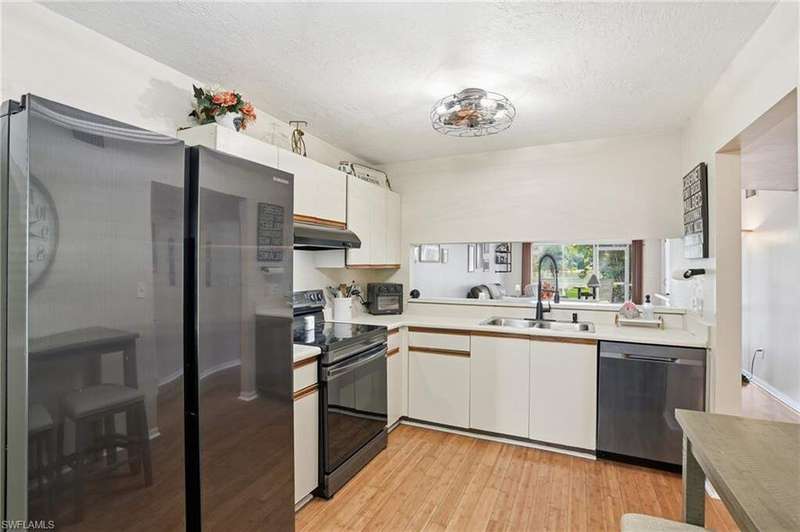 Welcome to your peaceful Naples retreat - a rare opportunity to own close to Downtown Naples and the beach at an exceptional value. Tucked in a tranquil, wooded setting with serene pond and water-feature views, this corner unit offers a private escape just minutes from the area's best dining, shopping, and the iconic white-sand shoreline. Inside, you'll find fresh flooring throughout, a refreshed kitchen appliance package, and a bright, open layout. The primary suite includes a spacious walk-in closet and en suite bath, while a dedicated laundry room with washer, dryer, and extra storage adds everyday convenience. The pet-friendly community features a resort-style pool, pickleball and tennis courts, and low-maintenance living with HOA coverage that includes flood insurance, lawn care, pest control, and water. There's one assigned parking space, plenty of guest parking, and an overflow lot available for RV, boat, or other vehicle storage (by application). This home blends a peaceful setting with unbeatable proximity to everything that makes Naples living special.