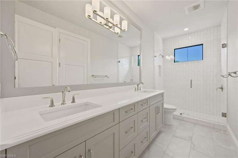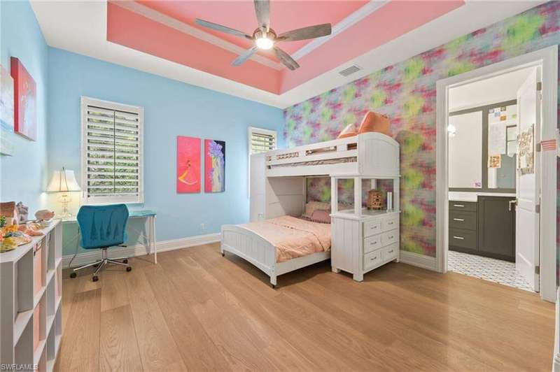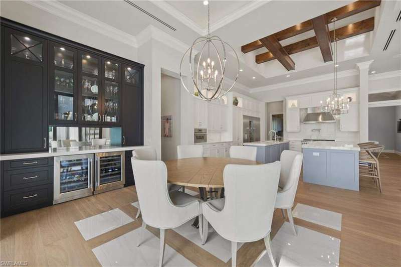 IMMEDIATE GOLF MEMBERSHIP AVAILABLE with this stunning custom home built by Florida Lifestyle. Elevated 16'1 feet above sea level and equipped with impact-resistant glass and a full-house generator, this home was meticulously designed for peace of mind and modern comfort. Every detail has been thoughtfully curated-from wide-plank Legno Bastone flooring to a 1,000-gallon propane tank, water filtration system, elevator, full security setup, and Sonos sound throughout. Beautifully furnished by Clive Daniel and Norris, this home is move-in ready for effortless Florida living. The chef's kitchen is an entertainer's dream, featuring dual porcelain islands, Thermador appliances, a wine refrigerator, and a spacious auto-lit walk-in pantry. A nearby bar area includes an additional wine fridge and seamlessly connects to the dining space for relaxed hosting.The luxurious primary suite offers a tranquil retreat with a custom ceiling accent, blackout shades, dual walk-in closets, and a spa-like bath with new shower heads and dual water closets. Two additional en-suite guest rooms are located on the main level in a split-bedroom layout, providing ultimate privacy.Take the elevator upstairs to a spacious fourth bedroom with double vanities and ample closet storage. This upper-level guest suite also features a lounge area, TV space, kitchenette, bar, and Sub-Zero wine cooler. The upstairs private screened lanai offers gorgeous golf views. On the main level, enjoy a generously sized laundry room with pull-out bins, extra cabinetry, a storage closet, and an additional refrigerator. The oversized four-car garage includes built-in storage, a refurbished four-seat "Hole In One" golf cart, and yet another refrigerator. For even more storage, a built-in mudroom with cubbies keeps everything organized. Entertain in style on the expansive lanai, featuring a beautiful wood ceiling, gas fireplace, covered lounging and dining areas, an air-conditioned pool bath, and a two-story panoramic cage. The fully equipped outdoor kitchen includes three TVs and custom drapes, creating an intimate yet chic setting for outdoor living. With western exposure and breathtaking water and golf course views, you'll enjoy glorious sunsets from the gas-heated saltwater pool and spa.This home truly has it all-style, functionality, and luxury-ready for you to enjoy the ultimate Florida lifestyle.