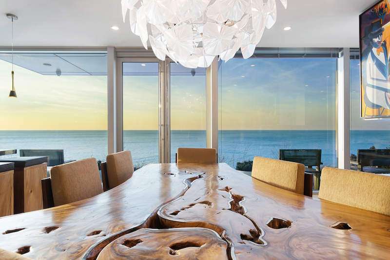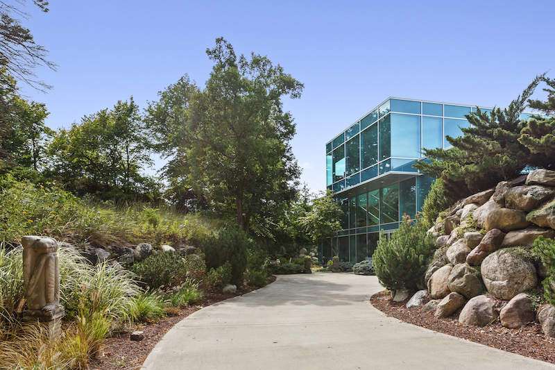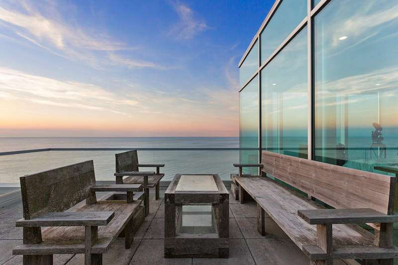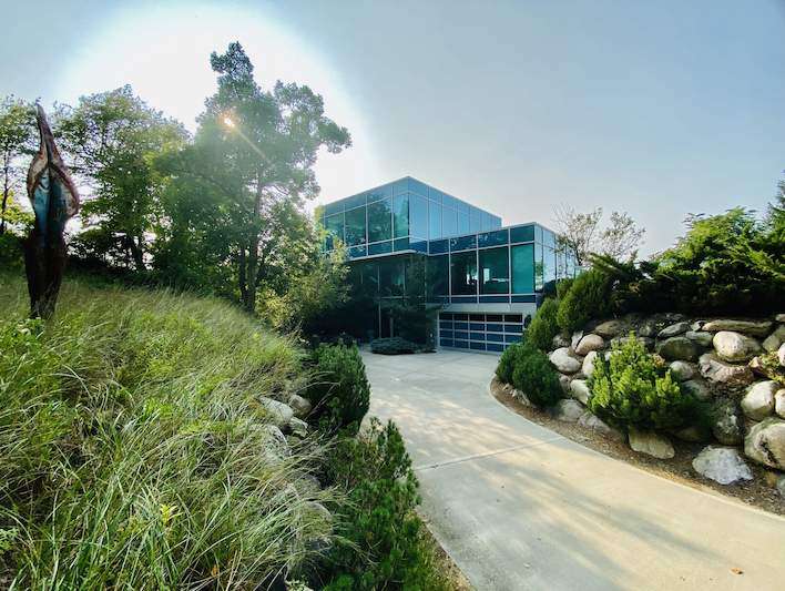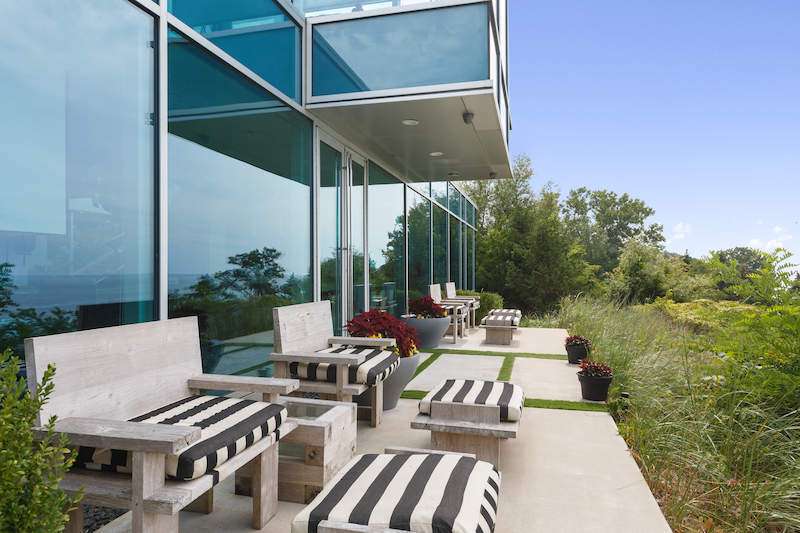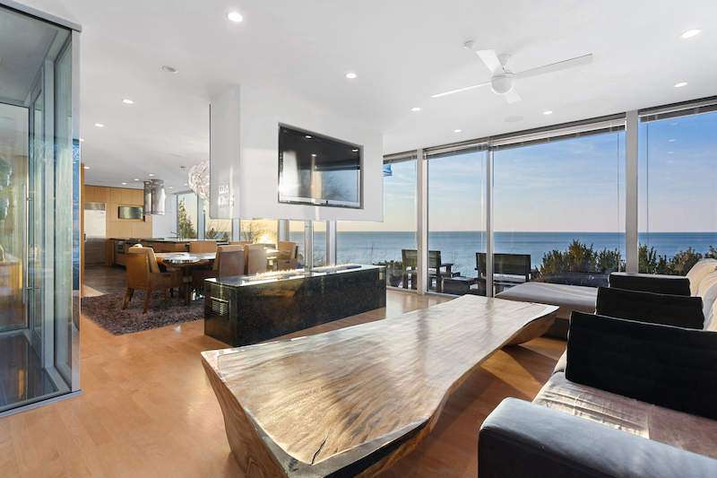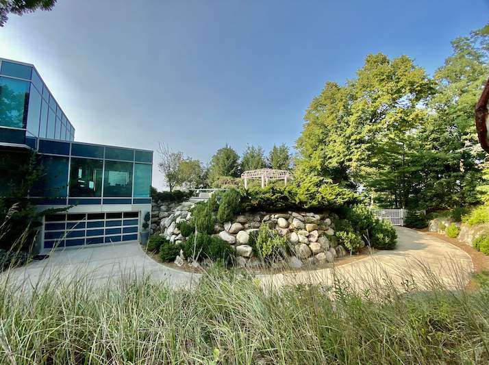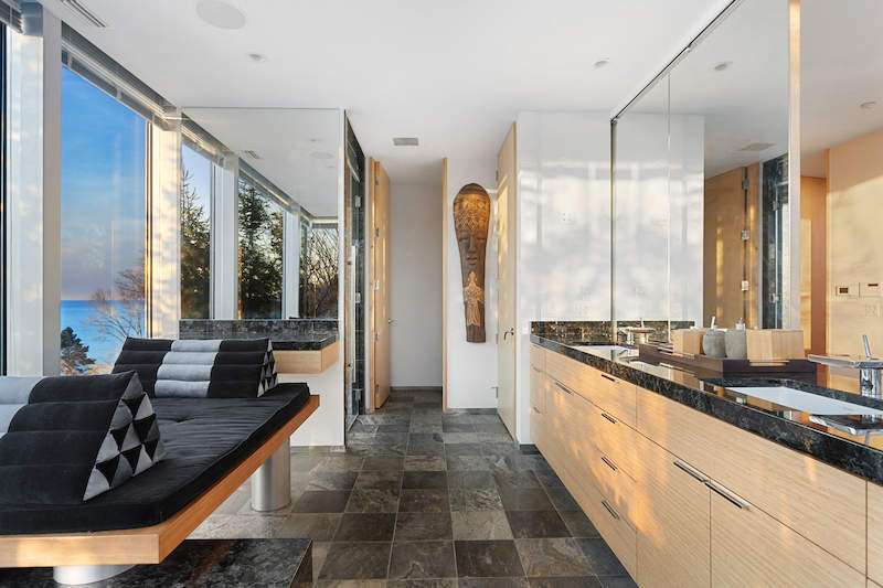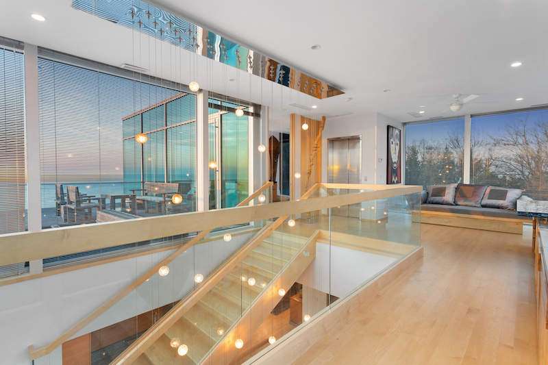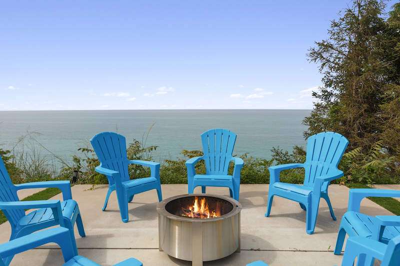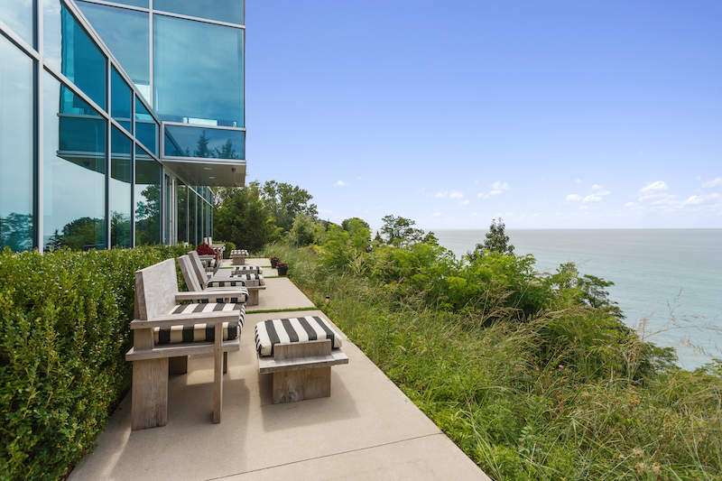 A once-in-a-generation opportunity to own one of Grand Beach's most private lakefront estates, showcasing 125 feet of unobstructed Lake Michigan frontage with mesmerizing sunset views. This is the only residence on the bluff that combines a sandy shoreline with its own natural sandbar, creating an unparalleled connection to the water. Set on nearly an acre along a secluded private road, this contemporary architectural statement is defined by clean lines, walls of glass, and light-filled interiors that seamlessly extend to the outdoors. The open-concept design highlights a chef's kitchen with Wolf and Thermador appliances, granite surfaces, and a custom walk-in pantry-all framed by panoramic views of the lake. Three finished levels are elevated by pristine ceramic flooring and are easily accessed by a private elevator, offering convenience without compromise. Every space is designed to maximize light, livability, and the extraordinary setting.