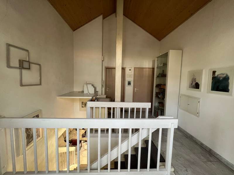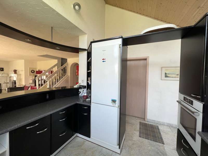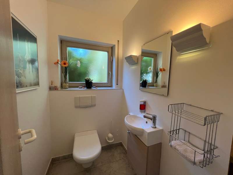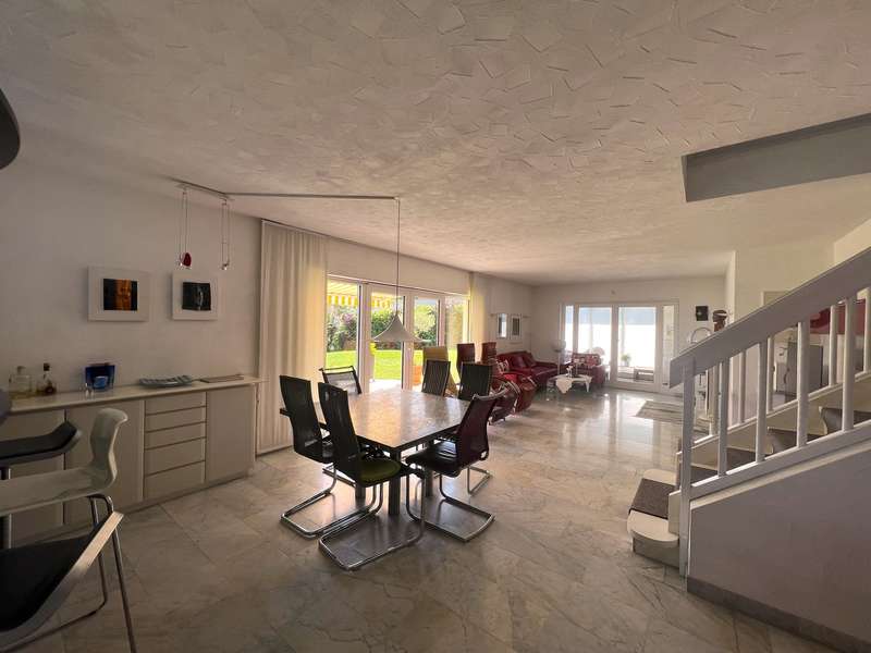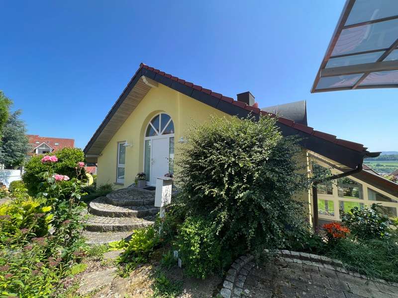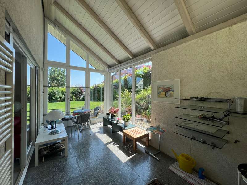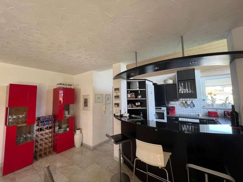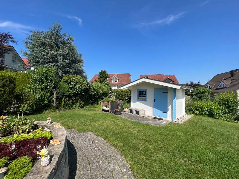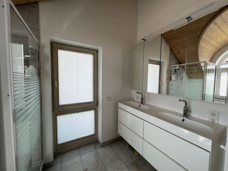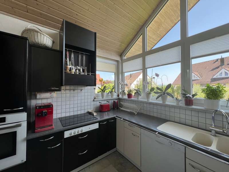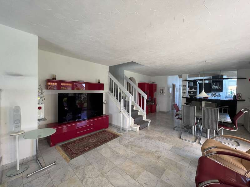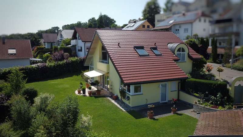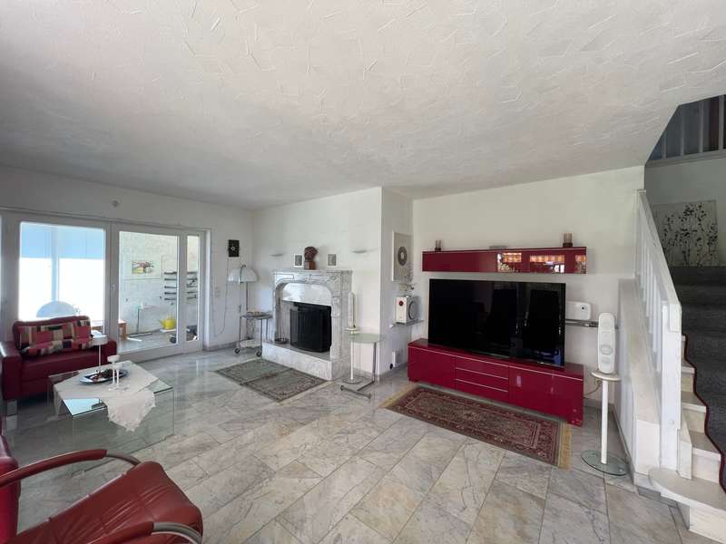 With 168.56 m² of living space, this stylish detached house in Uhingen combines spacious living on two floors with a beautiful garden paradise. A lovingly designed outdoor area with two terraces, a garden shed and plenty of space for rest, relaxation or social gatherings in the open air extends over an 887 m² plot. A double garage, a carport and two further parking spaces are available for your vehicles. You enter the house on the upper floor and first reach a spacious, inviting entrance area. Three bedrooms are accessed from here. Two of the bedrooms share a compact en-suite bathroom with shower. The master bedroom has its own dressing room, which leads directly into the spacious master bathroom with shower, bathtub, double washbasin and large mirror cabinet. The balcony with far-reaching views can be accessed via the master bedroom as well as via one of the two other bedrooms/children's rooms. The first floor then opens up into a spacious living and dining area with direct access to the conservatory, which can be used as additional living space all year round. On cooler days, the open fireplace in the living room creates a cozy atmosphere. The open-plan kitchen, including counter, blends seamlessly into the living area and is practically complemented by an adjoining pantry. Also on the first floor are a guest WC and three further cellar-like rooms, including the boiler room - ideal for use as storage, hobby or utility rooms. The house has been continuously maintained and modernized in key areas: the roof was completely re-roofed and insulated in 2021; some of the windows were replaced with modern elements in the same year. Floor-to-ceiling windows in many rooms provide plenty of light and an open feeling of space. Natural stone tiles throughout the house (excluding bedrooms) lend the living areas an elegant, timeless ambience. Underfloor heating provides pleasant warmth, which is supplemented by additional radiators in the bathrooms. Heating is provided by a gas central heating system from 1989. A home like this is best experienced in person. If you are interested, we would like to invite you to view the house. Come and see for yourself the special charm and spaciousness of this property.