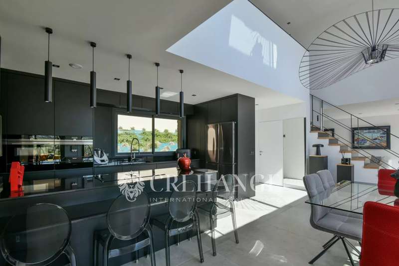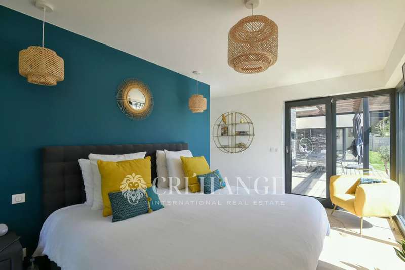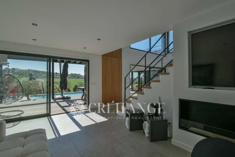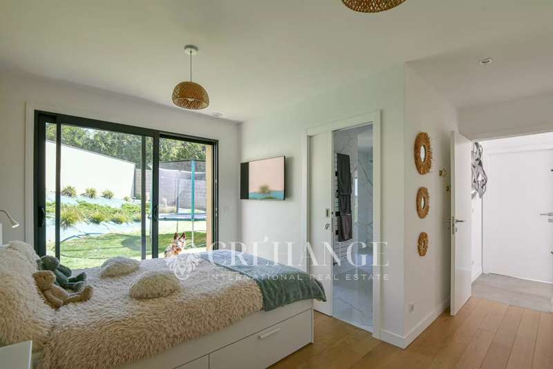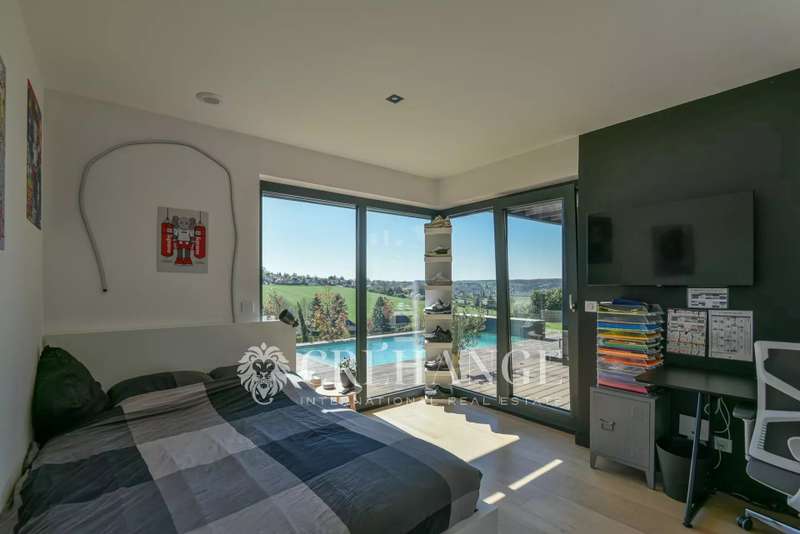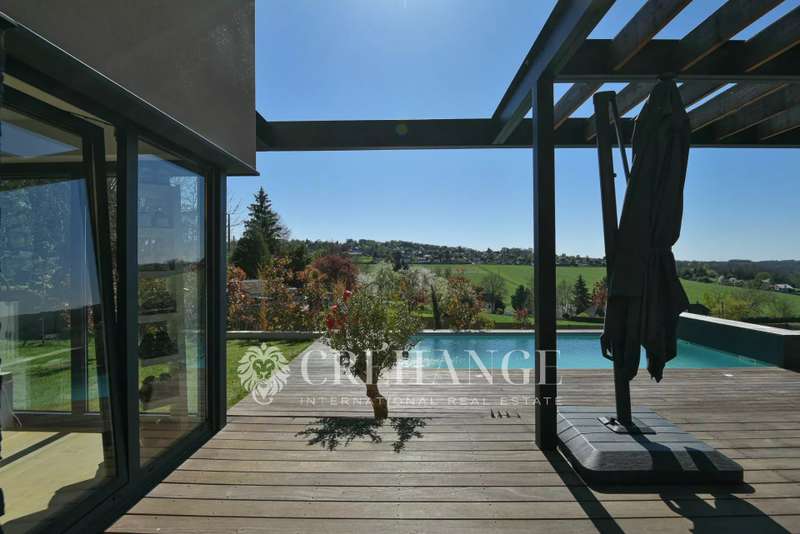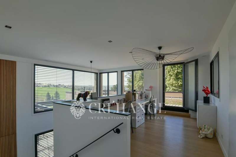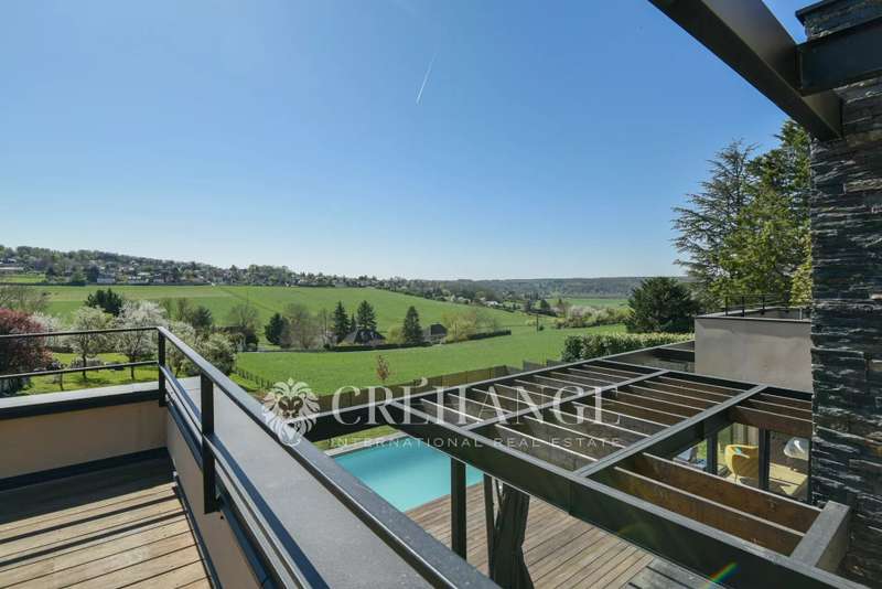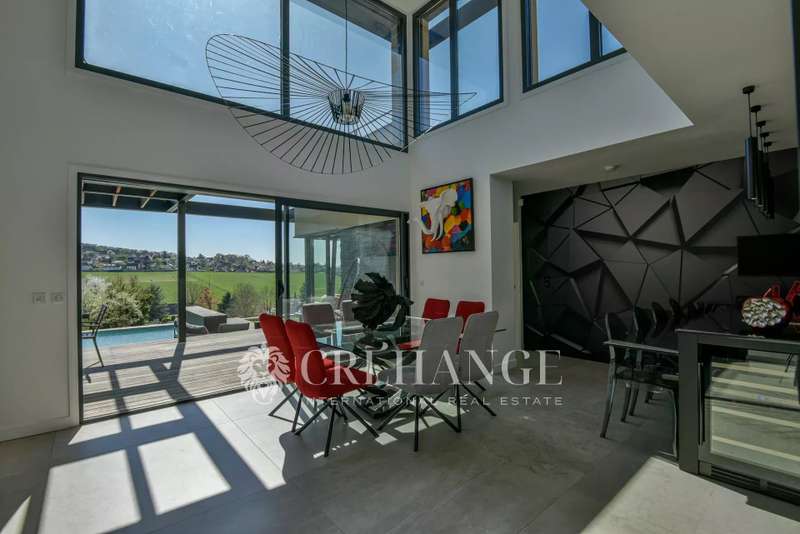 Located in Bazemont, 15 min from Orgeval, this remarkable new villa, built in 2023 on a 1825m² plot, boasts an outdoor swimming pool (8 x 4m) equipped with a solar-powered roller shutter and offers exceptional views over the surrounding countryside. You'll be enchanted by its spaciousness and luminosity, as well as by the quality of the materials used, where insulation is one of the major assets of this construction for the well-being of its owners. With a surface area of 310m² (110m² of which has been converted into living space on the lower level), decorated with refinement and spread over 3 levels, in a contemporary style, it features : On the first floor: an entrance that opens onto a living room with an ethanol fireplace, a top-of-the-range, fully-equipped kitchen opening onto the dining room creating a convivial spirit. A family area includes two children's bedrooms (one with closets, the other with dressing room) with shared shower room and toilet, and a luxurious master suite with private bathroom, toilet and dressing room. A storeroom/boiler room and guest toilet complete this level. Many rooms open onto a terrace around the pool. On the upper floor, a vast mezzanine converted into an office offers a peaceful workspace leading to a second suite with private shower room, toilet and two exclusive terraces. On the lower floor, a genuine leisure area is full of pleasant surprises: multiple, well-thought-out storage spaces, a laundry/laundry room, a spacious dressing room and areas dedicated to leisure and relaxation: games room, gym, home cinema and an additional bedroom. A workshop and pool room complete this level. Outside, a spacious garage can accommodate two cars, a motorcycle and bicycles. Additional parking is available for guests. The very latest equipment has been integrated for optimum living comfort: underfloor heating throughout the house via a heat pump, double-flow ventilation (first floor and 1st floor) and single-flow ventilation (basement), aluminum joinery, electric blinds, automatic watering, automated gates, Somfy home automation and fiber optics. 15 minutes by car from Orgeval motorway access to the A13/A14 for Paris and 10 minutes from Aubergenville/Elisabethville train station, with direct access to the future RER E, which will link La Défense in less than 40 minutes by 2027. Primary school in the village and school pick-ups for collège in Maule and Lycée in Aubergenville. Information on the risks to which this property is exposed is available on the Géorisques website https://www.georisques.gouv.fr