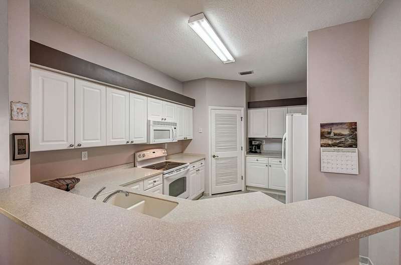 SPOTLESS 3BR/2BA END UNIT FULLY FURNISHED & SHOWS LIKE A MODEL AT BELLE HAVEN, a beautifully landscaped, gated community in very convenient location! Spacious open floor plan end unit with 1,520 sq.ft. offers additional privacy and extra windows for plenty of light. Super nice furniture & furnishings convey with this condo, if needed. Huge kitchen with lots of counters, cabinets & walk in pantry. Enormous dining room and living room lead to 14 ft screened porch that has its own private entrance. Huge owner suite with large walk in closet & bathroom with double vanities & walk in shower. Split bedroom plan has 2 more bedrooms on other end of condo. Utility room just off large 7x11 foyer. Lots of closet & storage space. Community clubhouse includes pool & fitness center offering lots of community activities. Clubhouse sits on a serene, peaceful, gorgeous lake. 4 minutes to Publix shopping center; 10 minutes to Crescent Beach & 15 minutes to historic downtown.